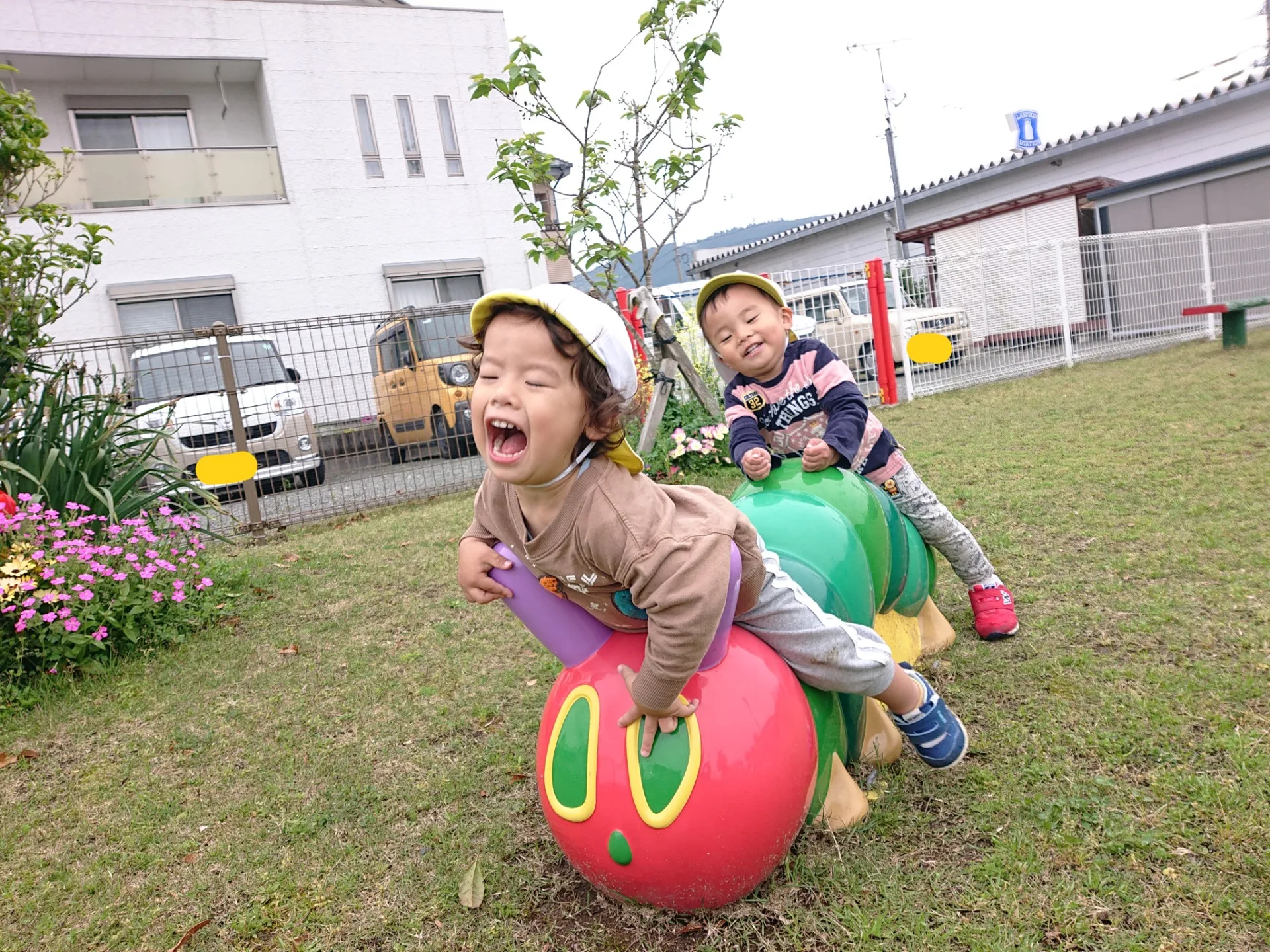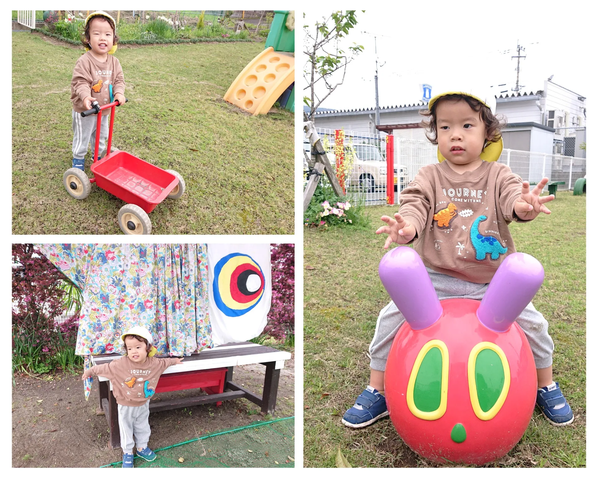 今日は広場で遊びました。広場には大きなこいのぼりが泳いでいて、触れたり隠れてみたりして楽しんでいました。その後も、仲良く関わって遊ぶ姿が微笑ましかったです♡