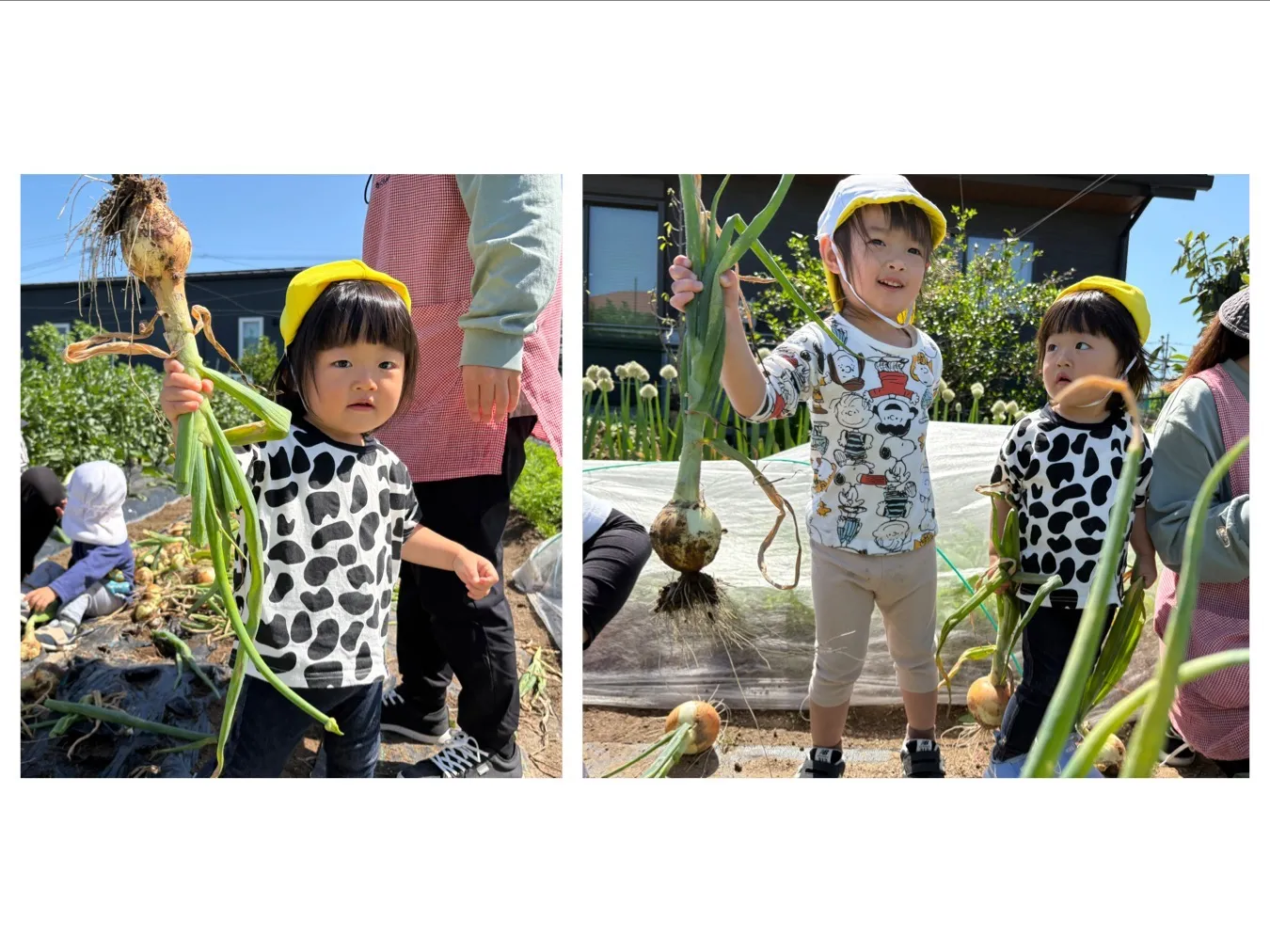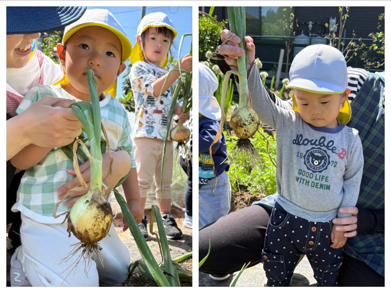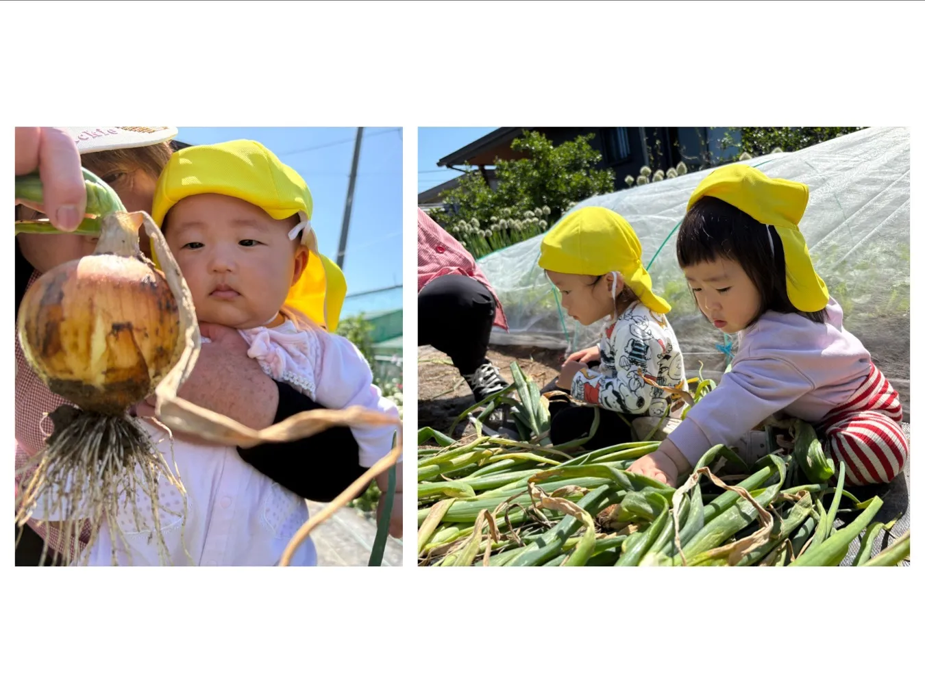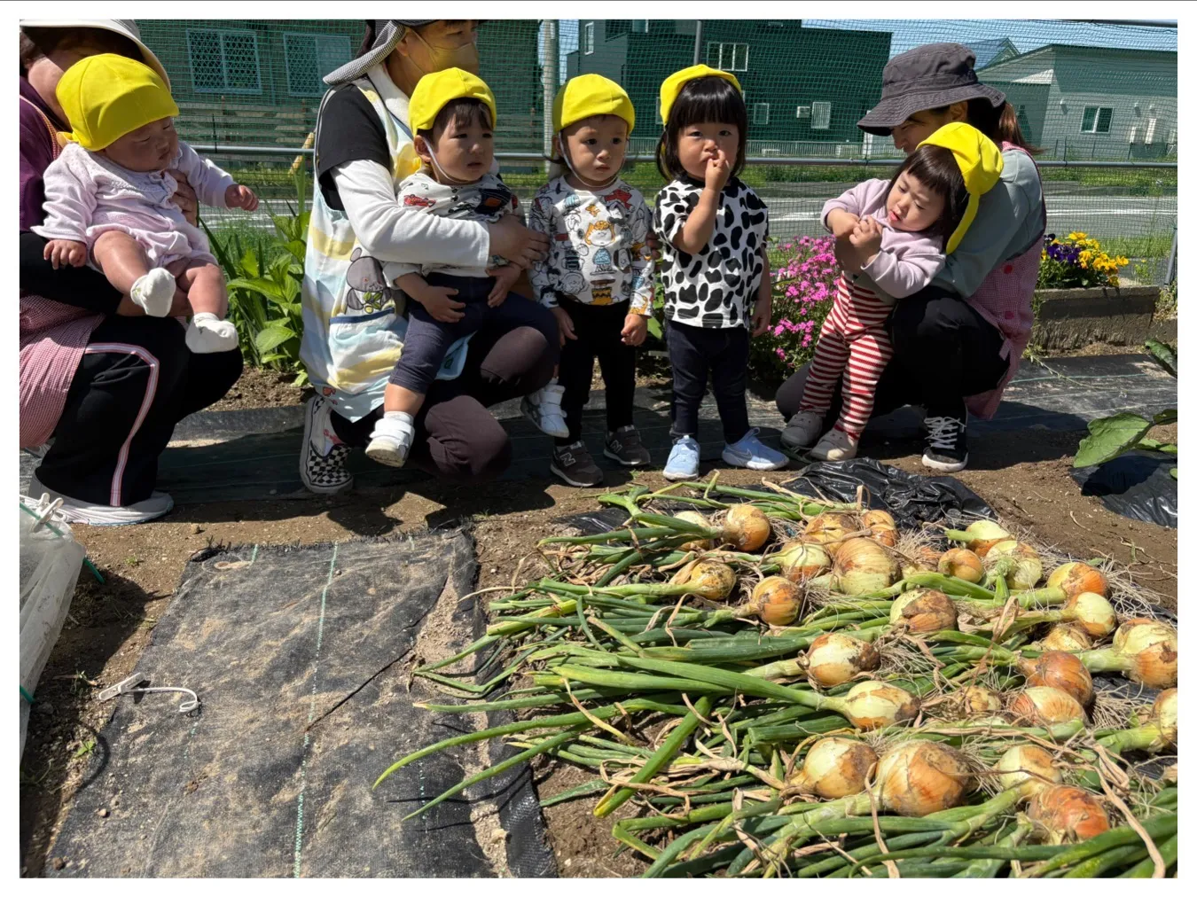今日は、にこにこ菜園のタマネギ収穫をしました。新入園児さんは初めての体験だったお友達がいると思いますが、興味深く玉ねぎをみたり土を触ってみたりしていました。玉ねぎが抜けたときには「やったー!!」とみんなで大喜びして楽しみました。頑張って収穫した玉ねぎはお家にお持ち帰りしますよ。どんなお料理に変身したかお知らせしてくださいね。