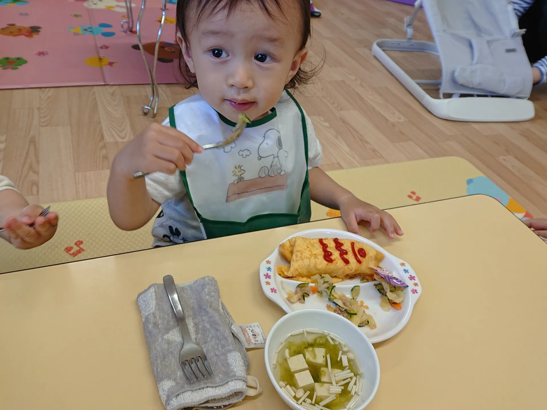 もうすぐこどもの日ですね!子どもたちは、広場のおおきなこいのぼりさんのように元気いっぱい遊んでいました。そして、給食はこいのぼりオムライスでした🎏かわいいこいのぼりオムライスをおいしそうに頬張るいちご組さんでした😋