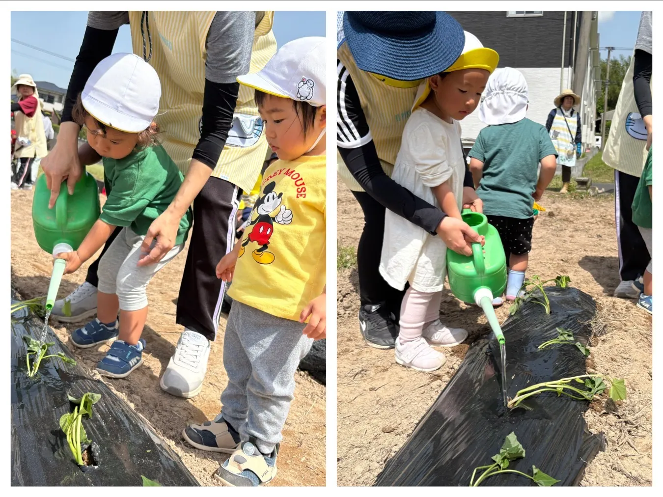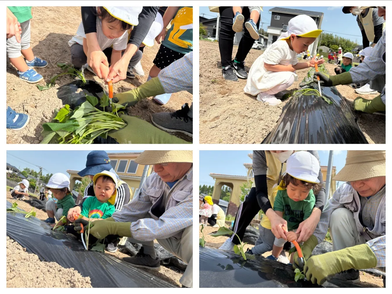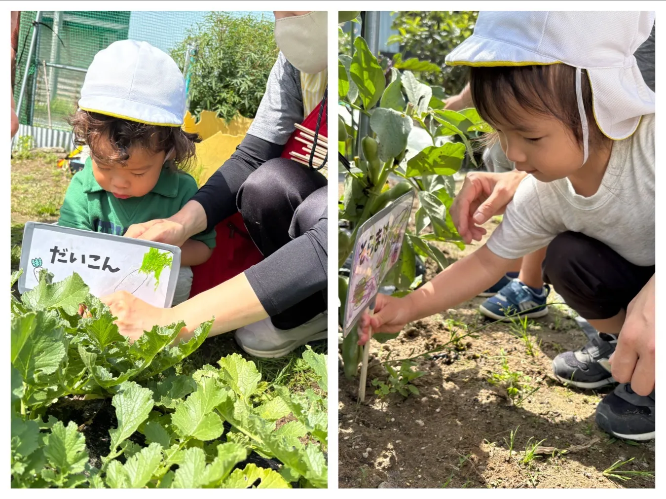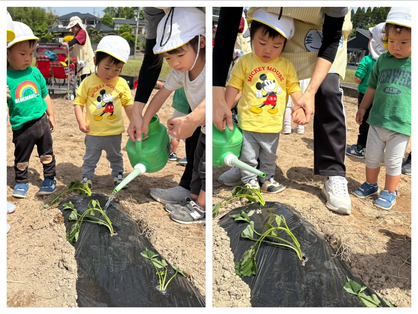 今日は、菜園にみんなで作った野菜のお名前カードを立てに行きました。野菜を確認しながらお名前カードを立てると、にこにこ菜園の野菜たちが嬉しそうで、菜園も素敵になりました。その後は畑にお芋の苗を植えました。先生と一緒に土の中にググッと苗を入れ込む顔は真剣そのものでした。とてもいい経験が出来たと思います。