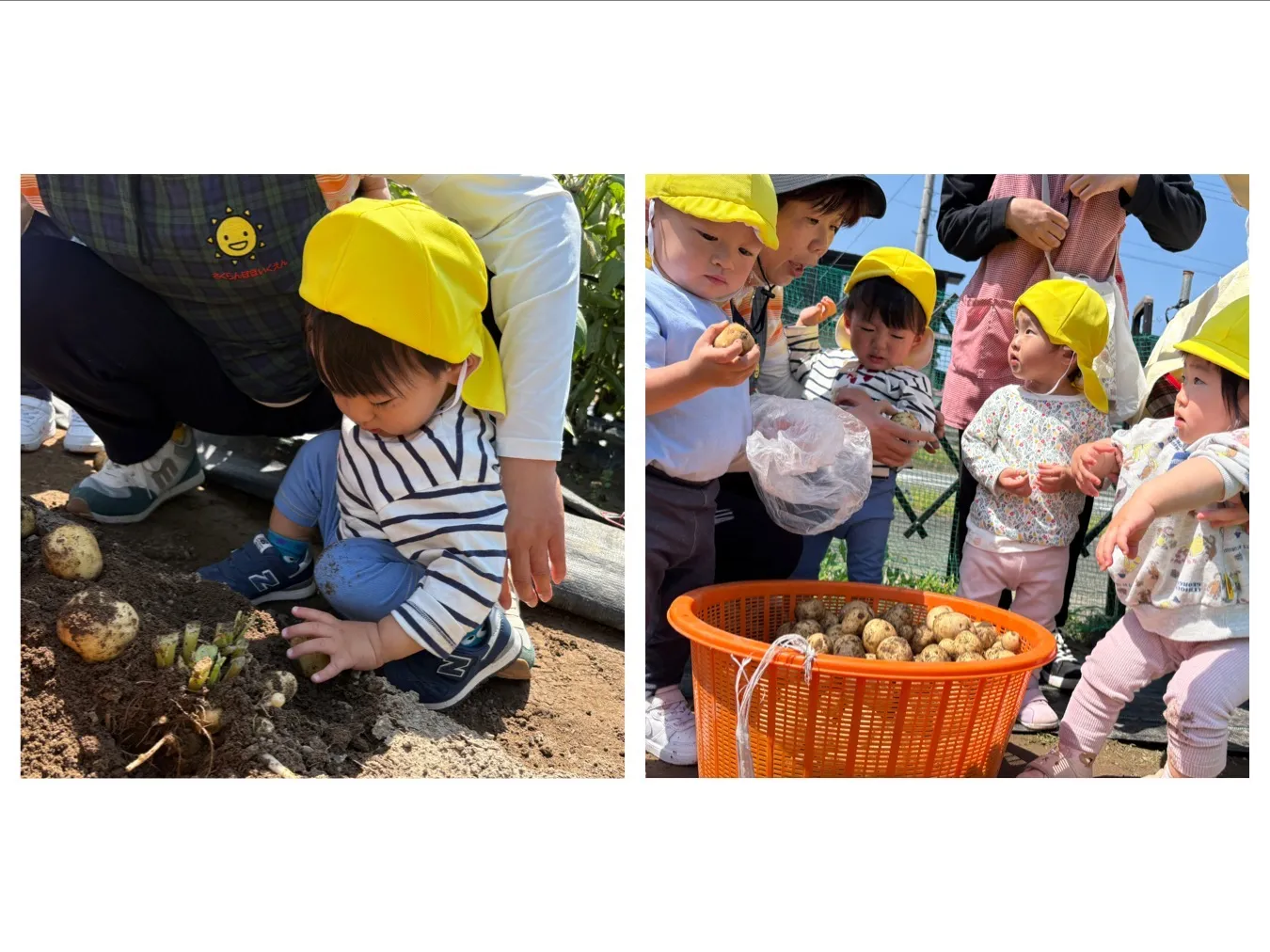 今日はにこにこ菜園のじゃがいも収穫をしました。やわらかい土を一生懸命掘り進めていくと、土の中からきれいなジャガイモが顔を出してくれて、子どもたちは嬉しそうに掘り出していました。ご家庭に持ち帰る沢山のじゃがいもが、何に変身してくれるのか楽しみです。さくらんぼ保育園でも給食やおやつに使って美味しくいただこうと思います。