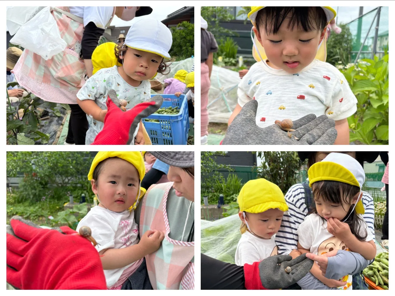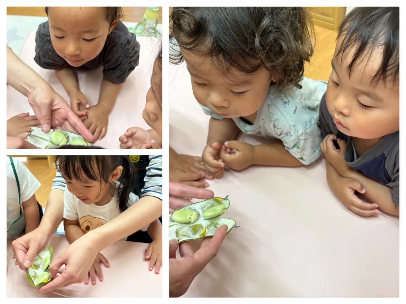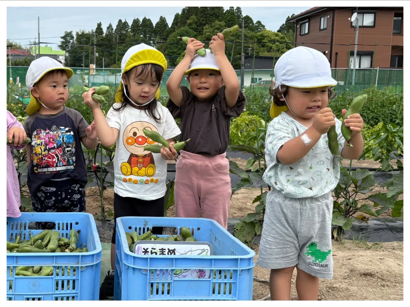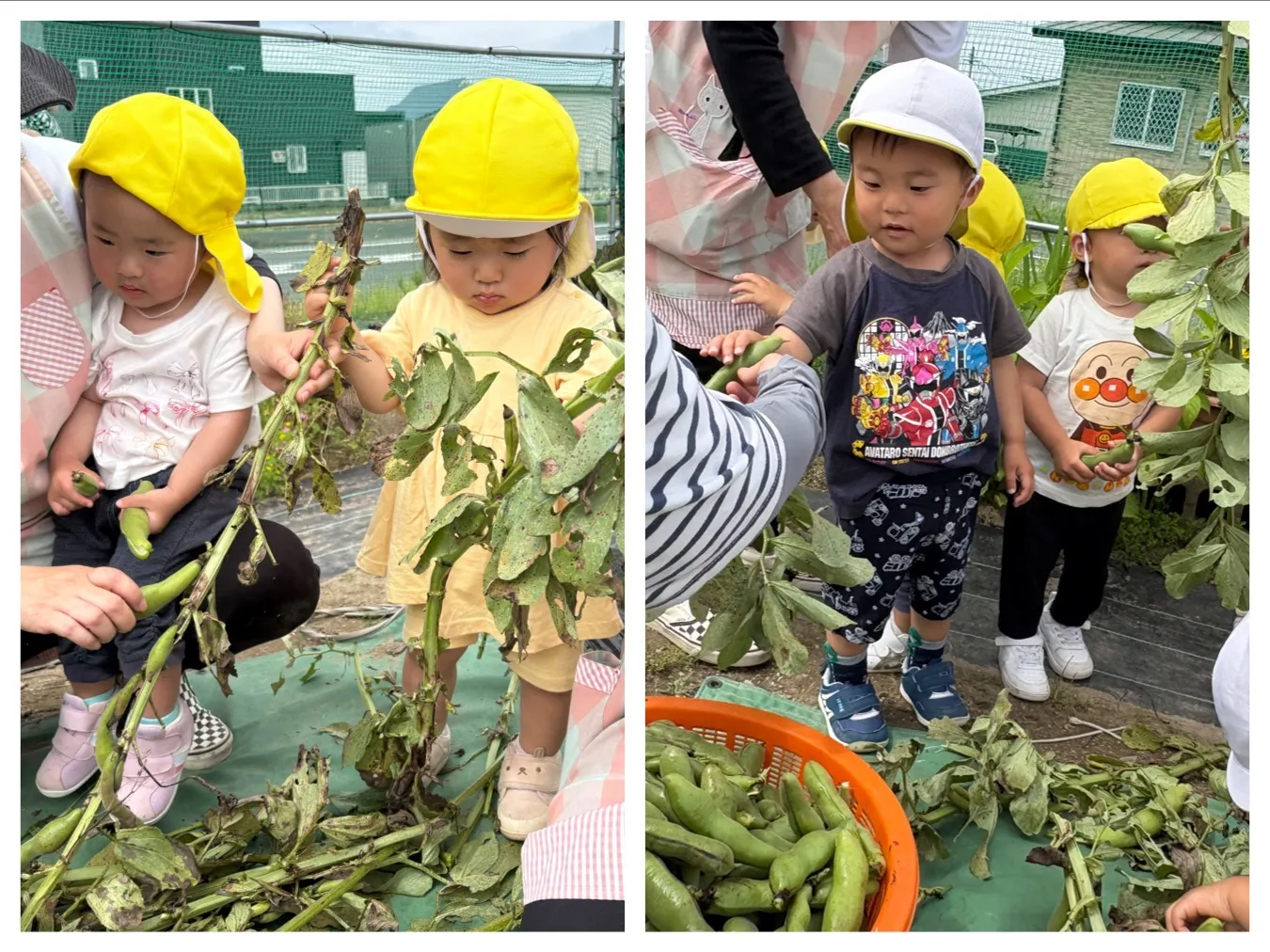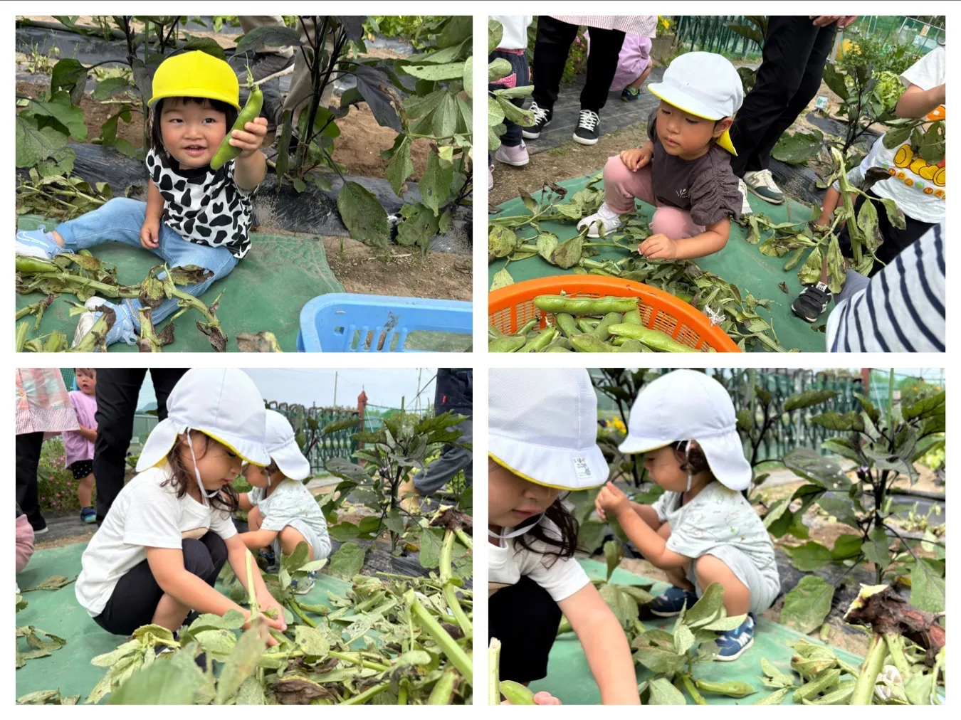 今日はそら豆収穫をしました。子どもたちの顔より大きいそら豆を力いっぱい茎から引っ張ってとっていました。収穫したそら豆はお家に持ち帰ります。そら豆が入っている部分はお母さんのおなかの中のような柔らかいふわふわしていると思いますよ。ぜひ子どもたちと一緒に皮むきをして中の観察をしてみてくださいね。