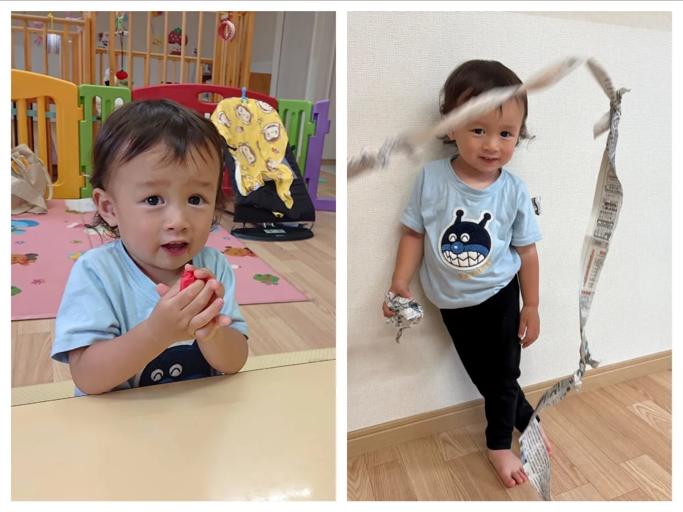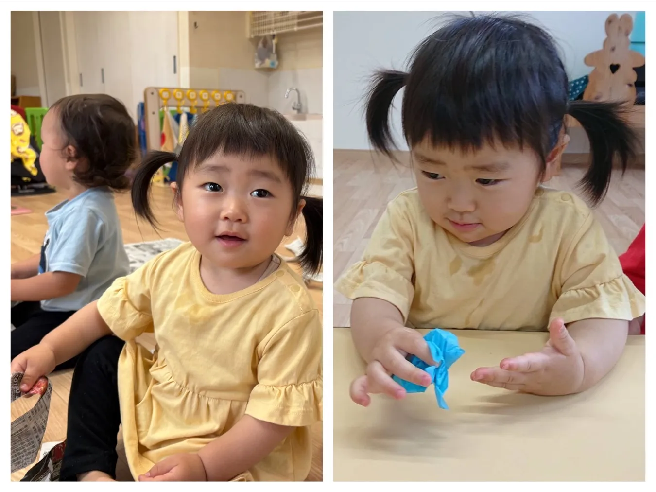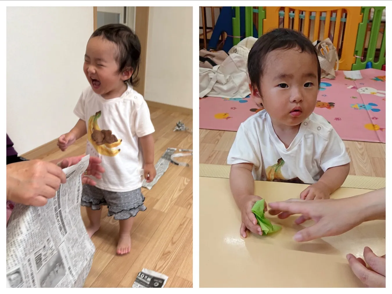 今日はファミリーデーの製作をしてから新聞紙遊びをしました。花紙をクルクルっと丸めて飾りを作りました。新聞紙遊びではビリビリ~と破く感触や音が面白くて何度も楽しめていました。
