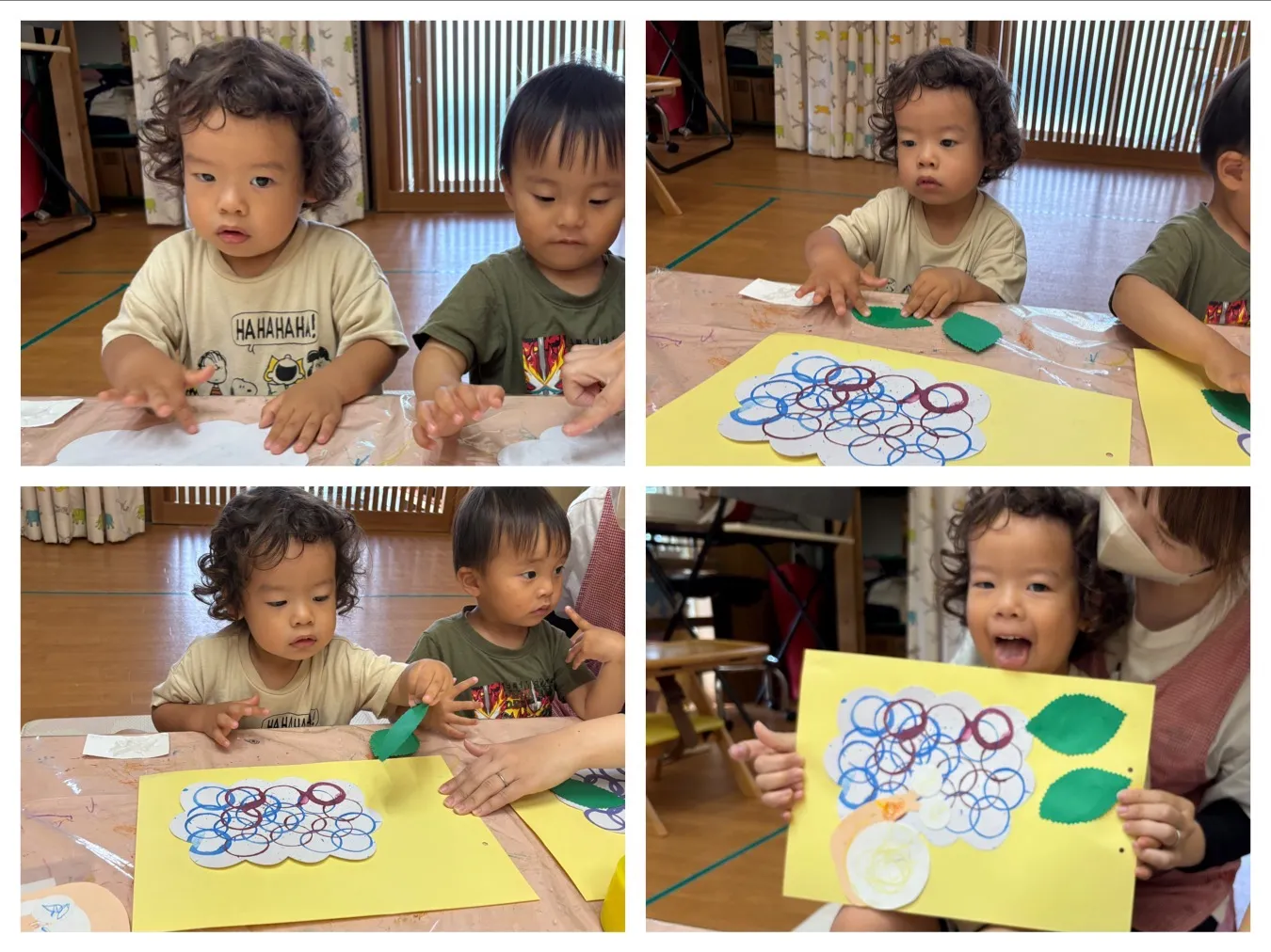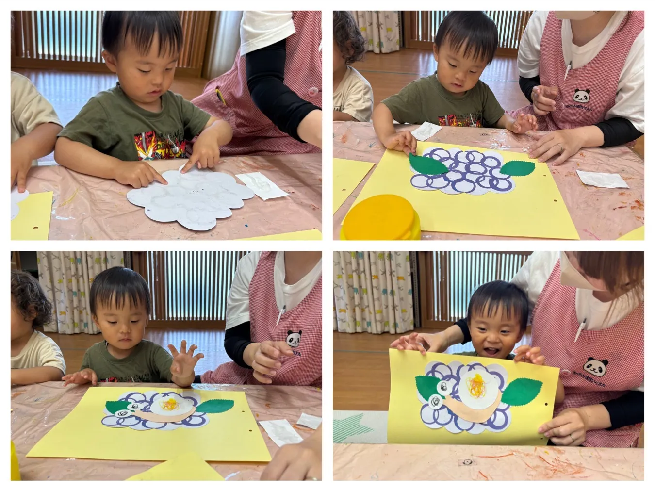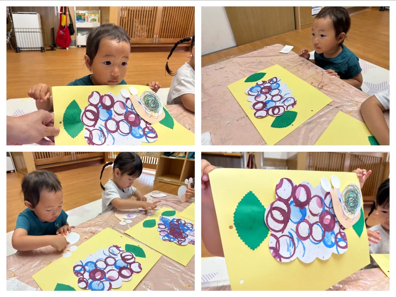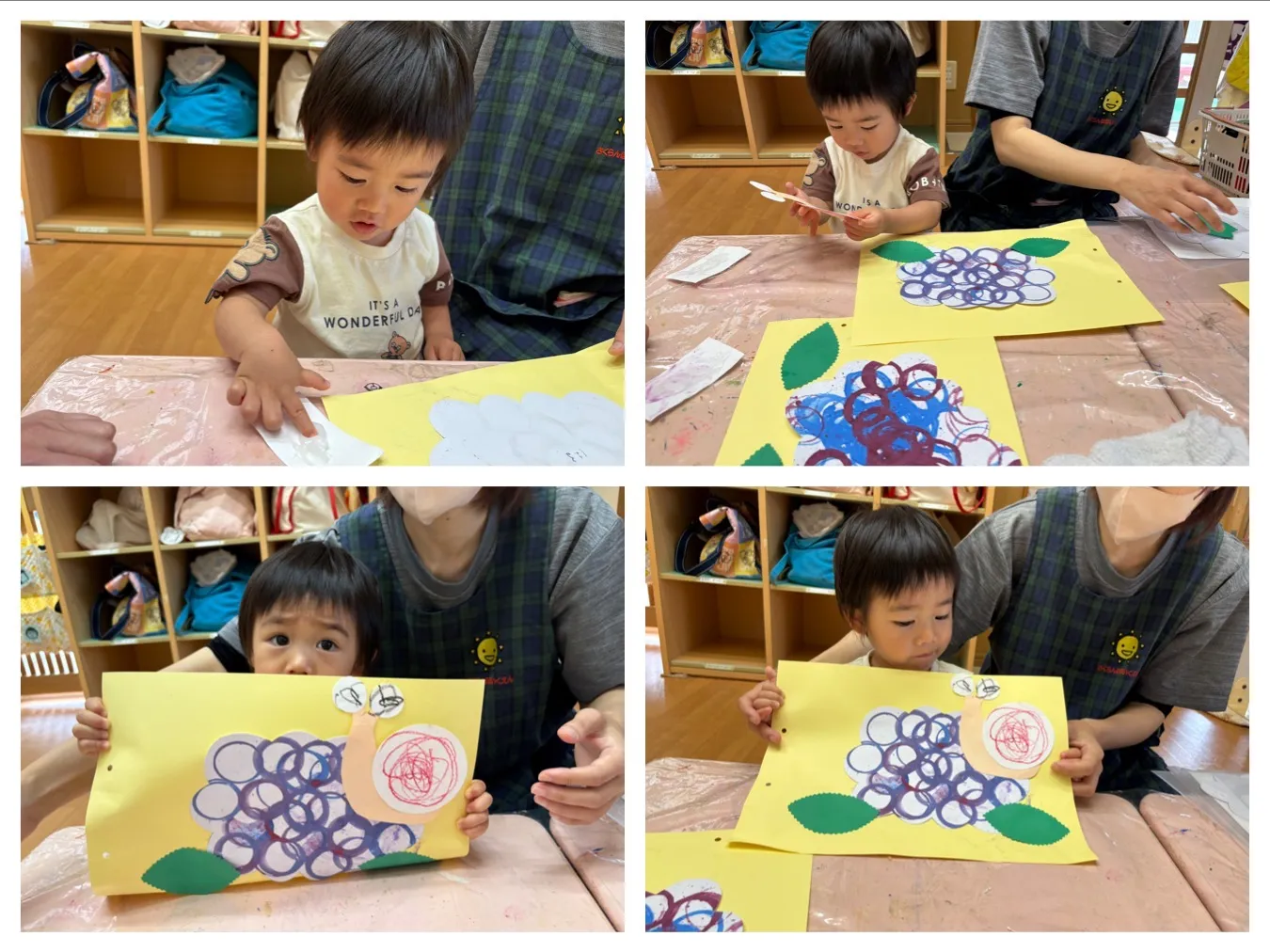 今日は6月の製作の仕上をしました。スタンピングやお絵描きで製作したアジサイやカタツムリさんを一枚の紙に貼り合わせて梅雨時期の様子が素敵に出来上がりました。子どもたちが作ってくれた作品みたいに、アジサイやカタツムリにも出逢えたらいいなと思います。