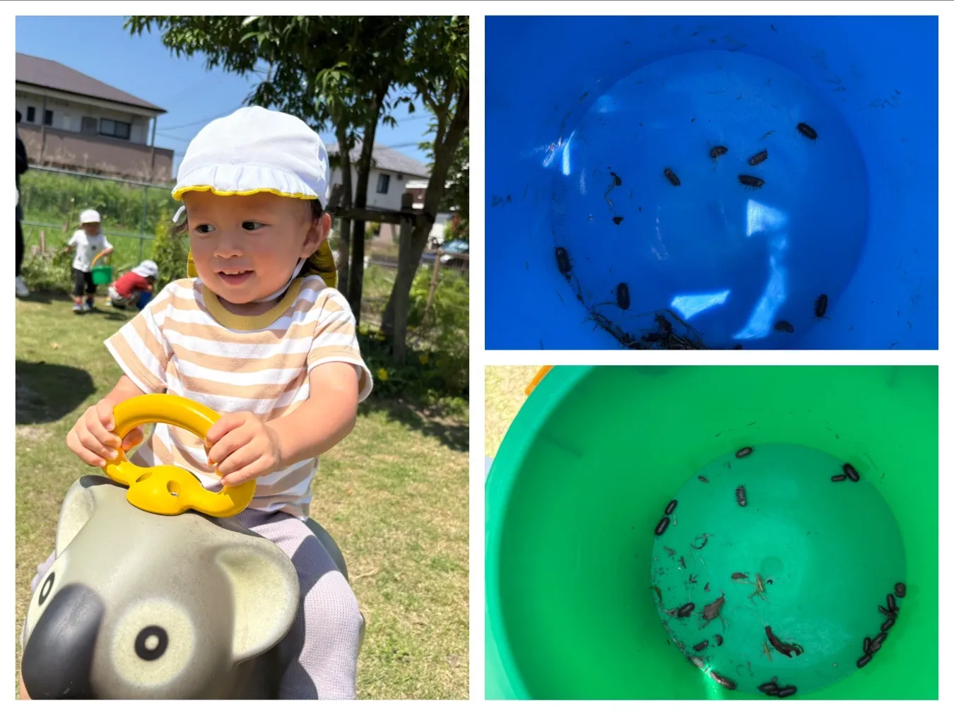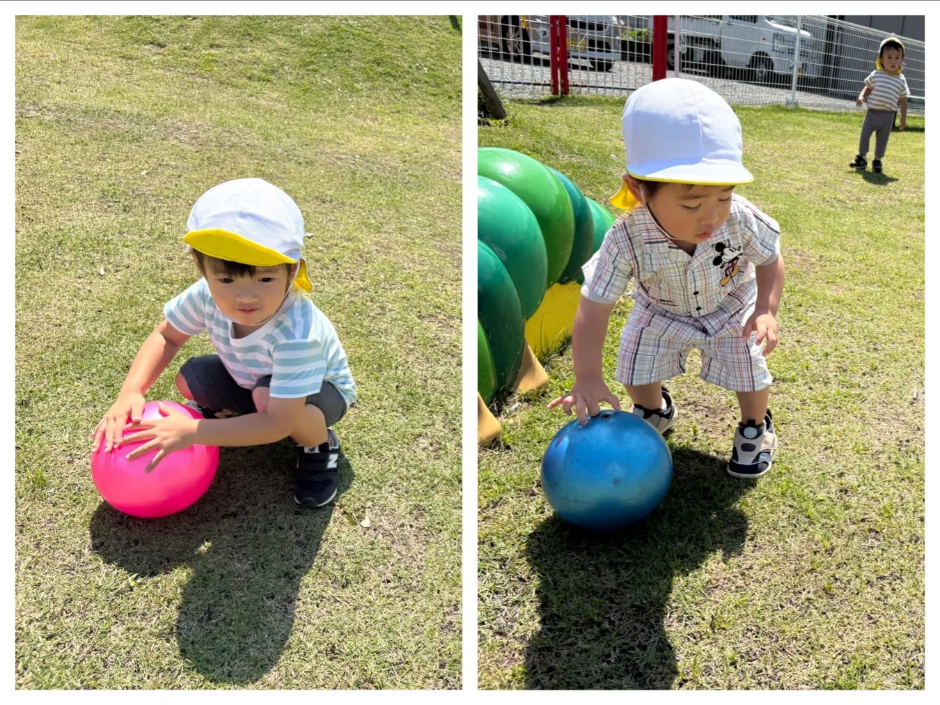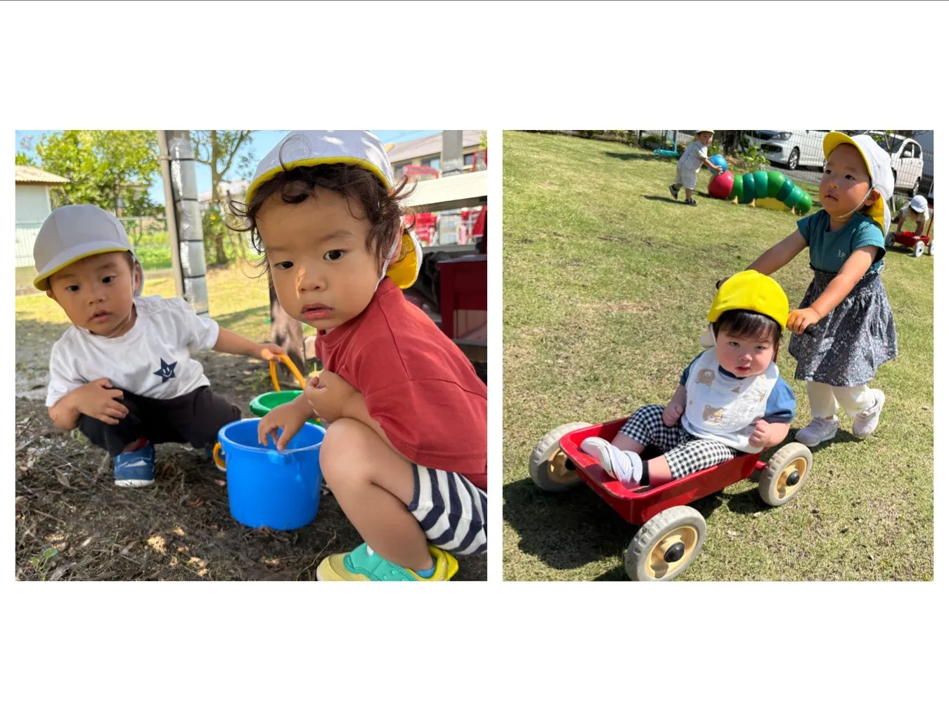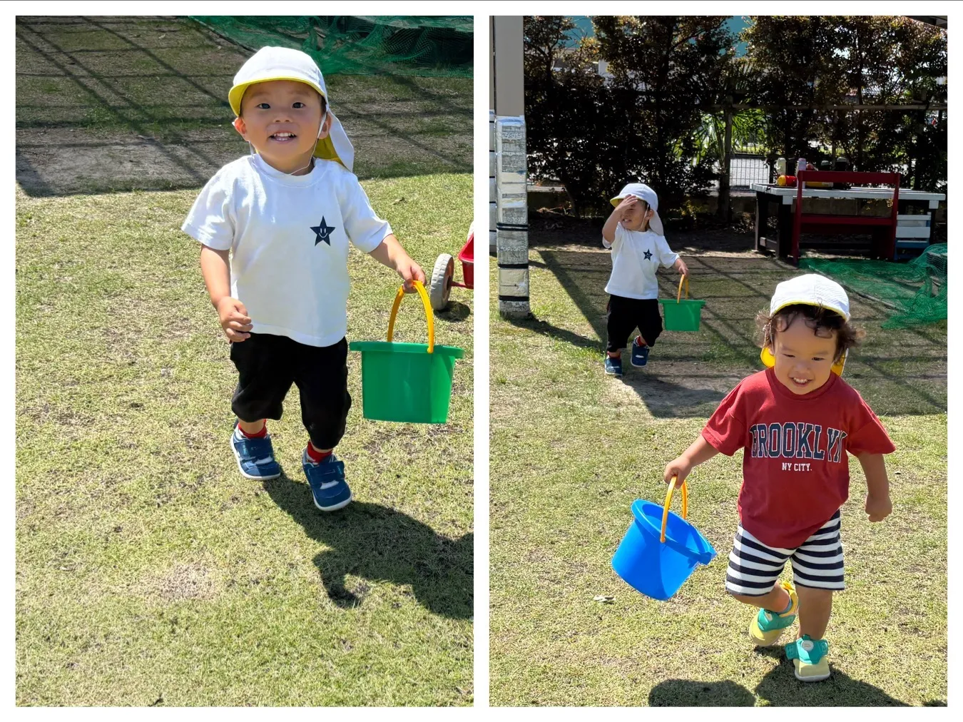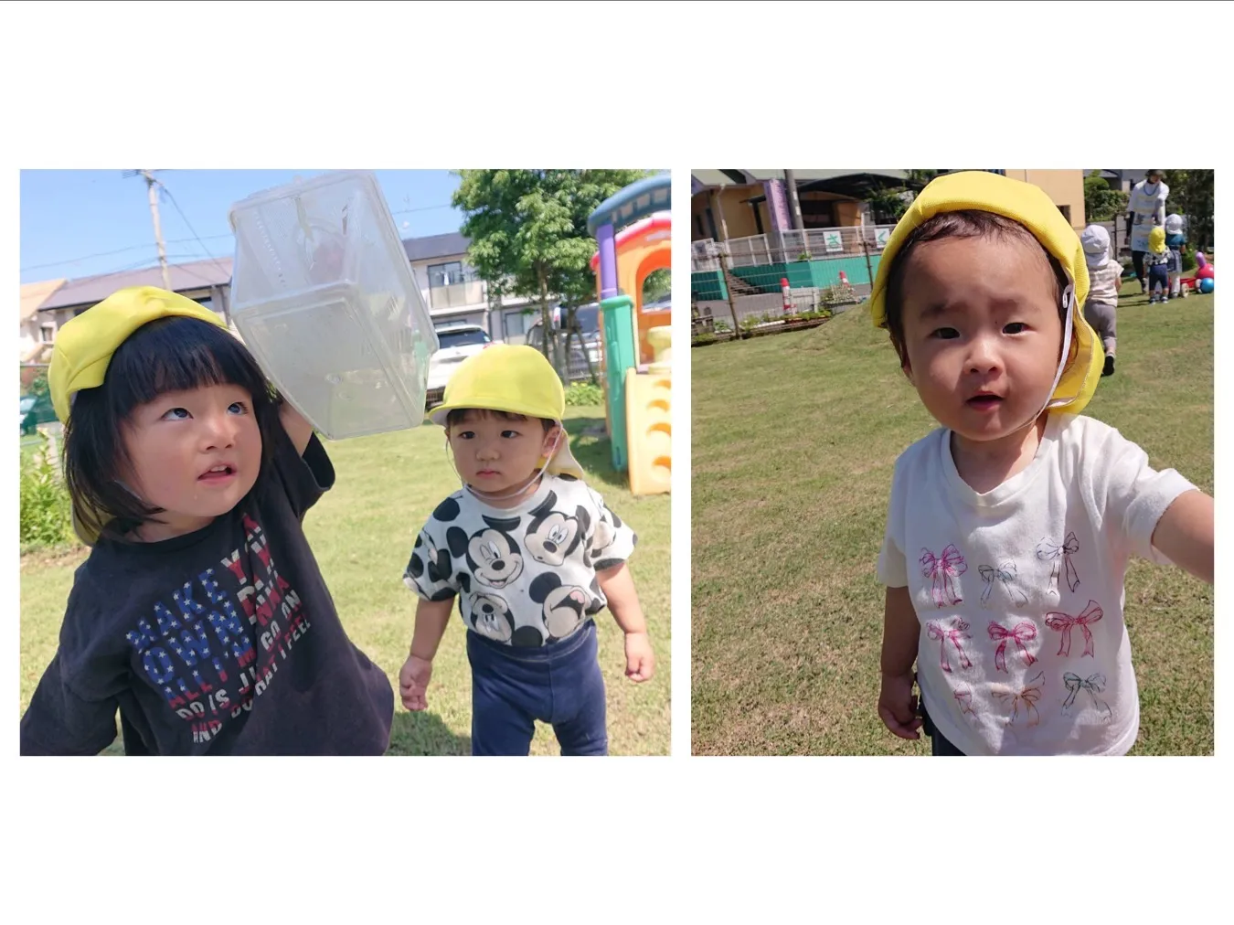 今日もいい天気☀子どもたちは広場遊びを思う存分楽しみました。先生が見つけたちょうちょさんを観察したり、ダンゴ虫探しに夢中になっているお友達がいたり、、子どもたちは好きな遊びをみつけて楽しめていました。
