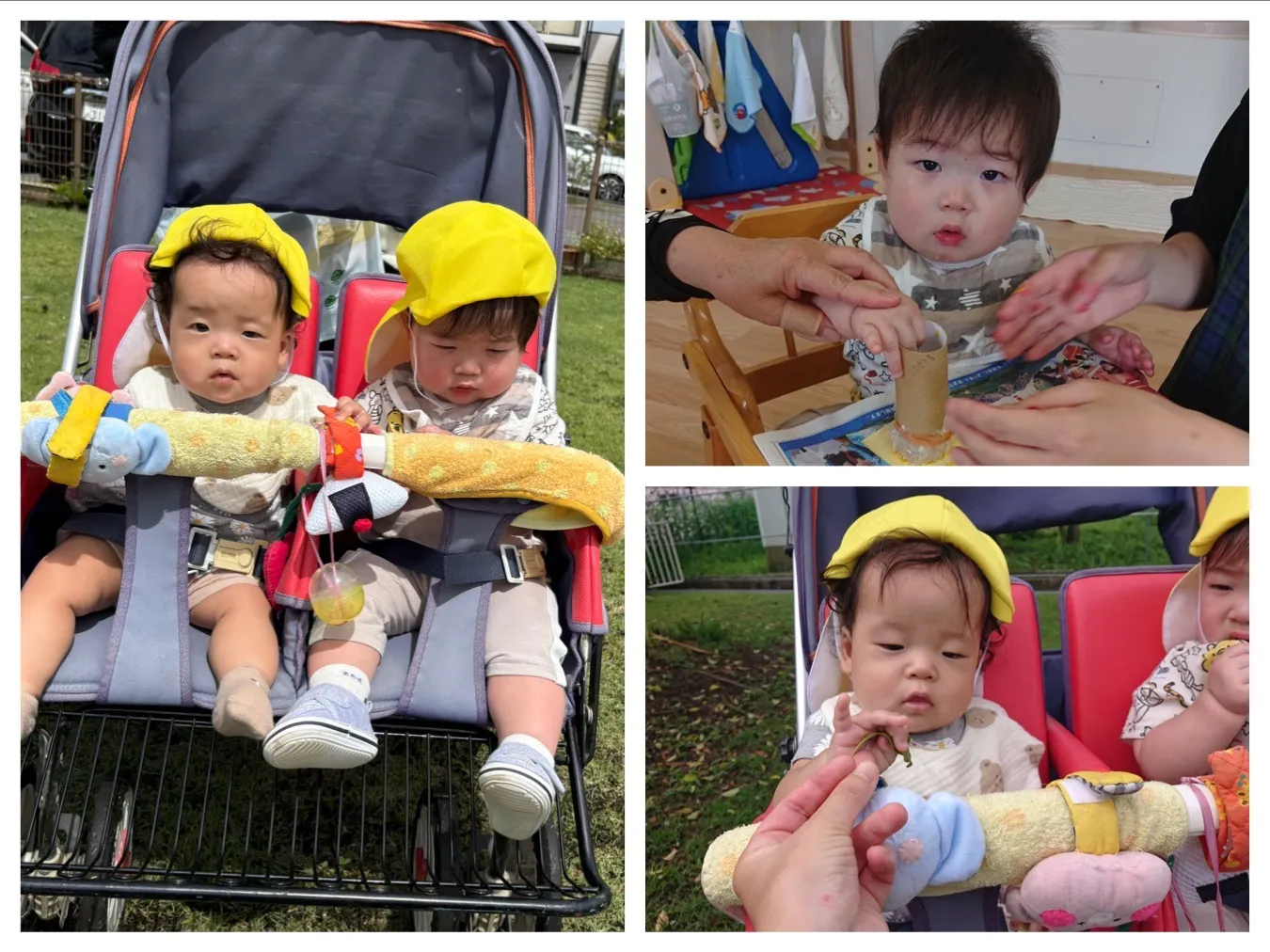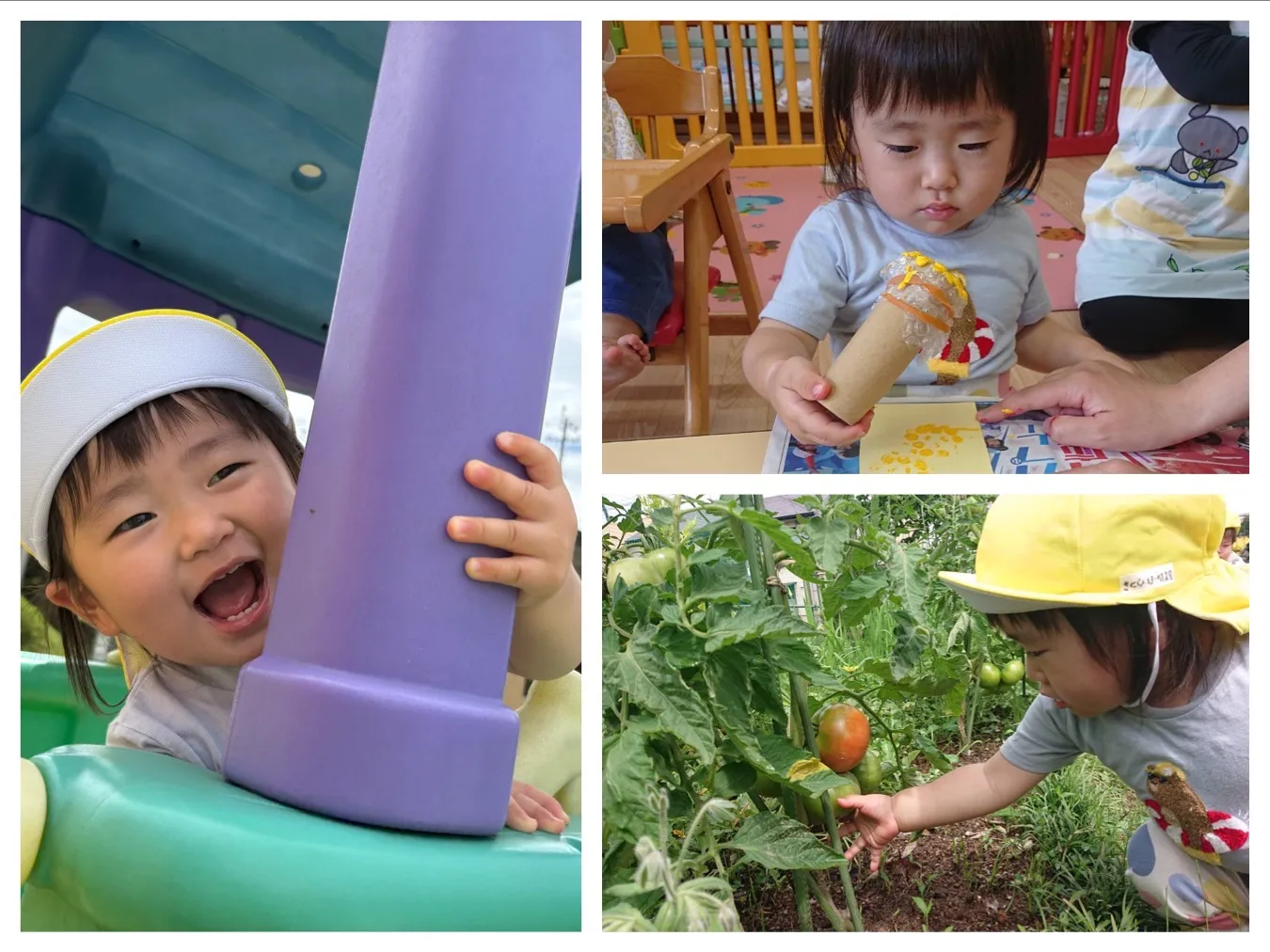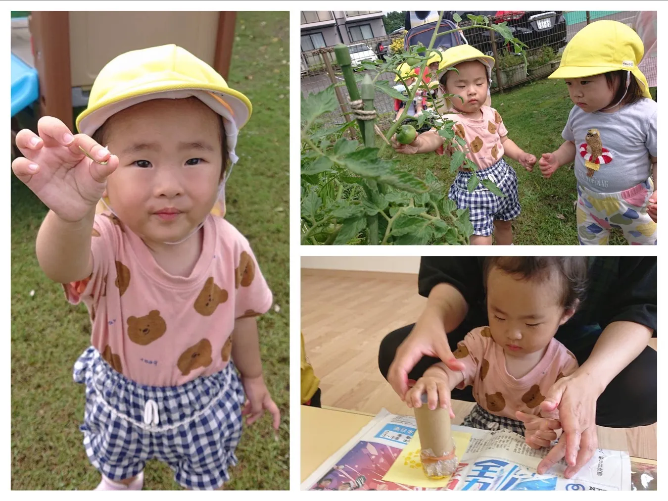 今日は7月の製作「タンポで夏野菜作り」をしました。トントントンと言うたびに赤や紫などの色のついたタンポをトントントンと押して色付けを頑張っていました。広場ではちょうちょを見つけたり、赤く色がつき始めたトマトを観察して遊びました。