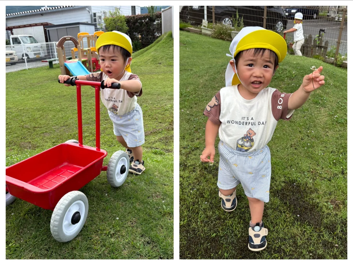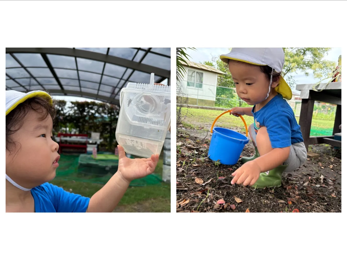 今日は雨が上がって「お外に行けるね」と張り切って広場に向かったりんご組さん。広場では大好きな虫探しを始めると、ダンゴ虫やちょうちょを捕まえて観察を頑張っていました。広場のトマトが赤く色ついたことを「せんせいきてきて~」と連れて行って教えてくれました。もうすぐ収穫できそうです!!