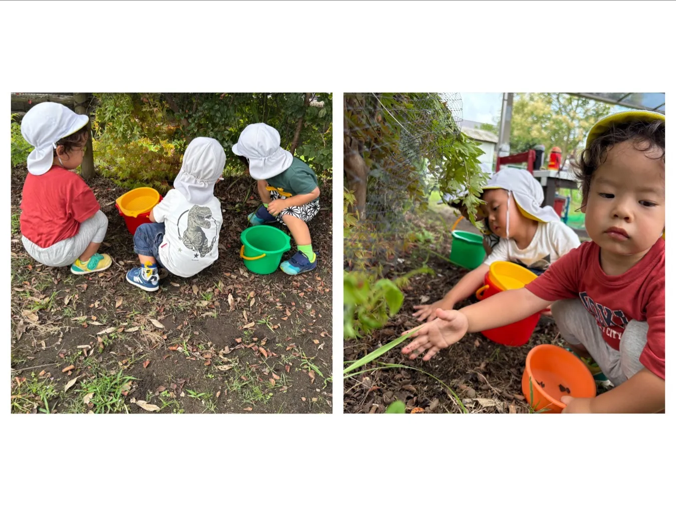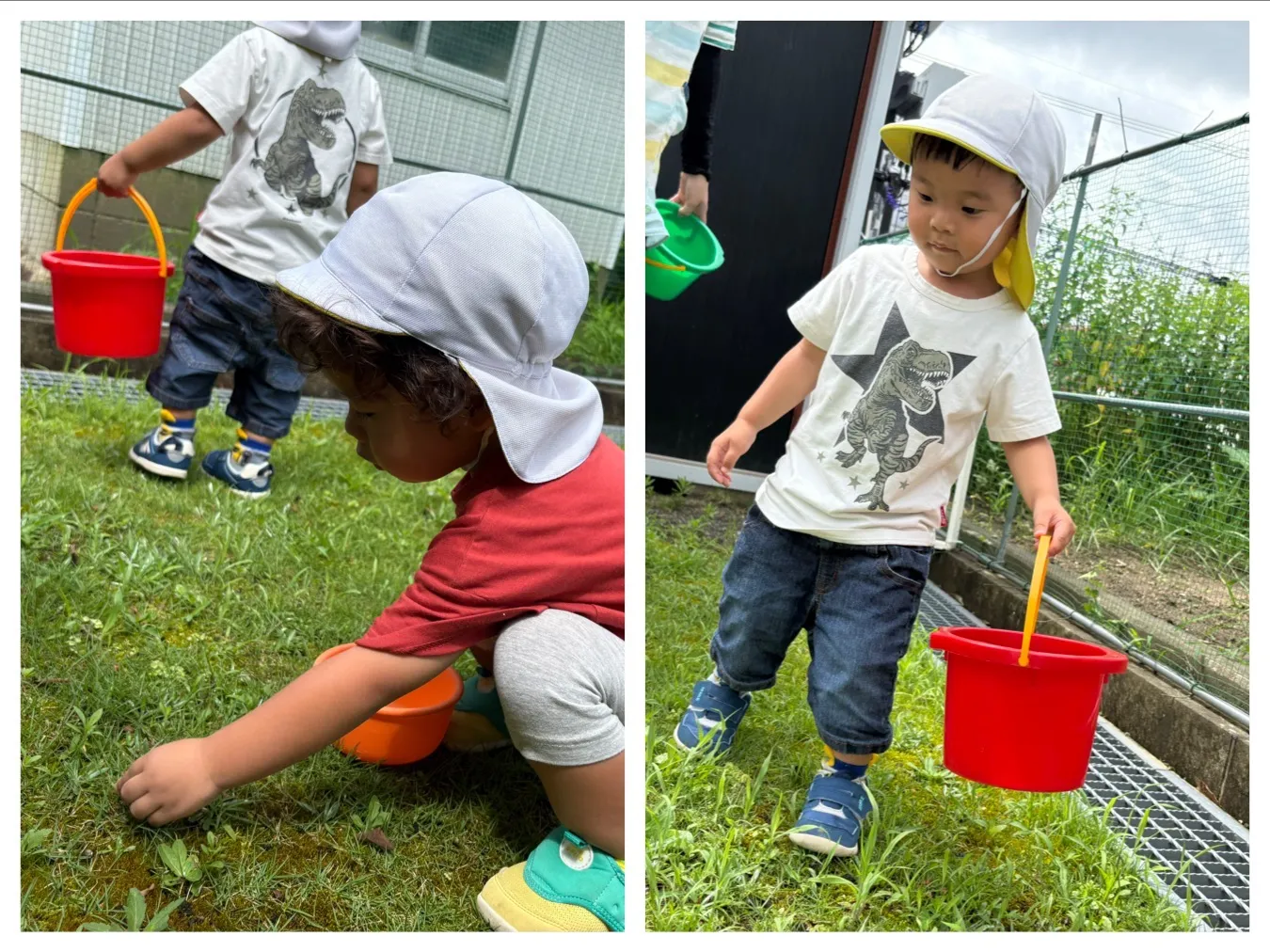 今日は広場遊びをしました。大きいカミキリムシがいて、いちご組さんはびっくりしていました。りんご組さんは触れたお友達もいましたが、初めて見る虫に興味津々で触りたいけど触れない、、、の気持ちが行動や表情に出ていて可愛かったです。