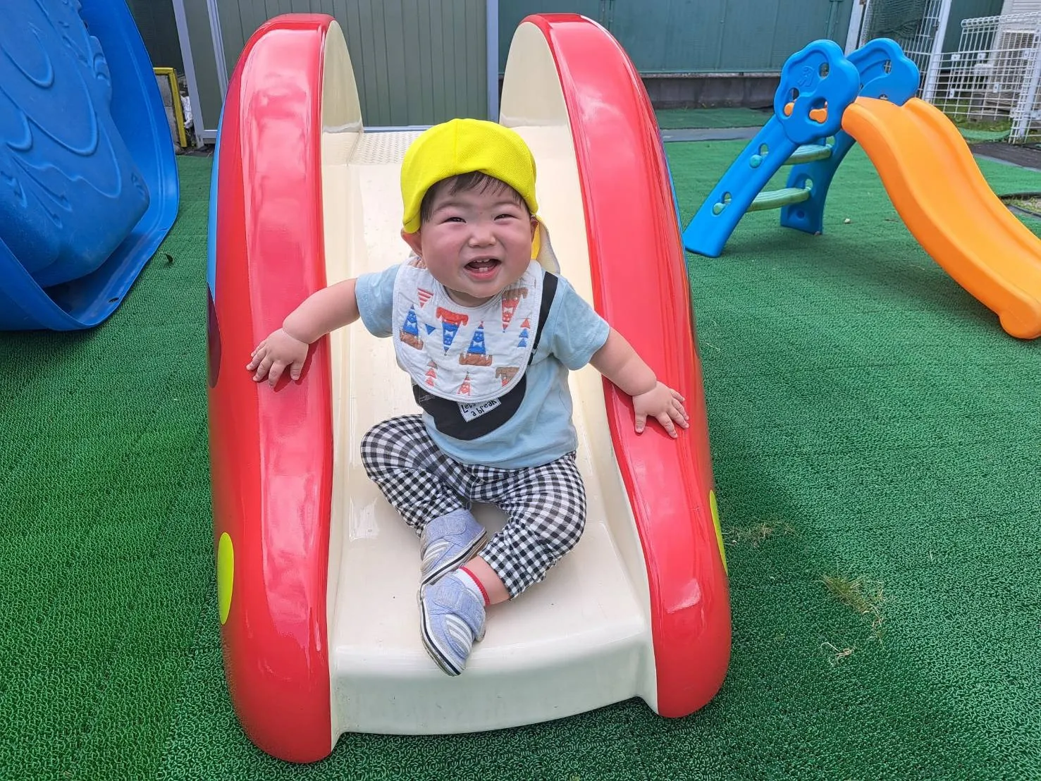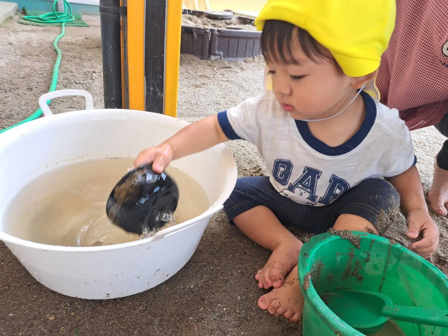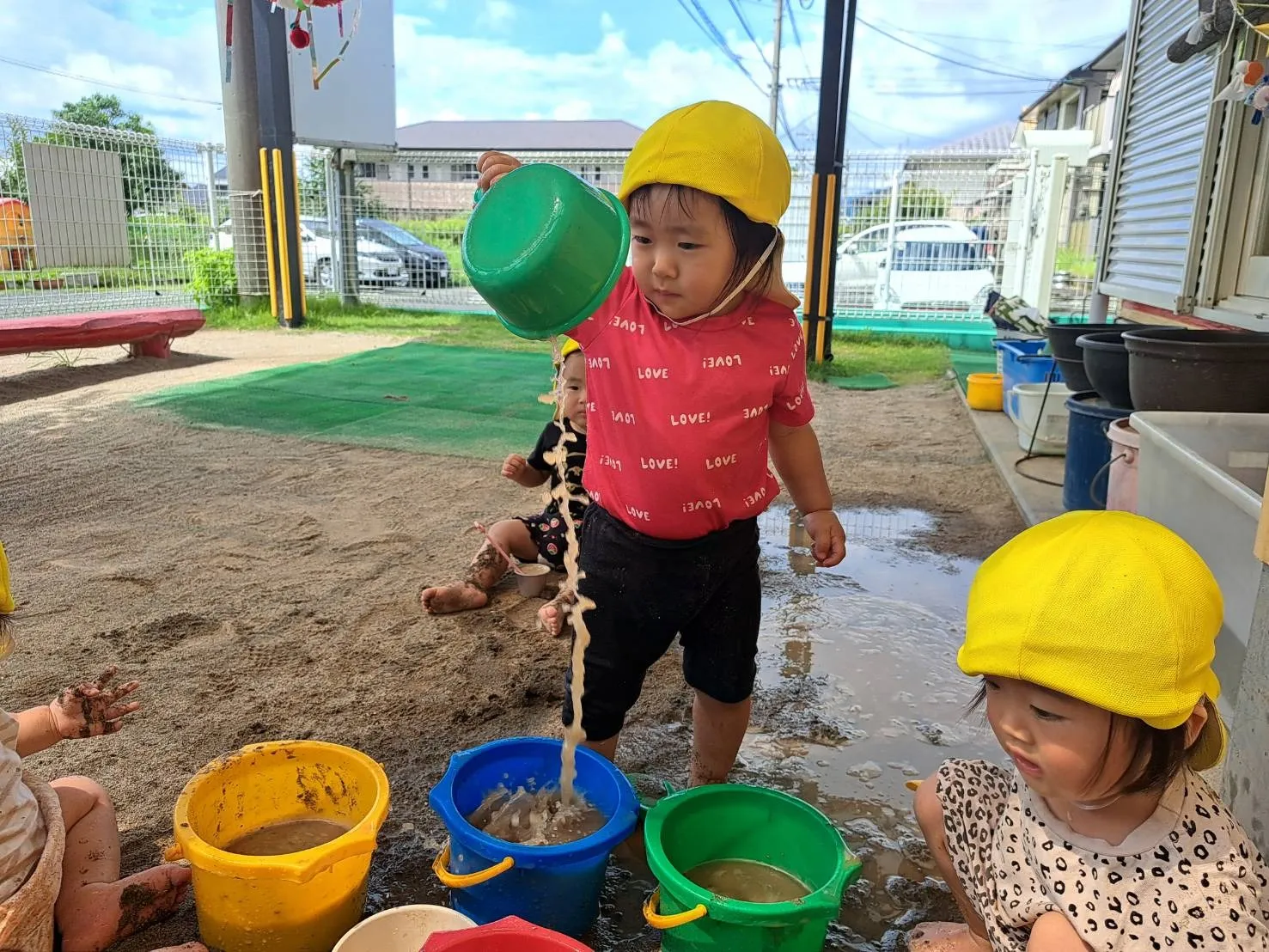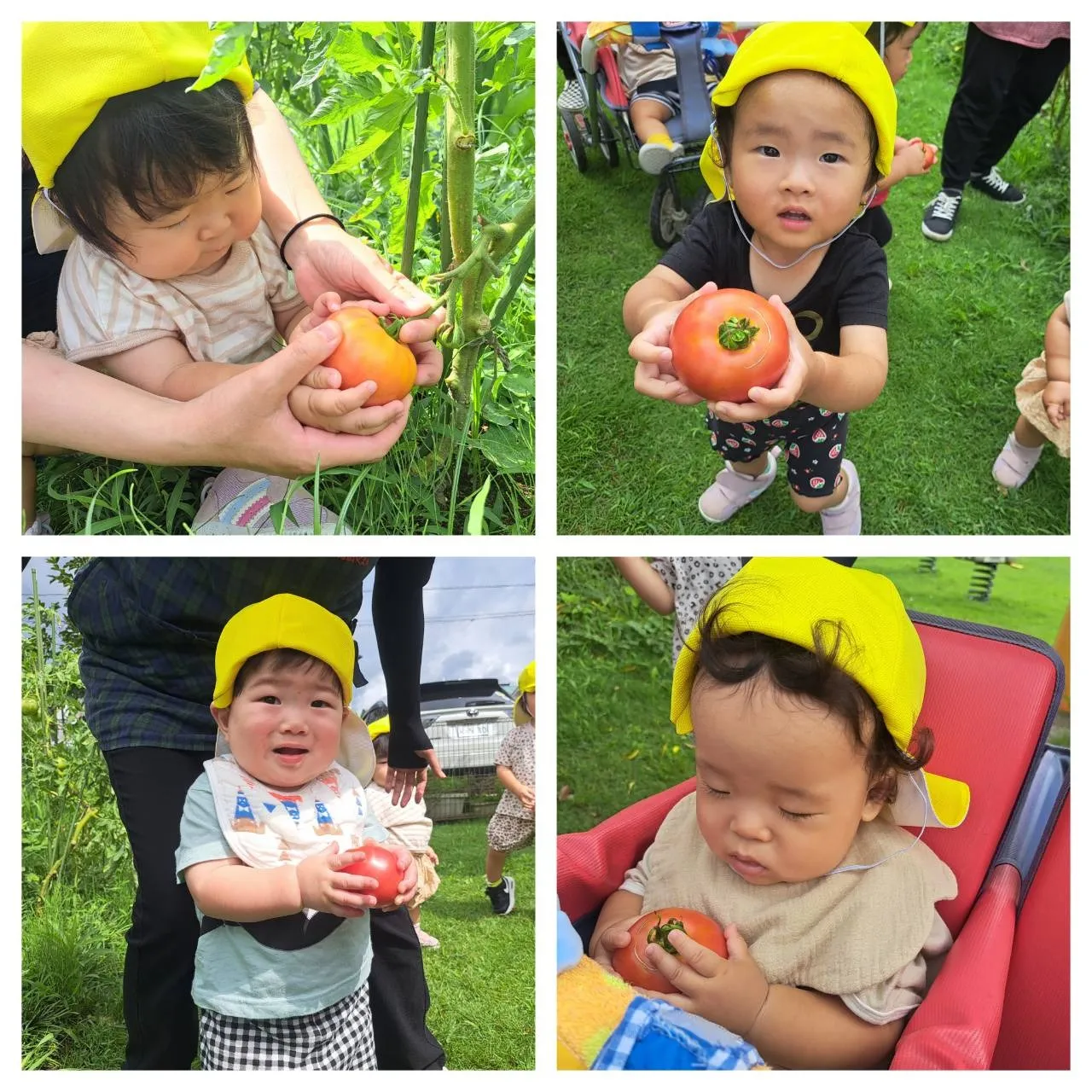 広場のトマトが赤く色づいていたので、収穫させてもらいました。自分たちの手でプチっと収穫できて嬉しそうな子どもたちでした♪その後、1歳児さんは泥んこ遊びをしました。初めての泥んこ遊びは、少しドキドキしたようですが、慣れてくると感触を楽しめていました♪0歳児さんは、お部屋やお庭でのんびりと過ごしました。