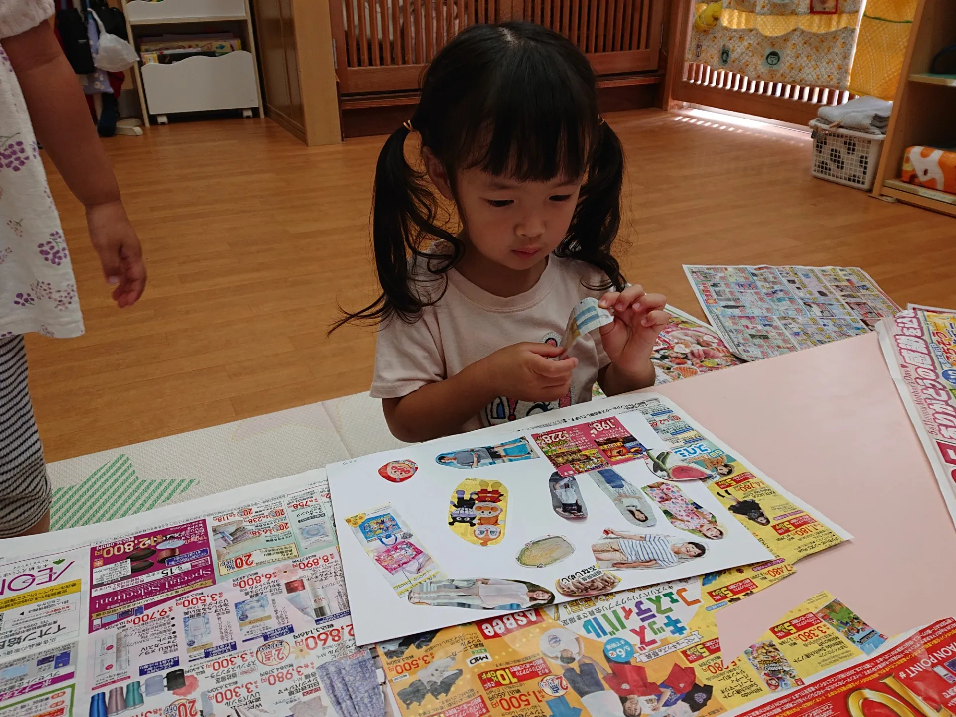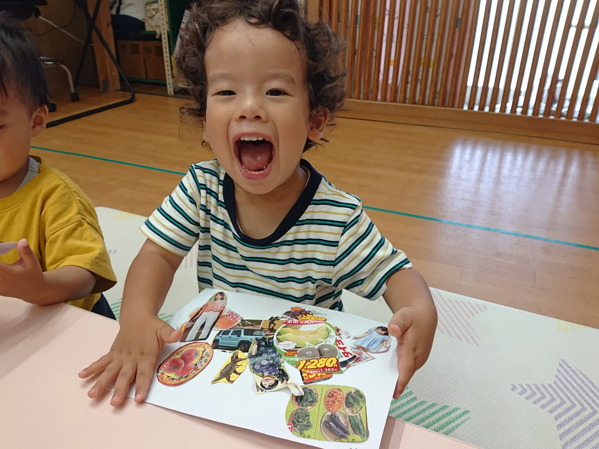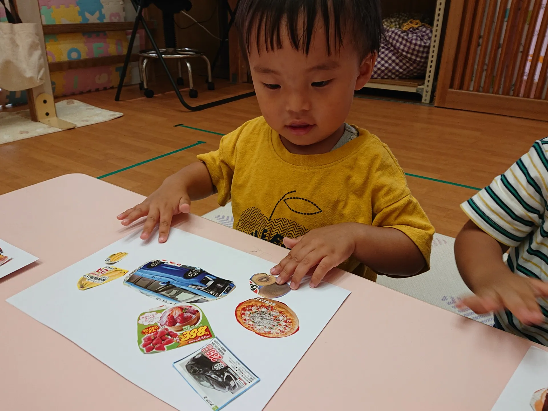 今日は、広告紙の写真やイラストを切ったものを選んで、糊付けしていきました。「どれにしようかな~」と広告紙を真剣に見つめる姿は、大人顔負けでした