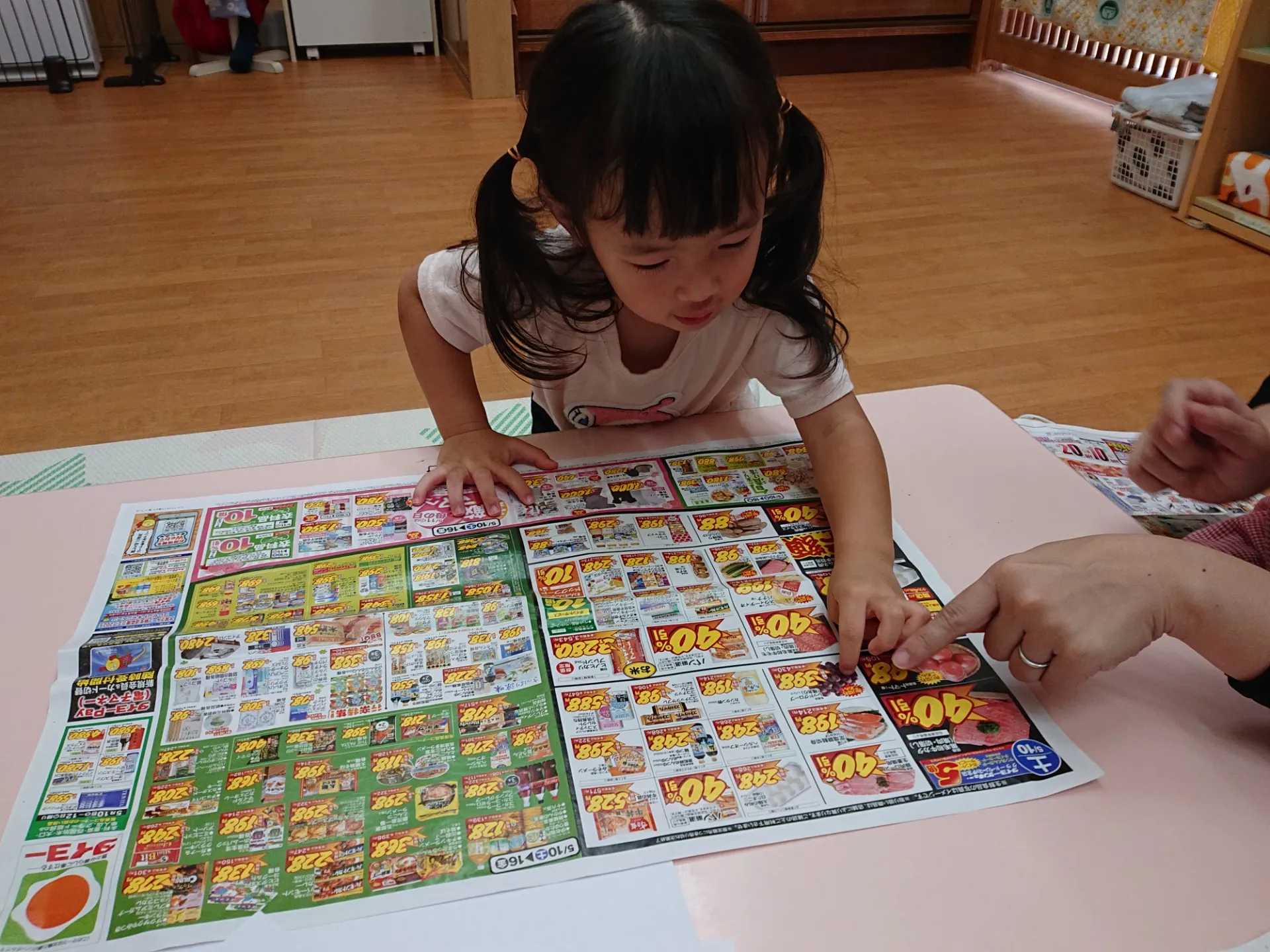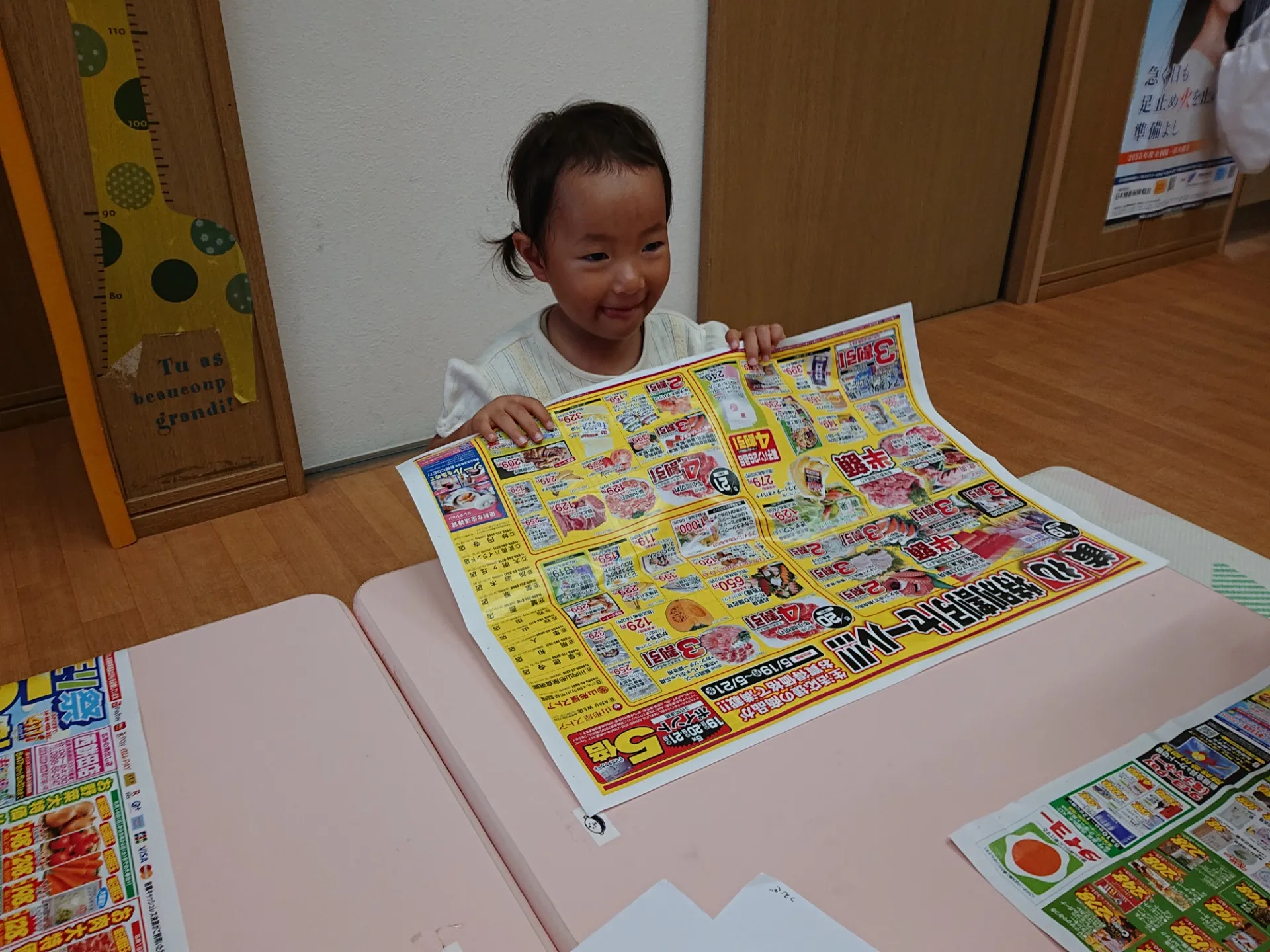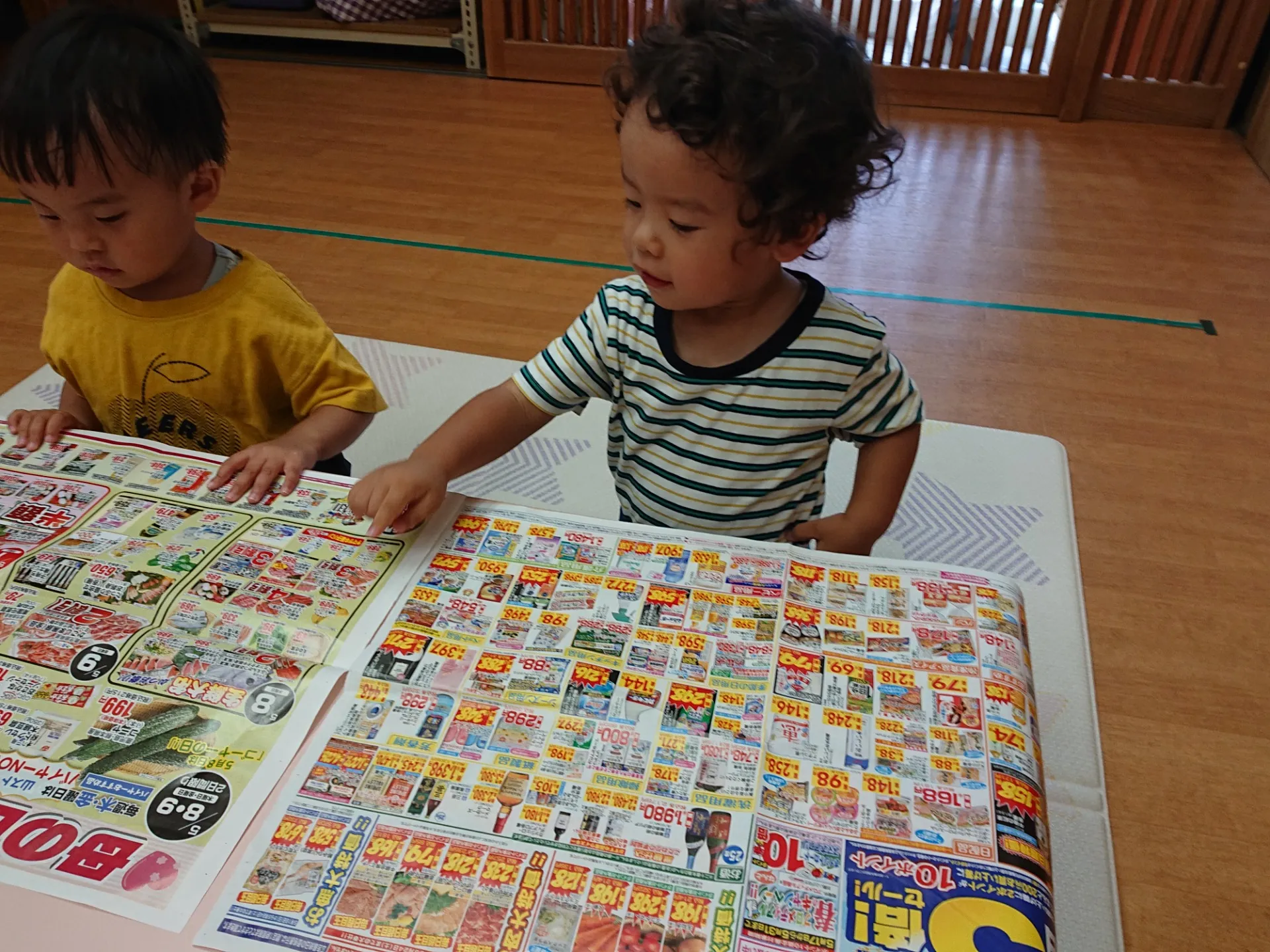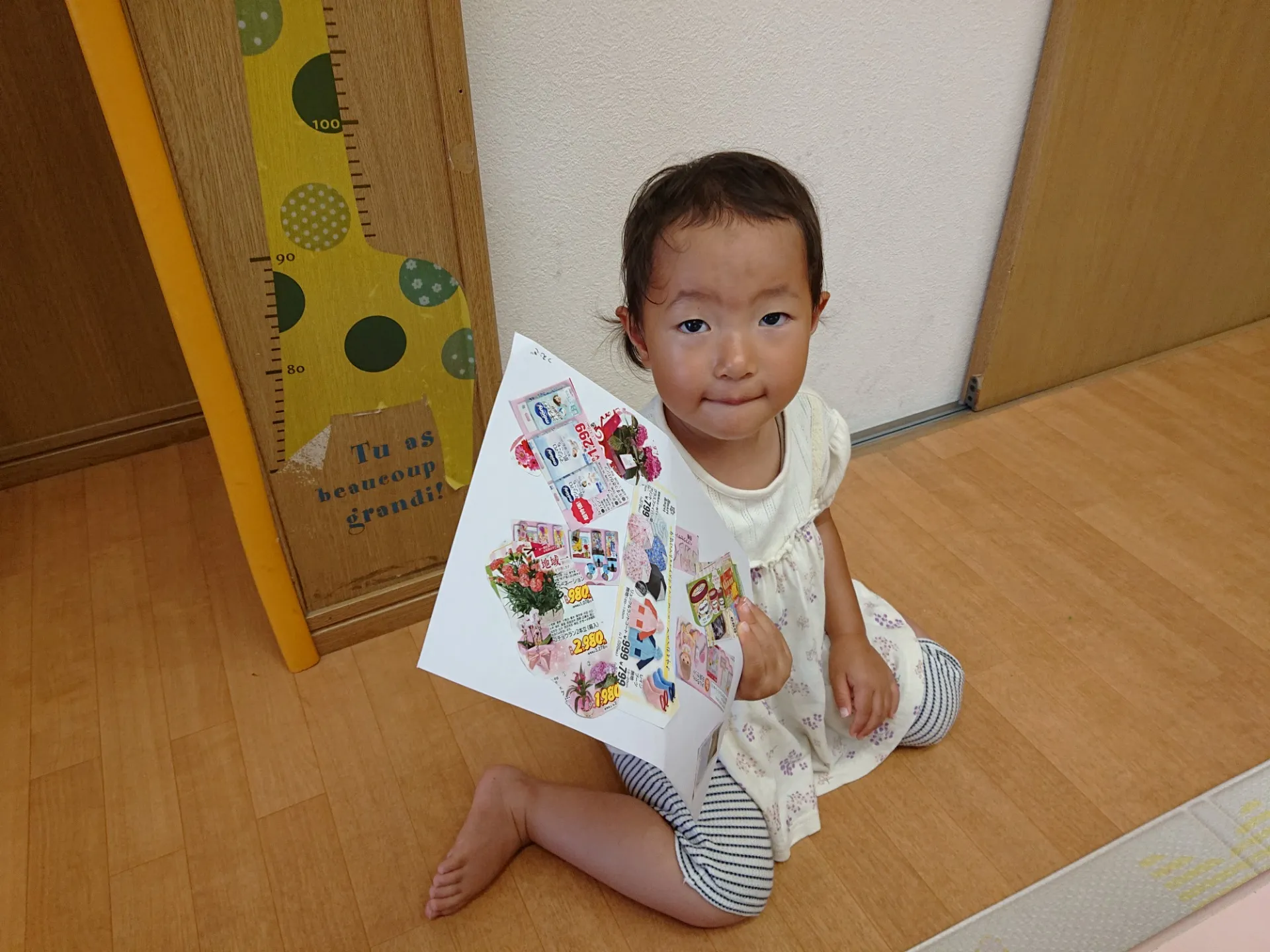 今日は、広告紙の写真やイラストを切ったものを選んで、糊付けしていきました。「どれにしようかな~」と広告紙を真剣に見つめる姿は、大人顔負けでした