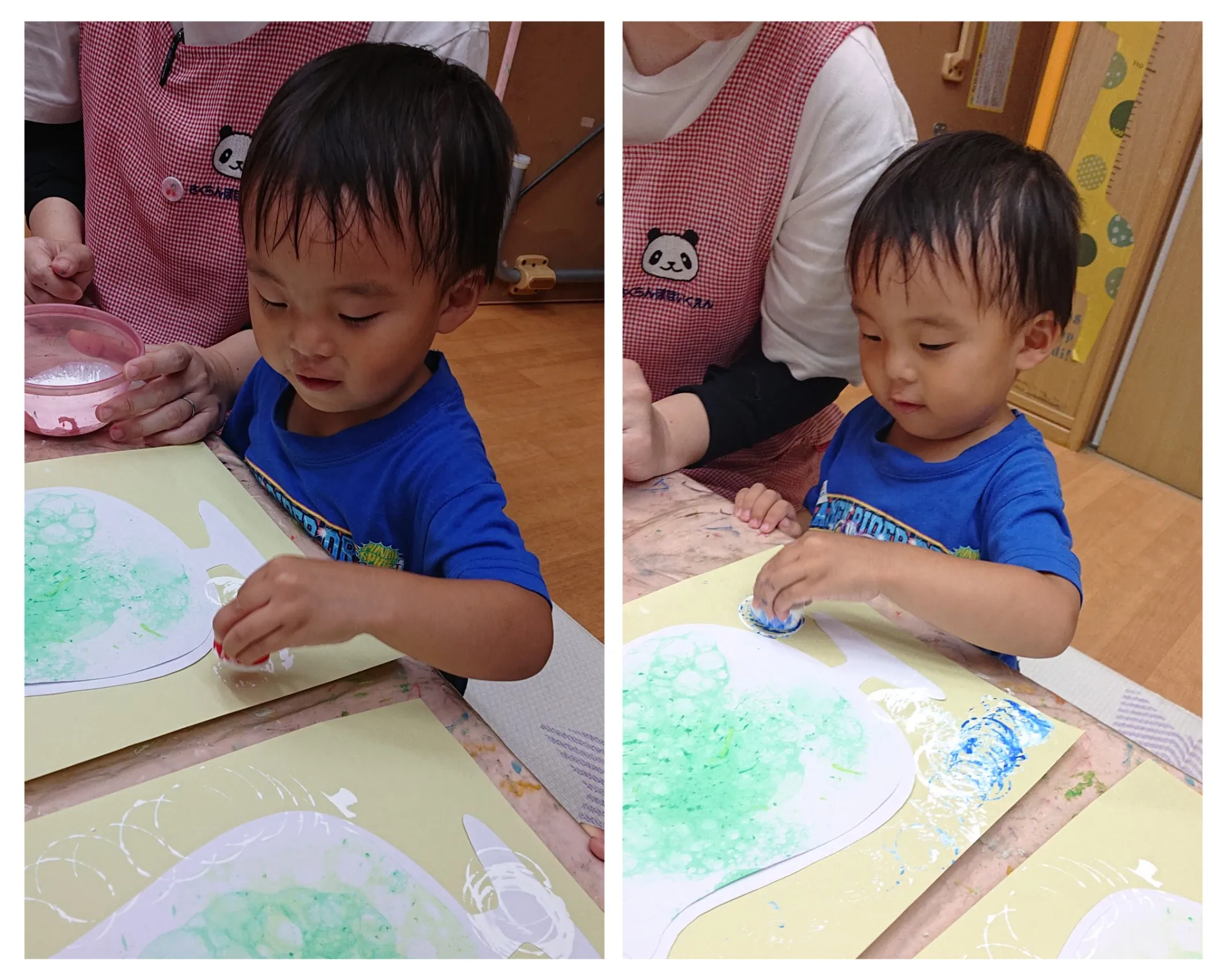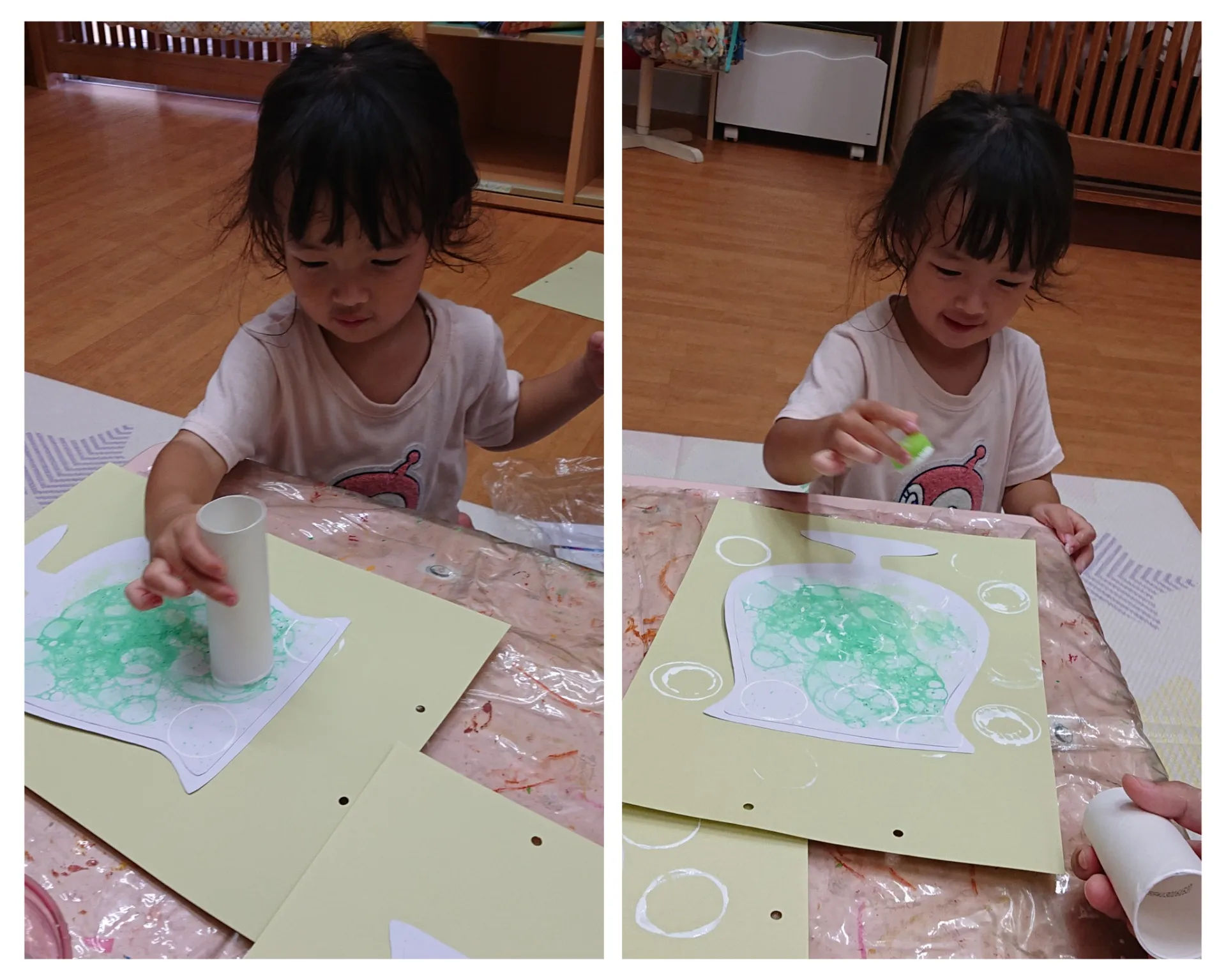 先日のバブルアートの続きで、コップの周りにペットボトルのキャップやトイレットペーパー芯で炭酸を表現しました。大小さまざまな丸をスタンピングし、より一層おいしそうなクリームソーダが完成しそうです。