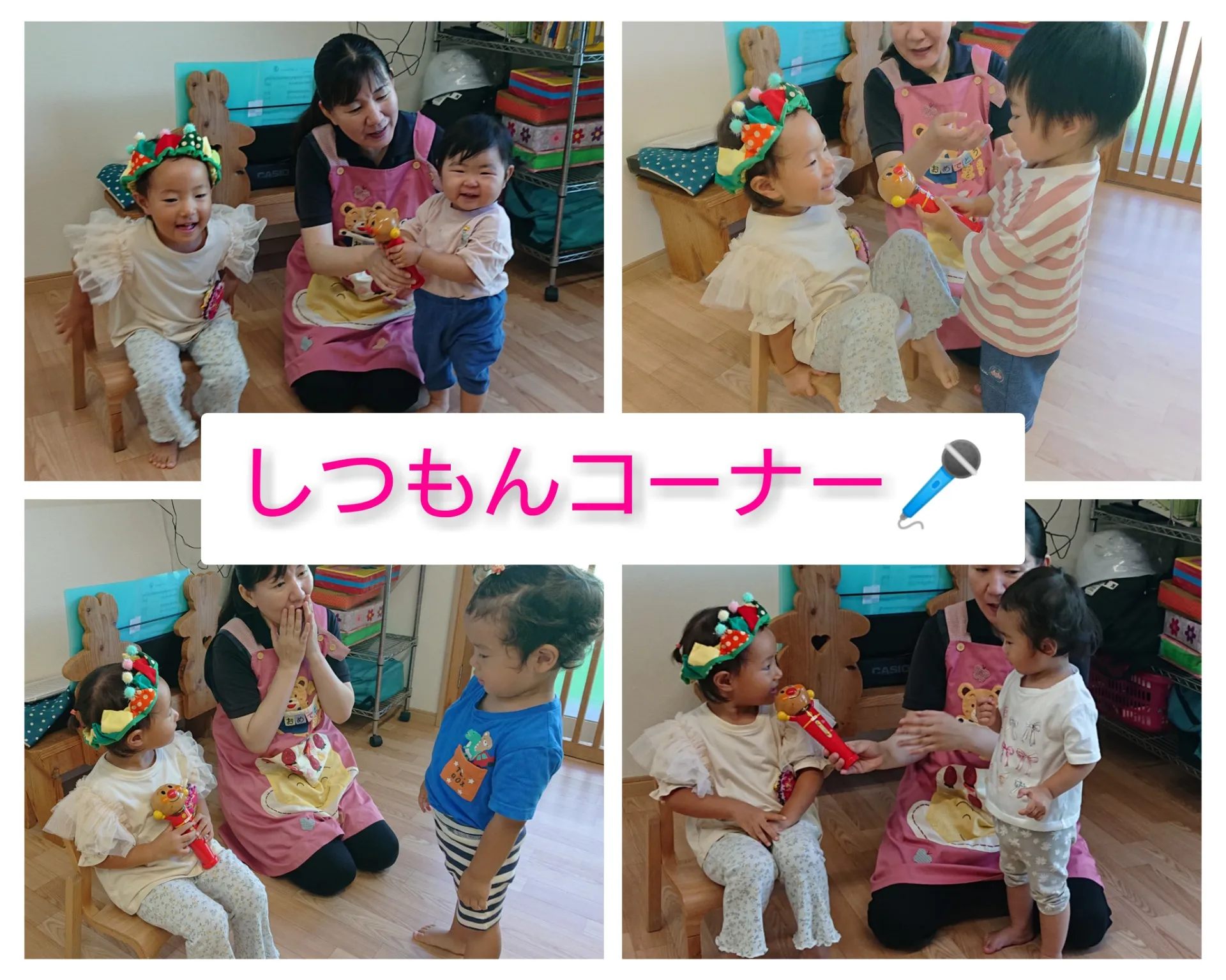 今日は、7月のお誕生会と身体測定の日でした。お誕生児さんへの質問コーナーでは、聞きたいことがたくさんあるようで、次々に質問が飛び交っていました。かき氷のスケッチブックシアターを見たり、台所にある道具を使ってキッチンオーケストラをしたりと、とても楽しいお誕生会になりました♪(※「キッチンオーケストラは、今日だけ特別に楽器にしていい事やお家の道具は、叩いたりしないでね。」とお約束して楽しみました)