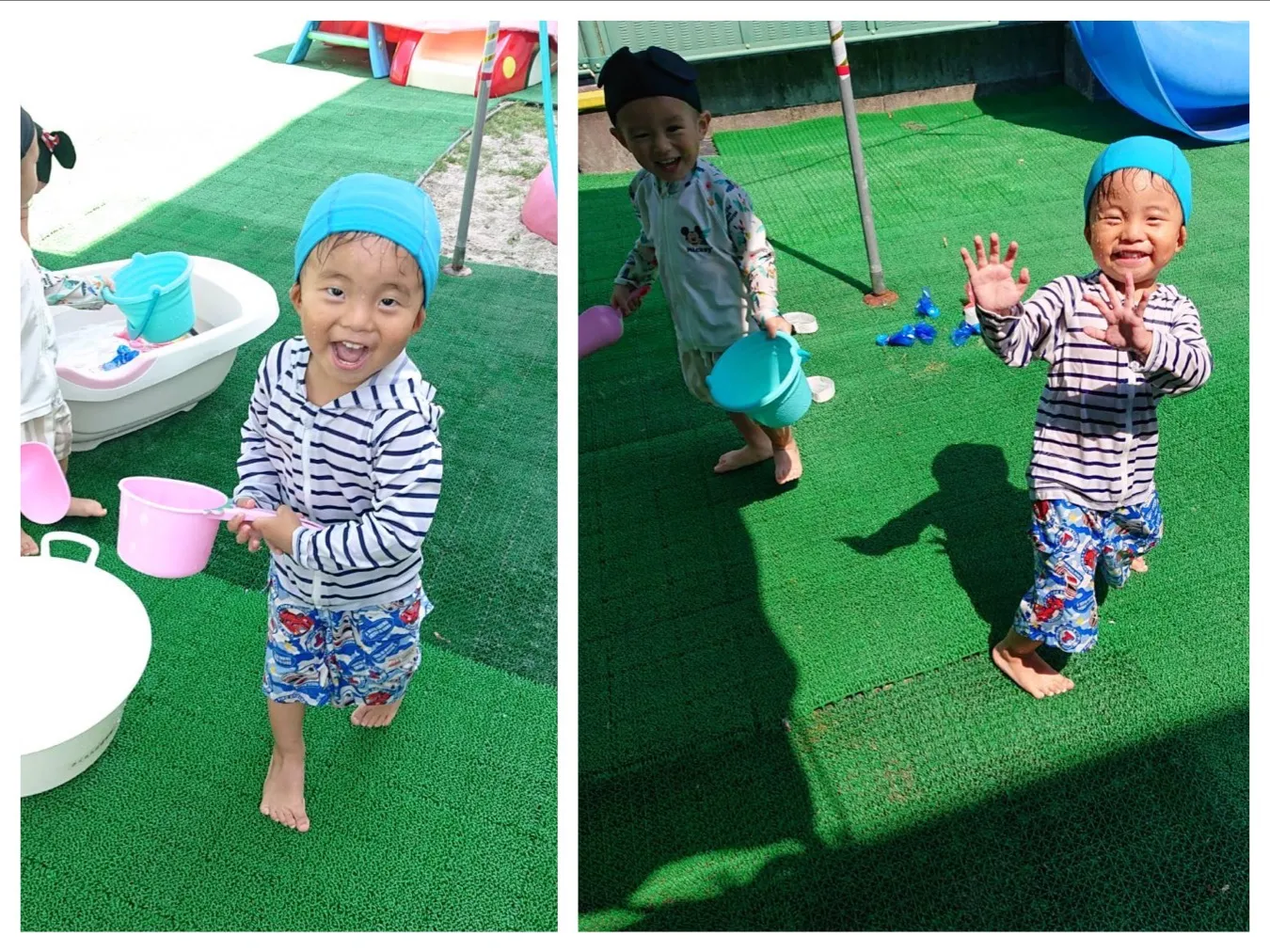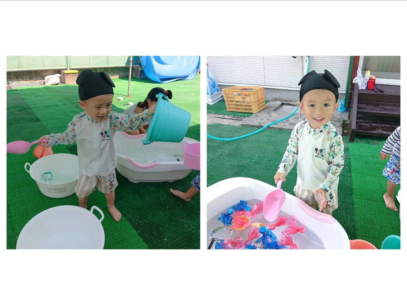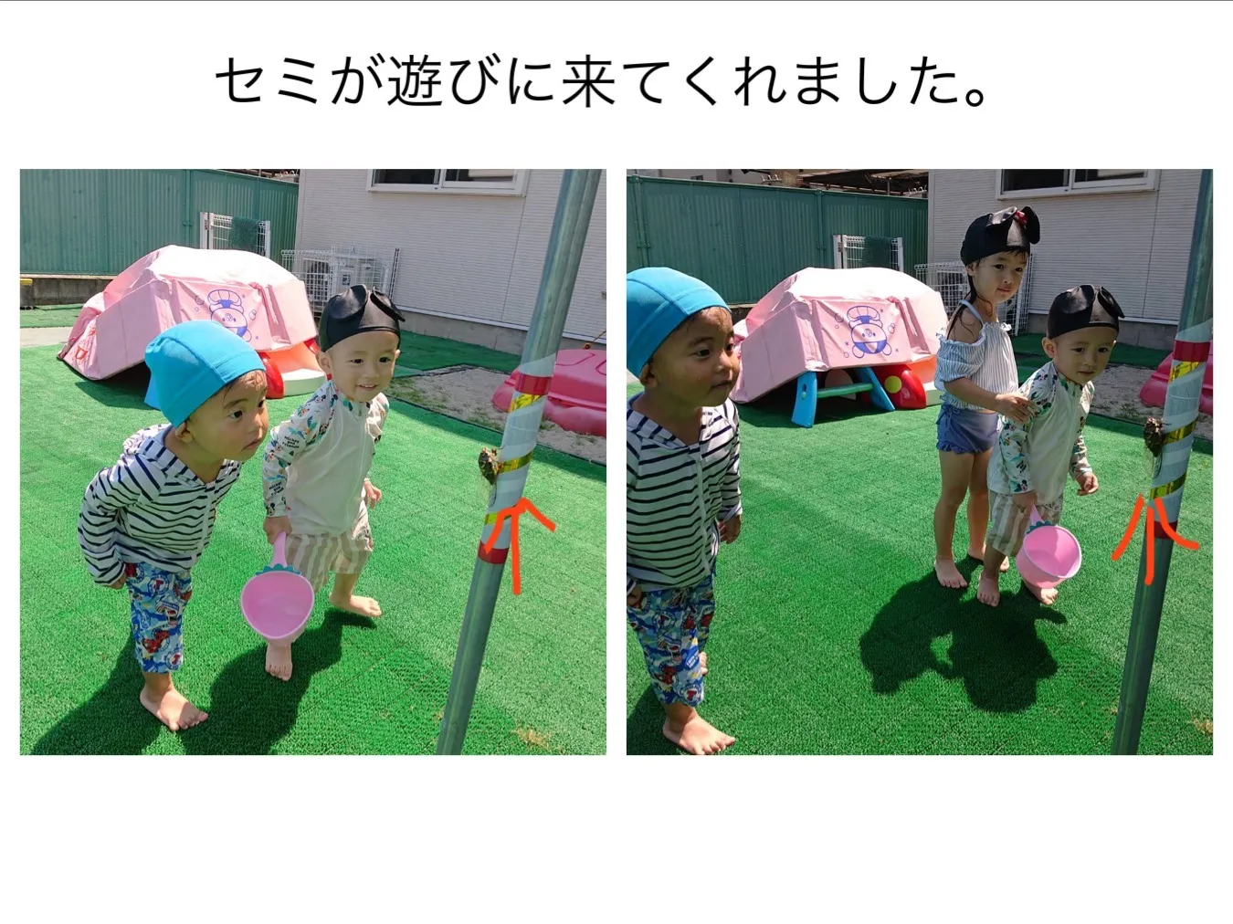 今日は、タライに水を入れて金魚すくいをしてみたり、お友達とお水をかけあったりして遊びました。遊んでいるとセミさんが遊びに来てくれて近くで観察することが出来ました。のんびり楽しい時間が過ごせていて笑顔が沢山見られていました。