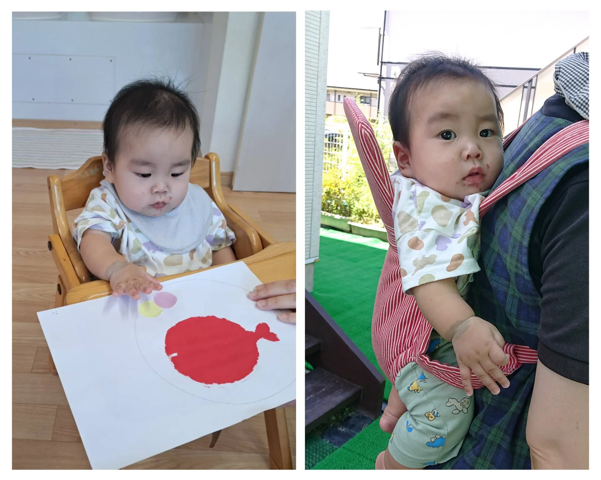 昨日、タンポでスタンピングした金魚さんの周りにシール貼りをしていきました。1歳児のお友だちの様子をみて、0歳児さんも貼ってみようとシールを手で抑える姿が見られました。出来上がった作品は8月末のお店屋さんごっこの商品になり、お買い物する予定です♪