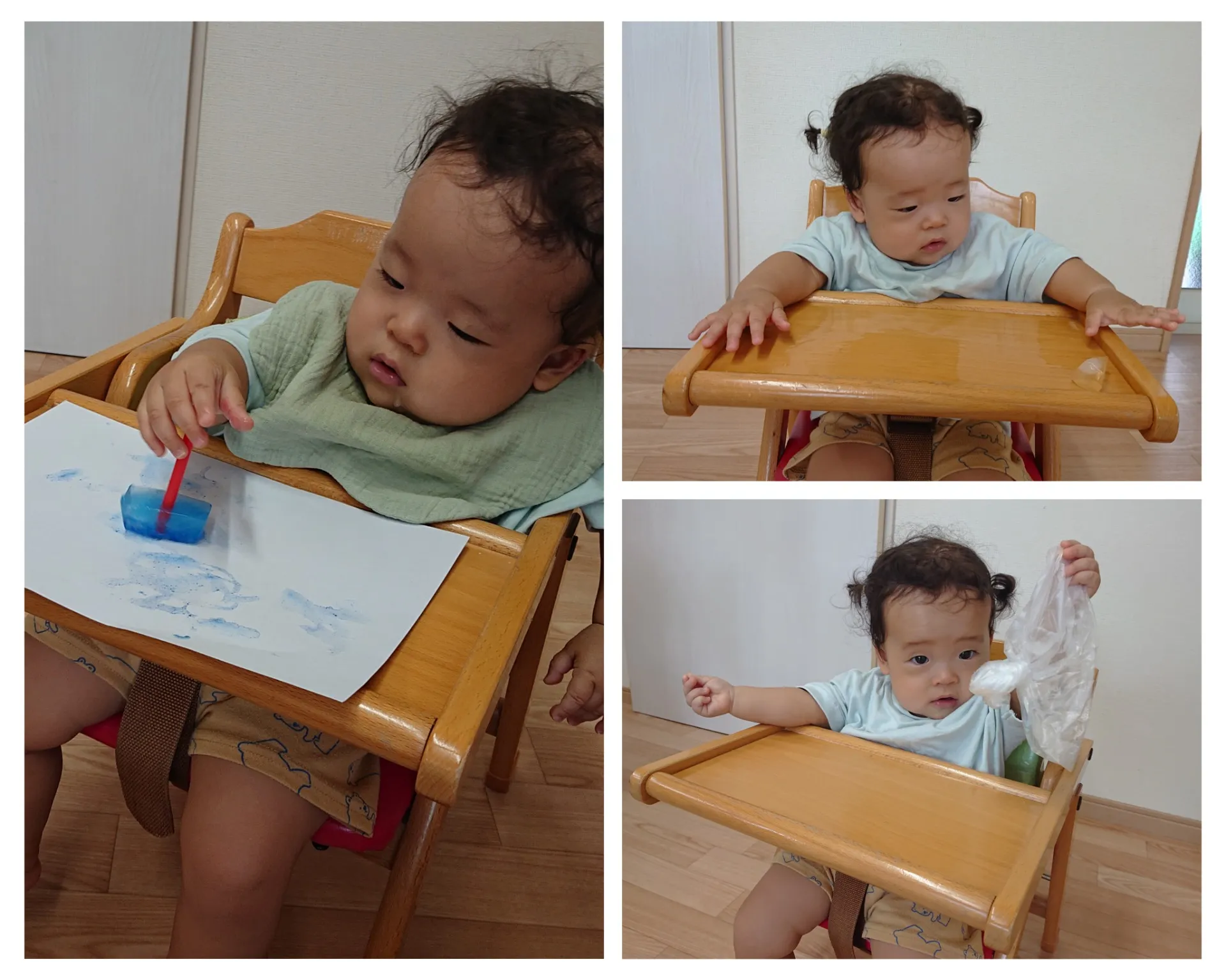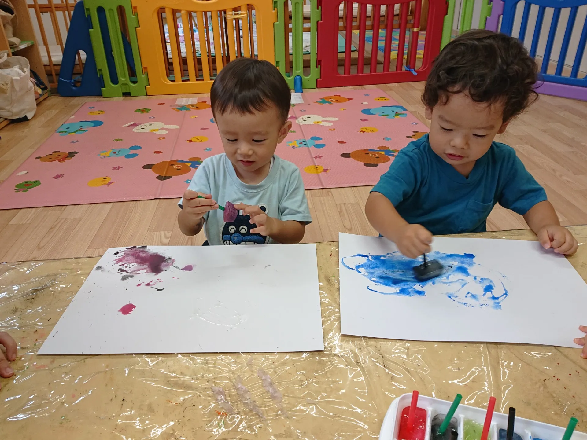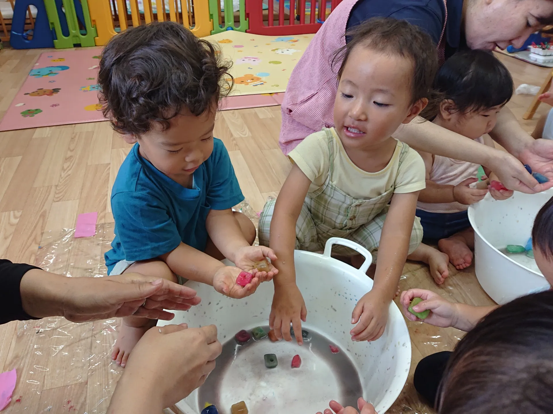 今日は、氷絵の具で遊びました。製氷器の氷絵の具に興味津々の子ども達。クレヨンやペンとは違い、氷が解けて色が出てくるので、スタンプのように押してみたりトントンと叩いて色を出してみたりと、工夫しながらお絵かきしていました。解けた氷は、タライの中で触ってみたり混ぜてみたりして、液体になるまで楽しむことができました♪