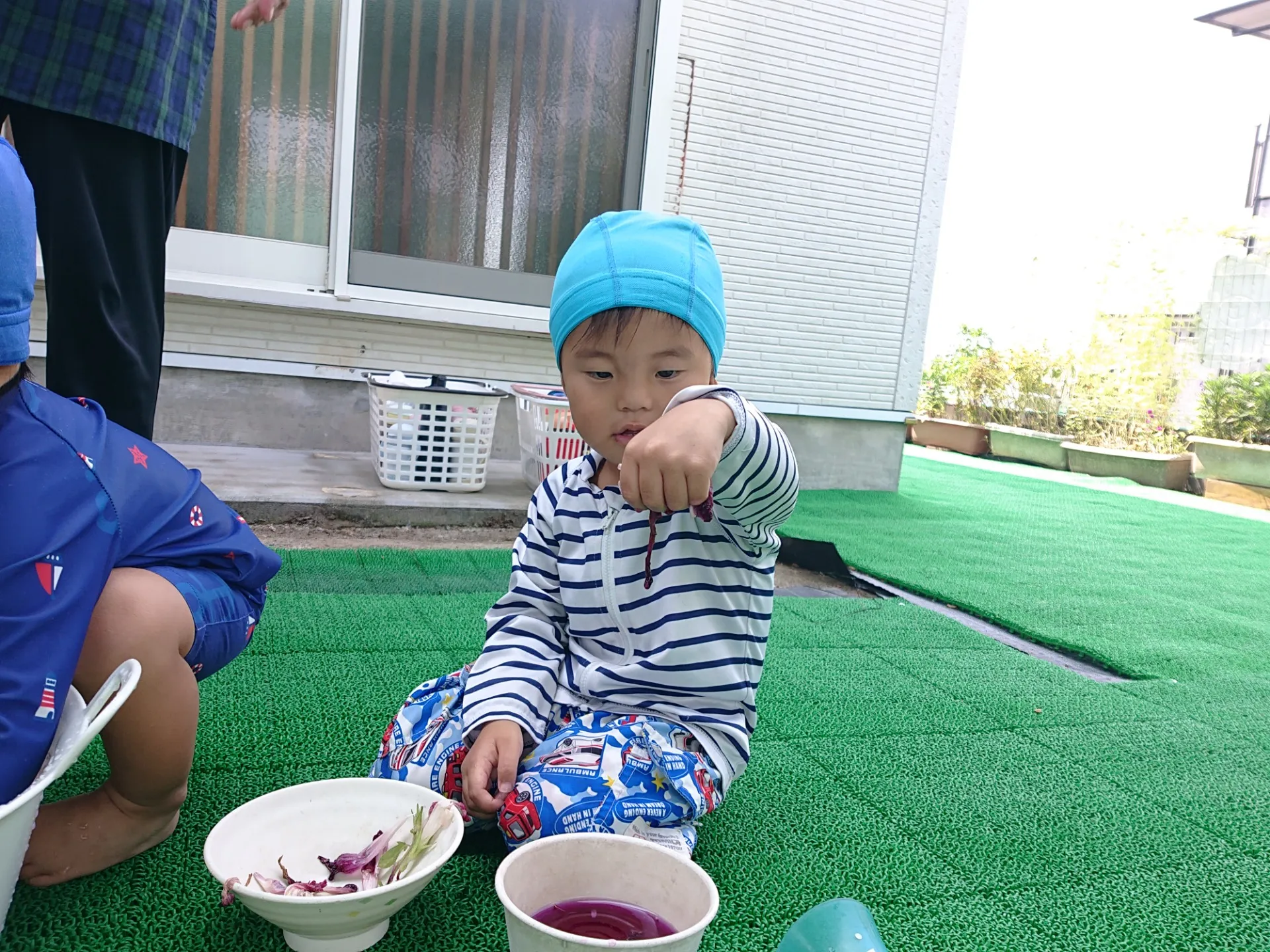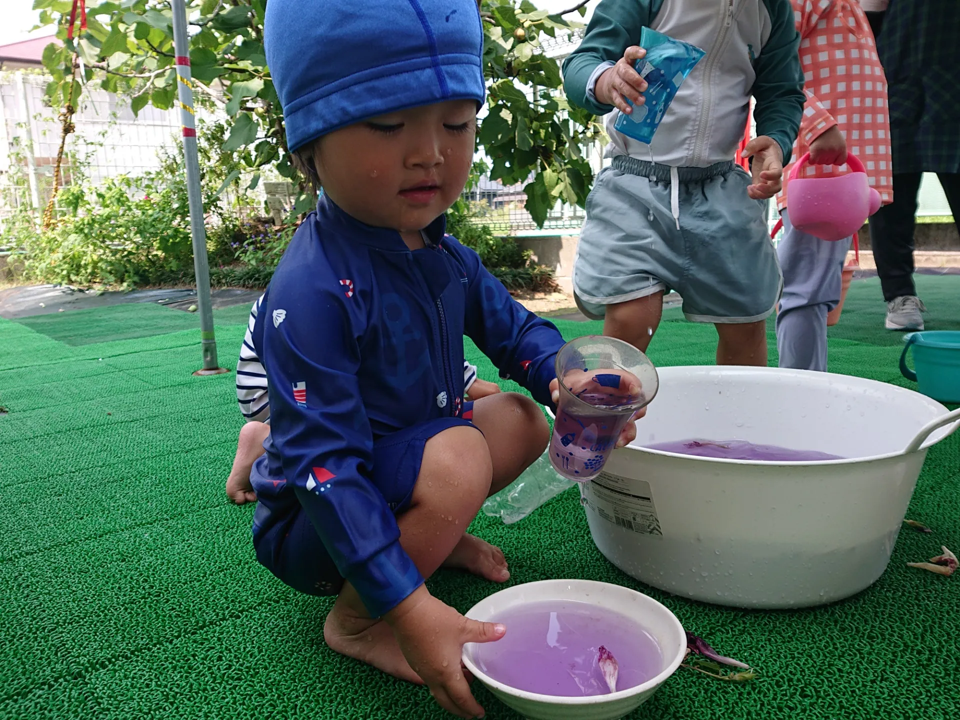 お休みはいかがお過ごしでしたか。お休み中の出来事をお話ししてくれるお友だちもいて、充実したお休みだったんだな~とほっこりした気持ちになりました。久しぶりに元気な子ども達に会えて嬉しかったです♡今日は、お庭で水遊びをしました。プランターの朝顔が満開で、お花を使ってジュースづくりを楽しみました♪