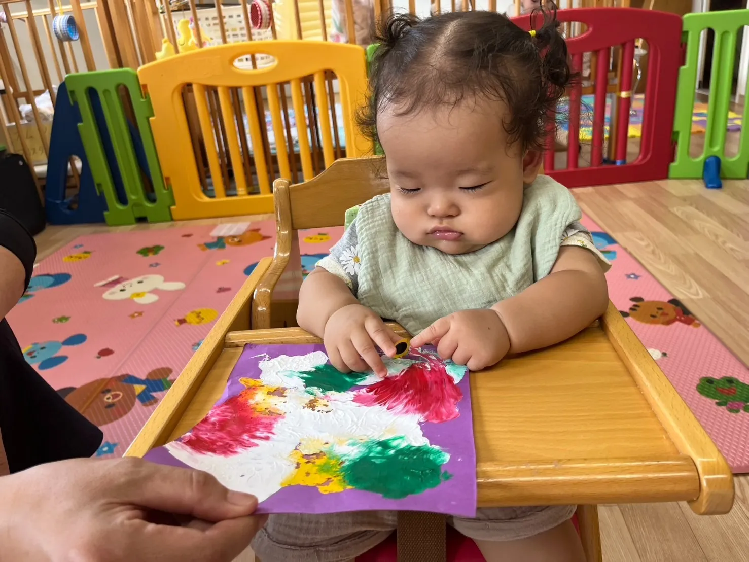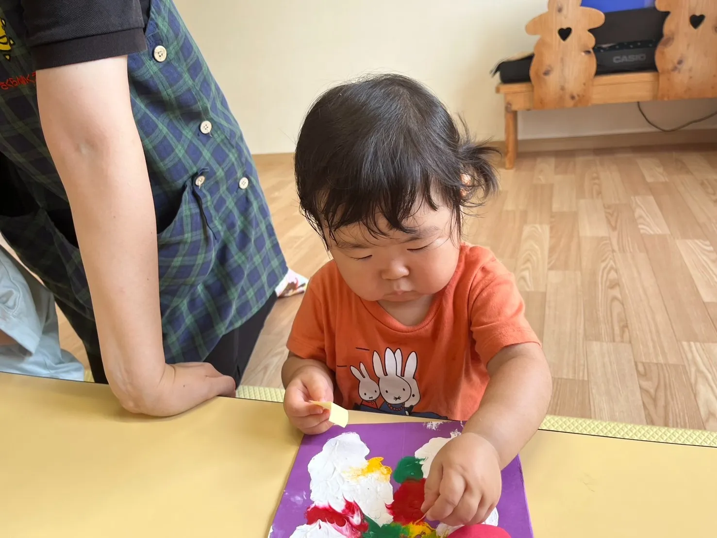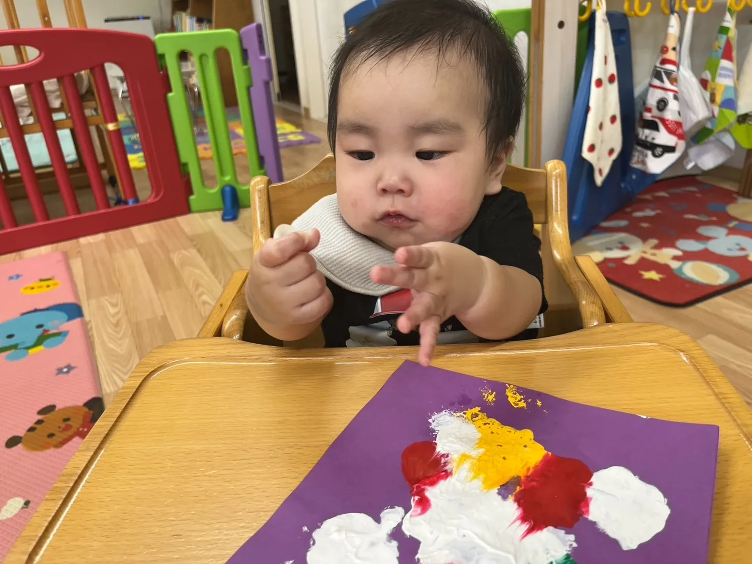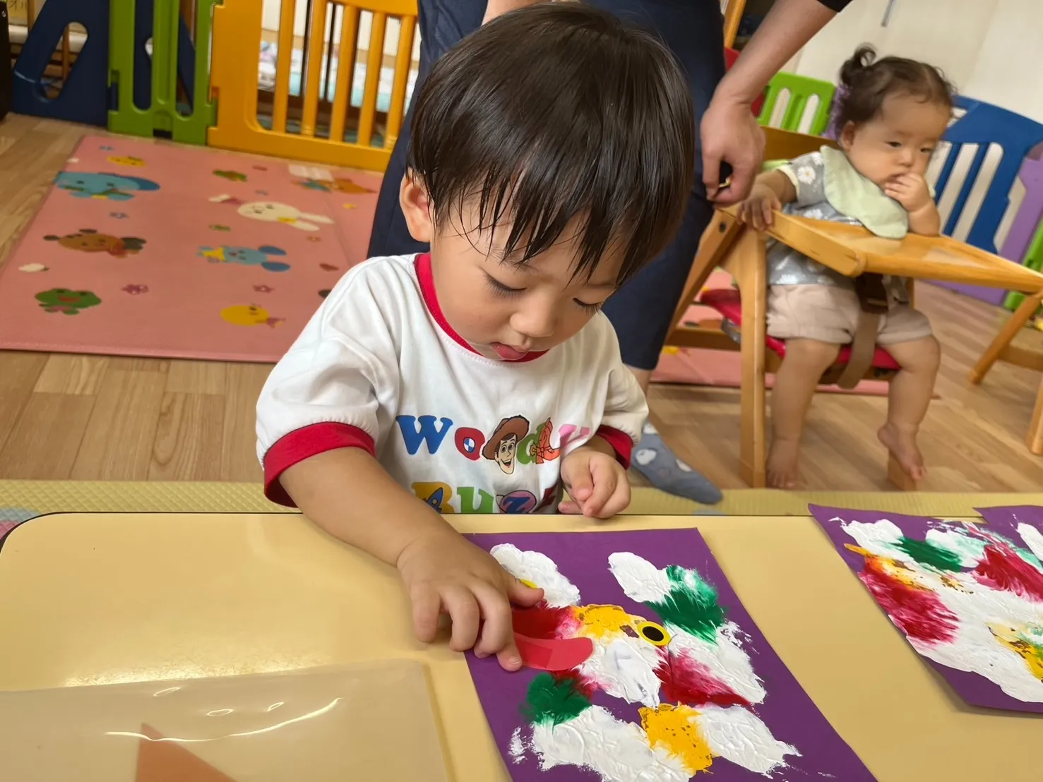 先日の感触遊びで作った不思議な模様に、目や口のシールを貼って「おばけ」を完成させました。少しずつ指先が上手に使えるようになってきた1歳児さんは、保育士の援助がなくても一人でシール貼りが出来るようになってきました。0歳児さんも、手に付いたシールを自分で剥がしてみようと小さな手を一生懸命動かしていてかわいいです♡
