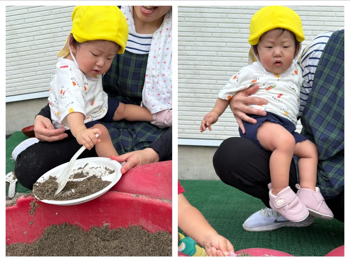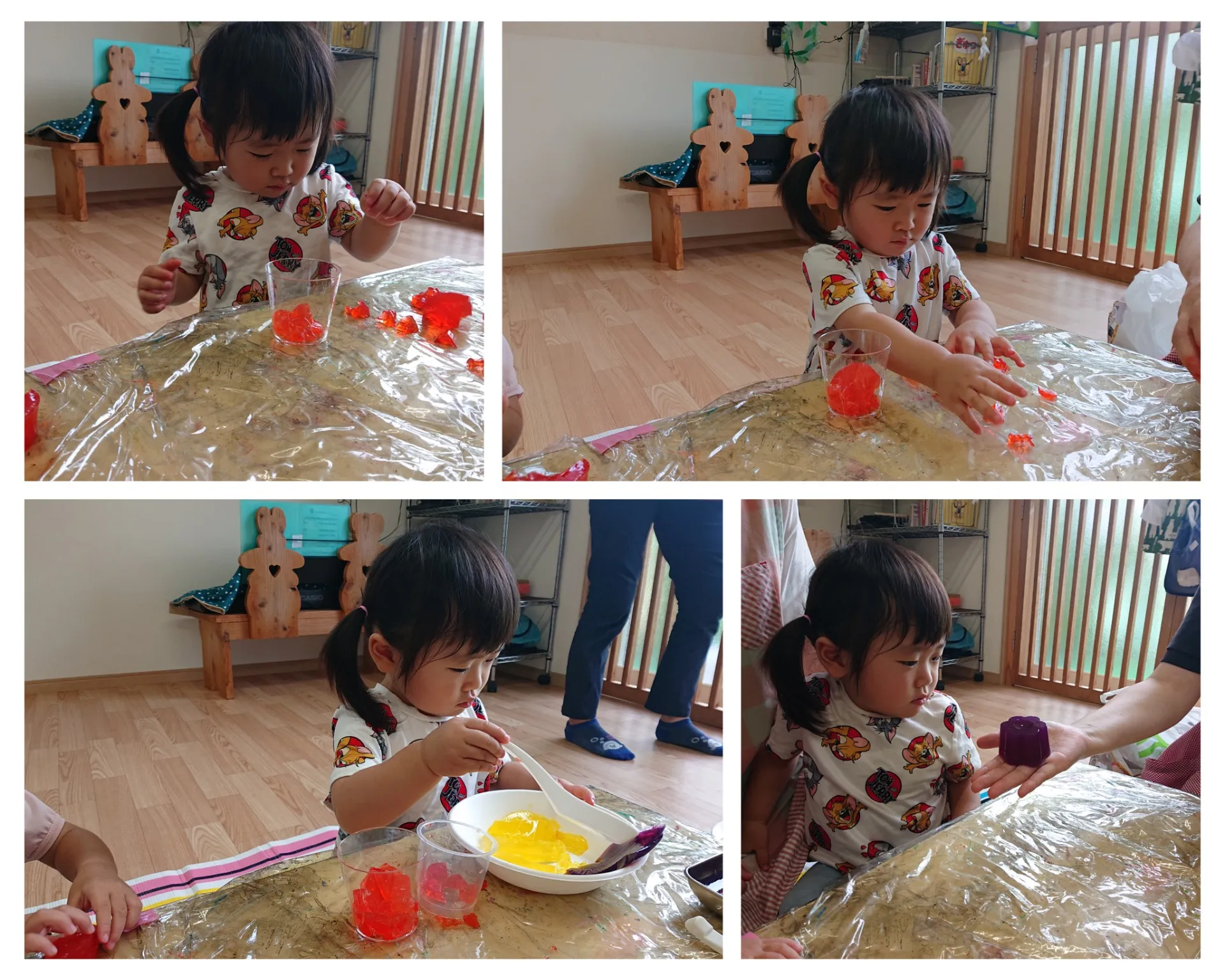 今日は、寒天あそびをしました。カップやトレーに入った赤、緑、黄色、紫、茶色の寒天が色鮮やかで、子ども達も興味津々!指先でつまんでカップに出し入れしたり、スプーンですくってお料理ごっこをしたりと長い時間楽しめていたいちご組さんでした♪