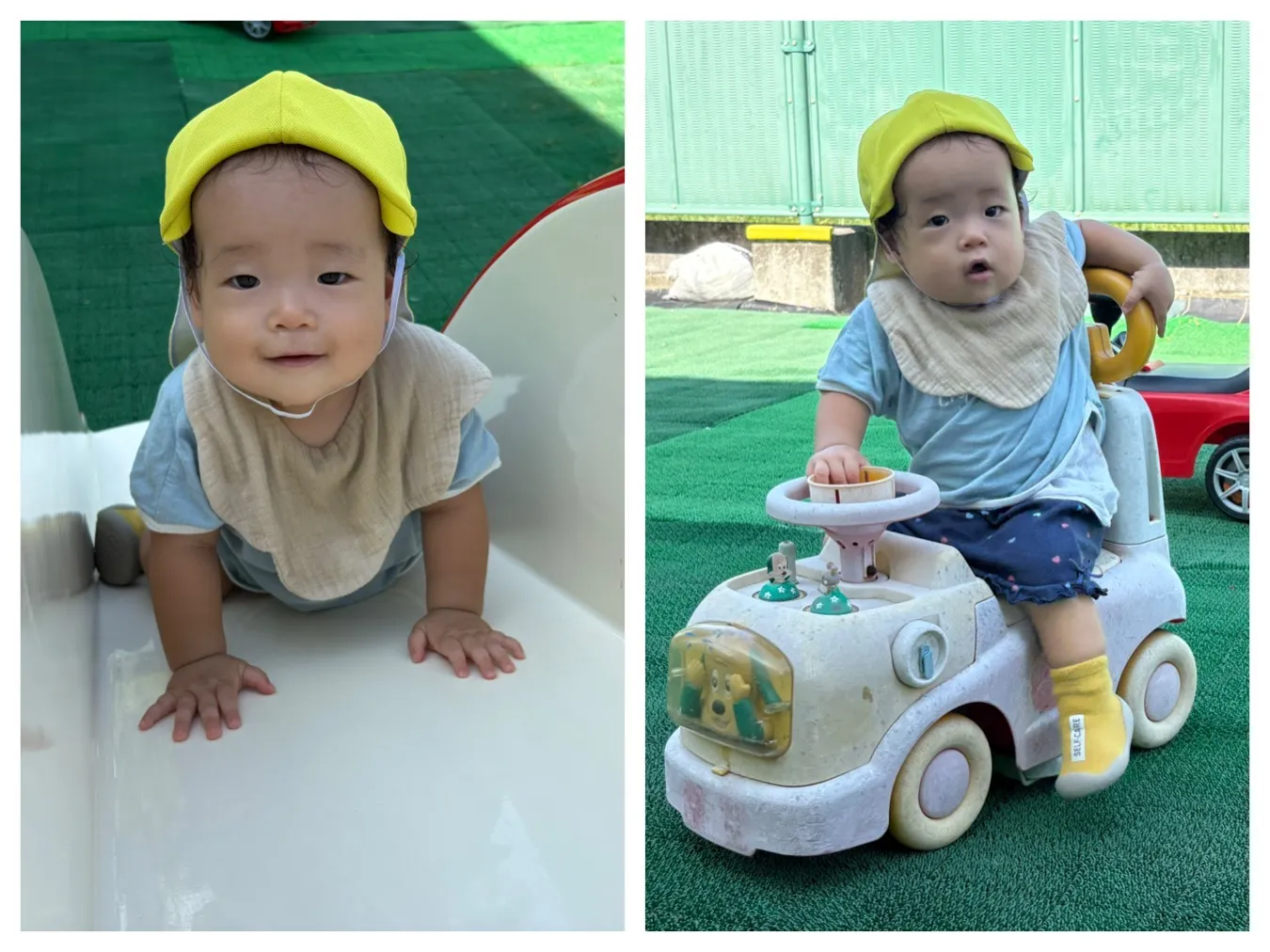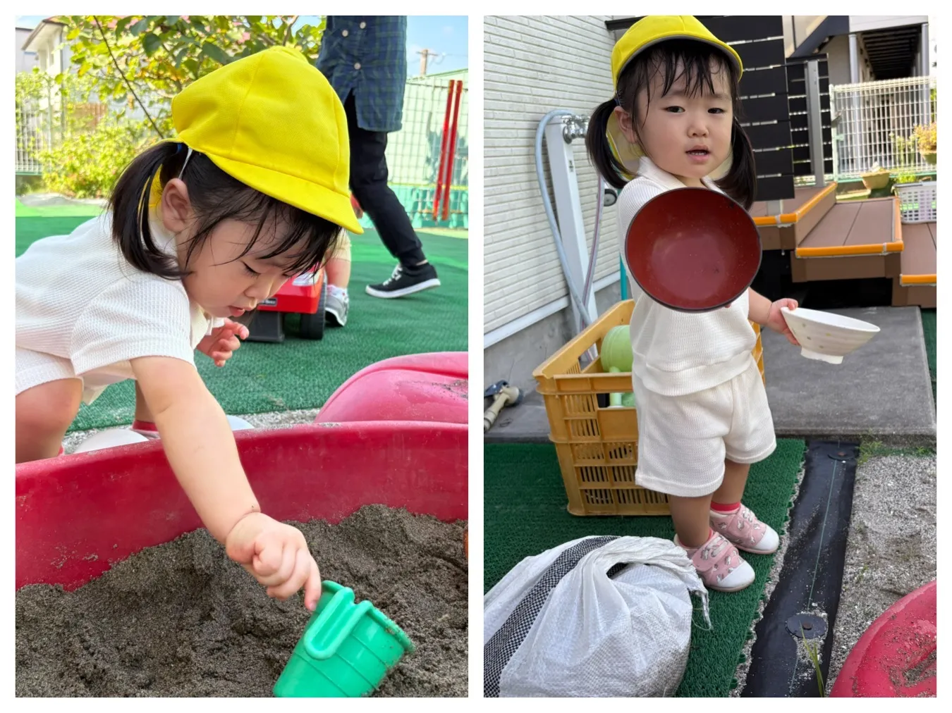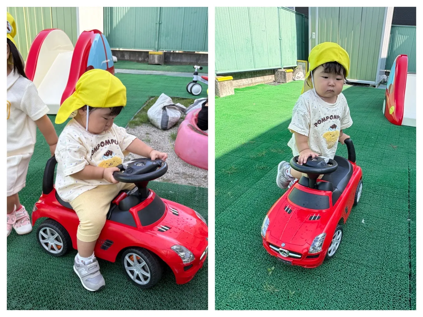 今日は西側の園庭で遊びました。今日は、またまた日差しが厳しくなって西側の日陰は涼しく感じました。車の乗り物を押したりのったり、、滑り台や砂場を楽しんでいました。水分補給もこまめにして体調管理にも気を付けながら遊びました。