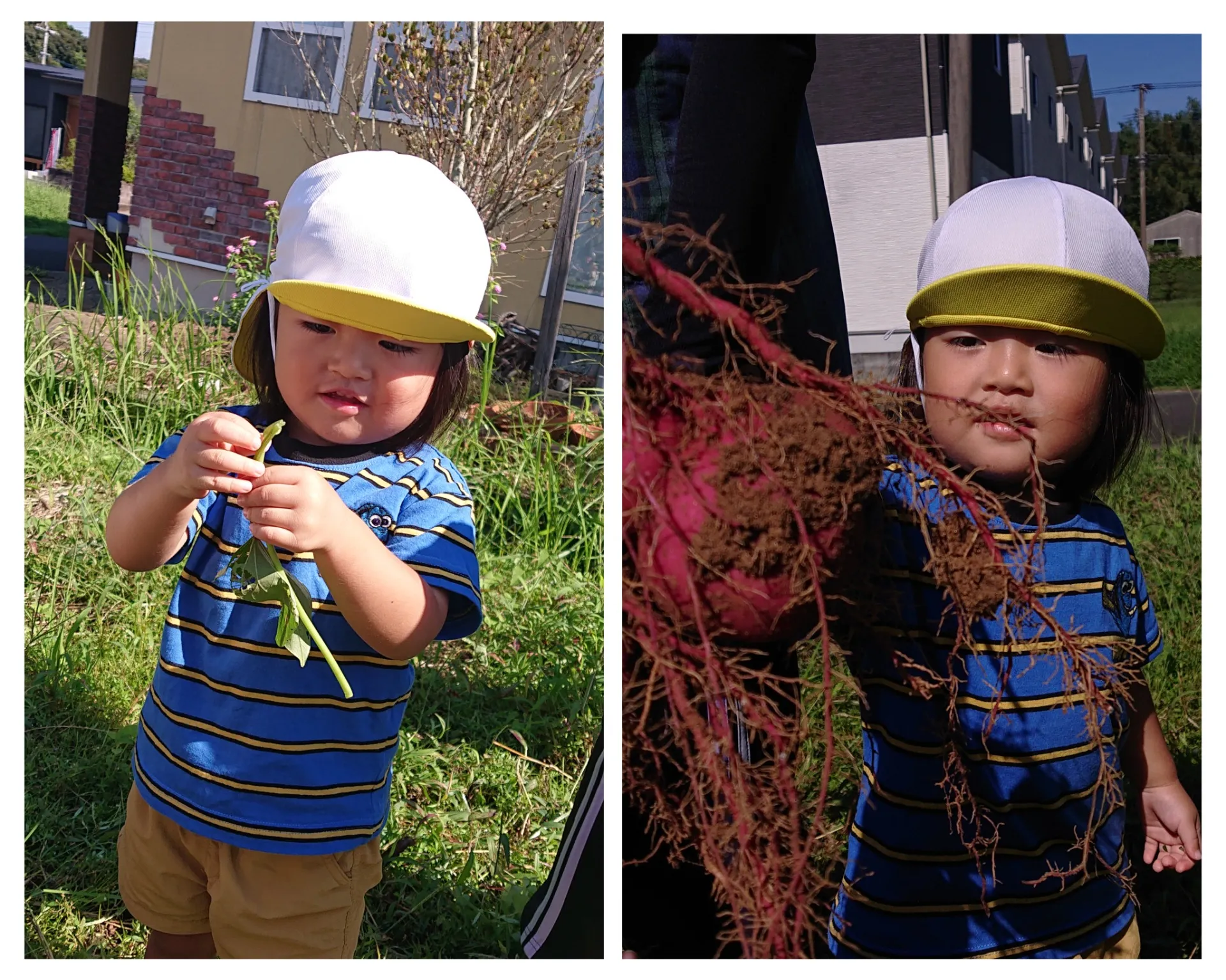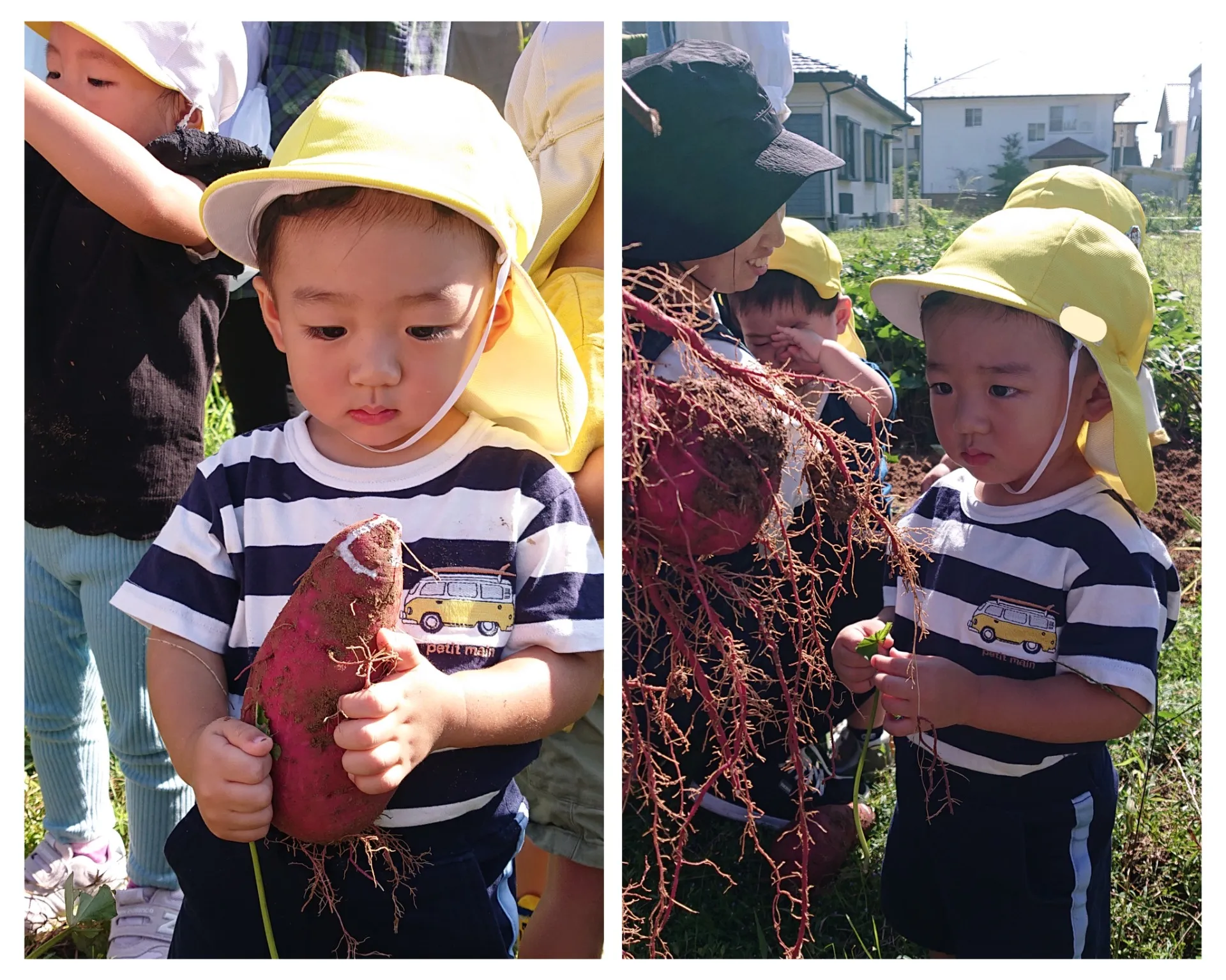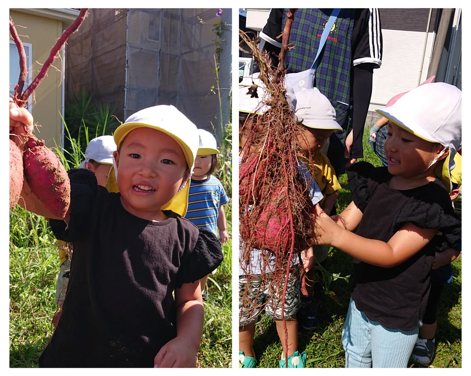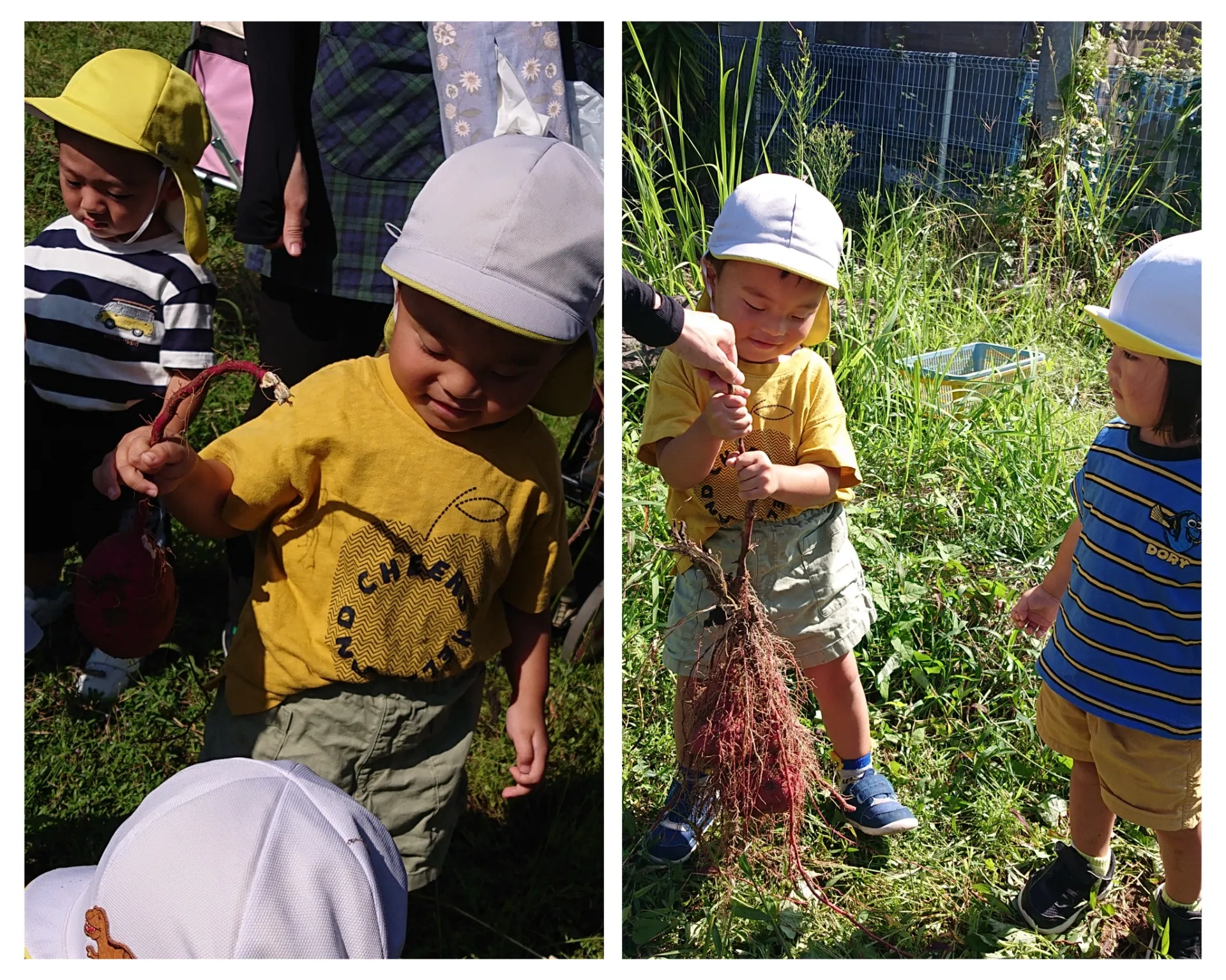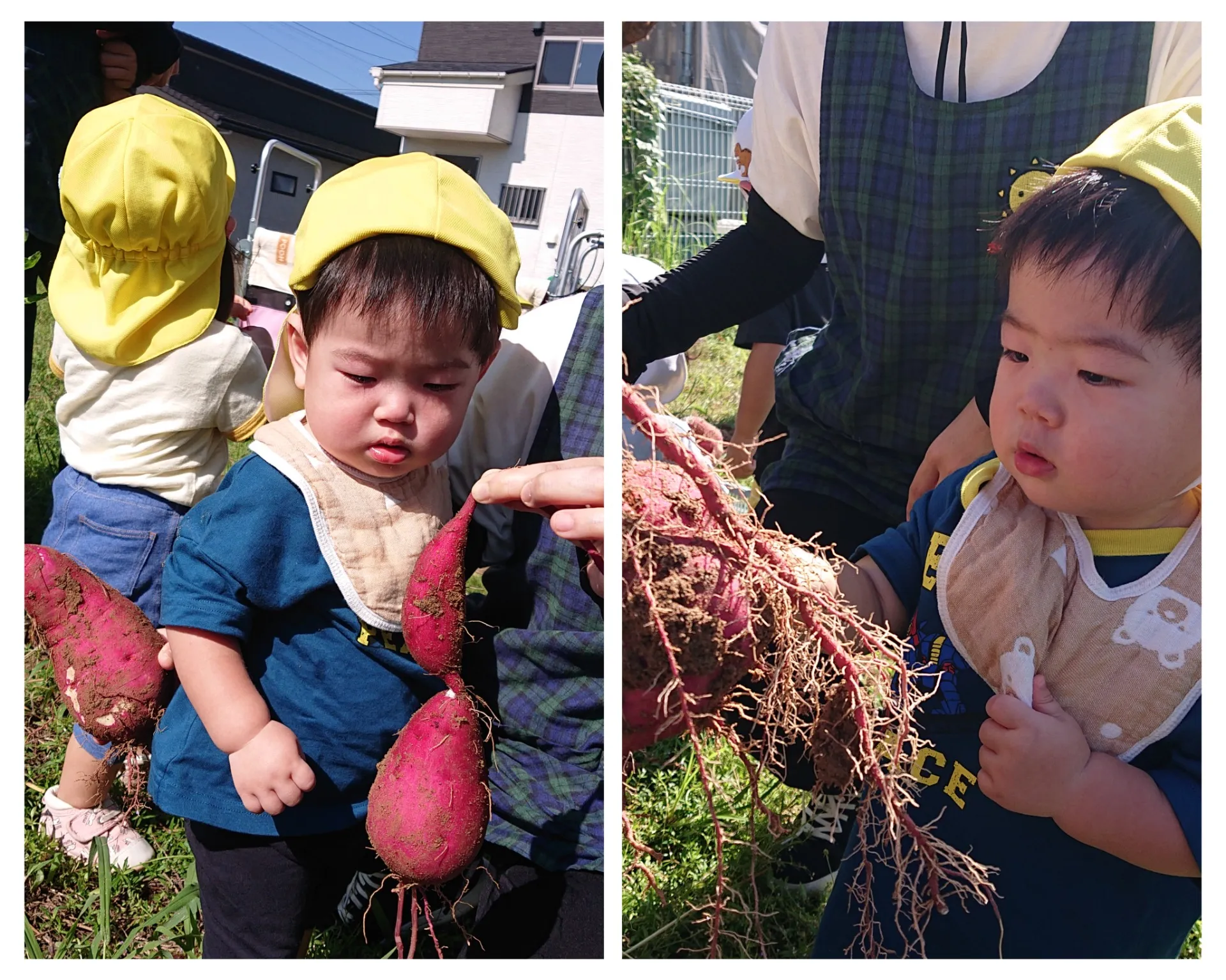 5月に植えたお芋が、大きくなっているかな?と試し堀りするところを見せてもらいました。大きなお芋や細長いお芋、赤ちゃんお芋など…いろんな形のお芋が出てきて、みんなとっても嬉しそうでした♪来週のお芋堀が楽しみです♪