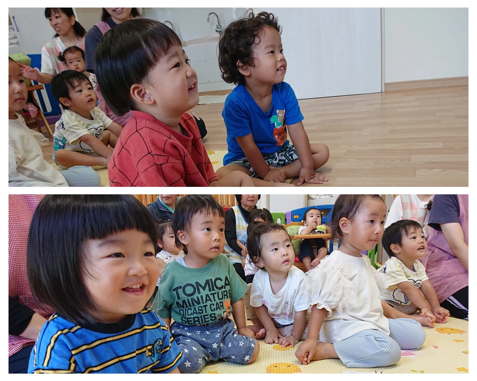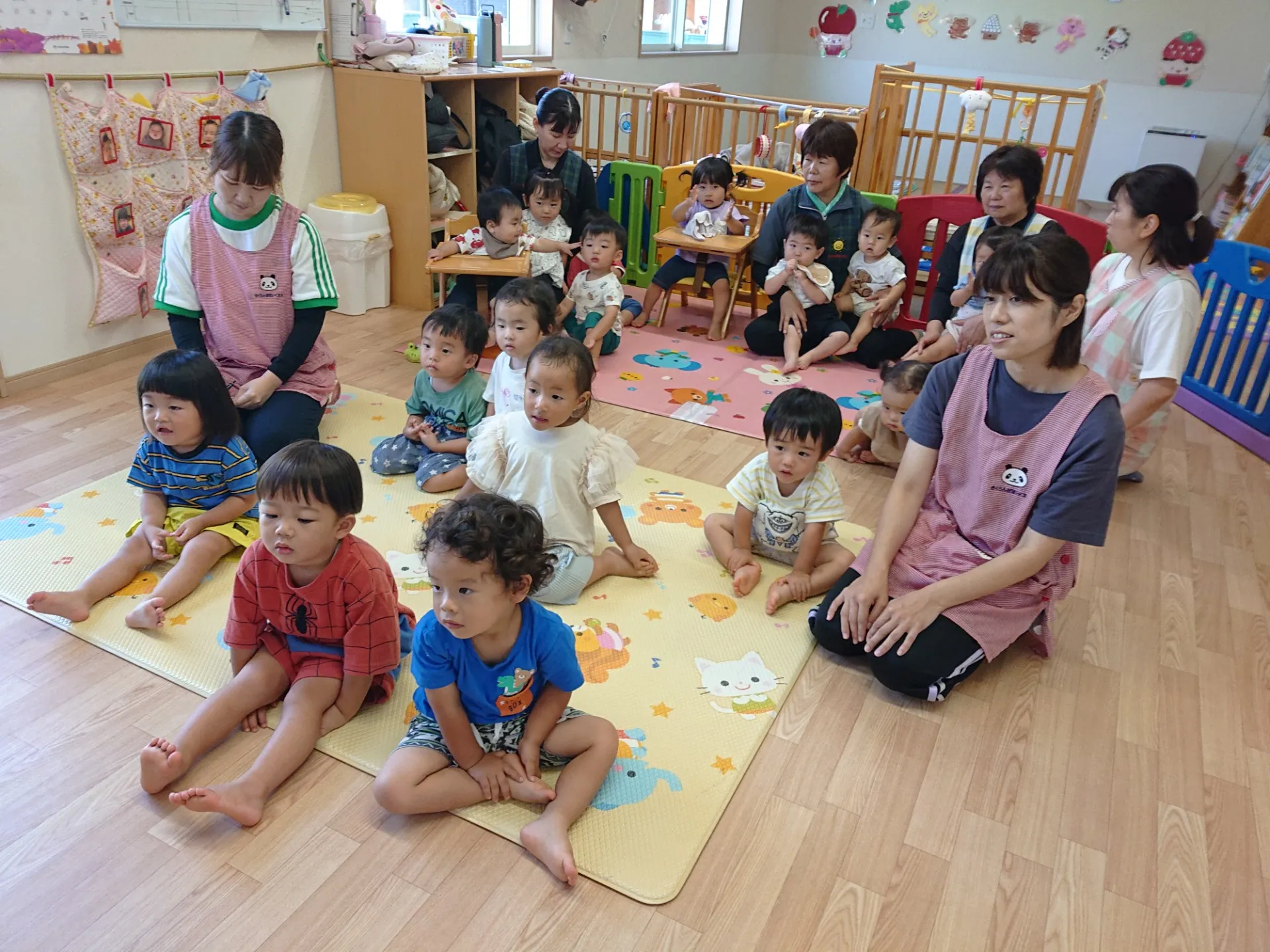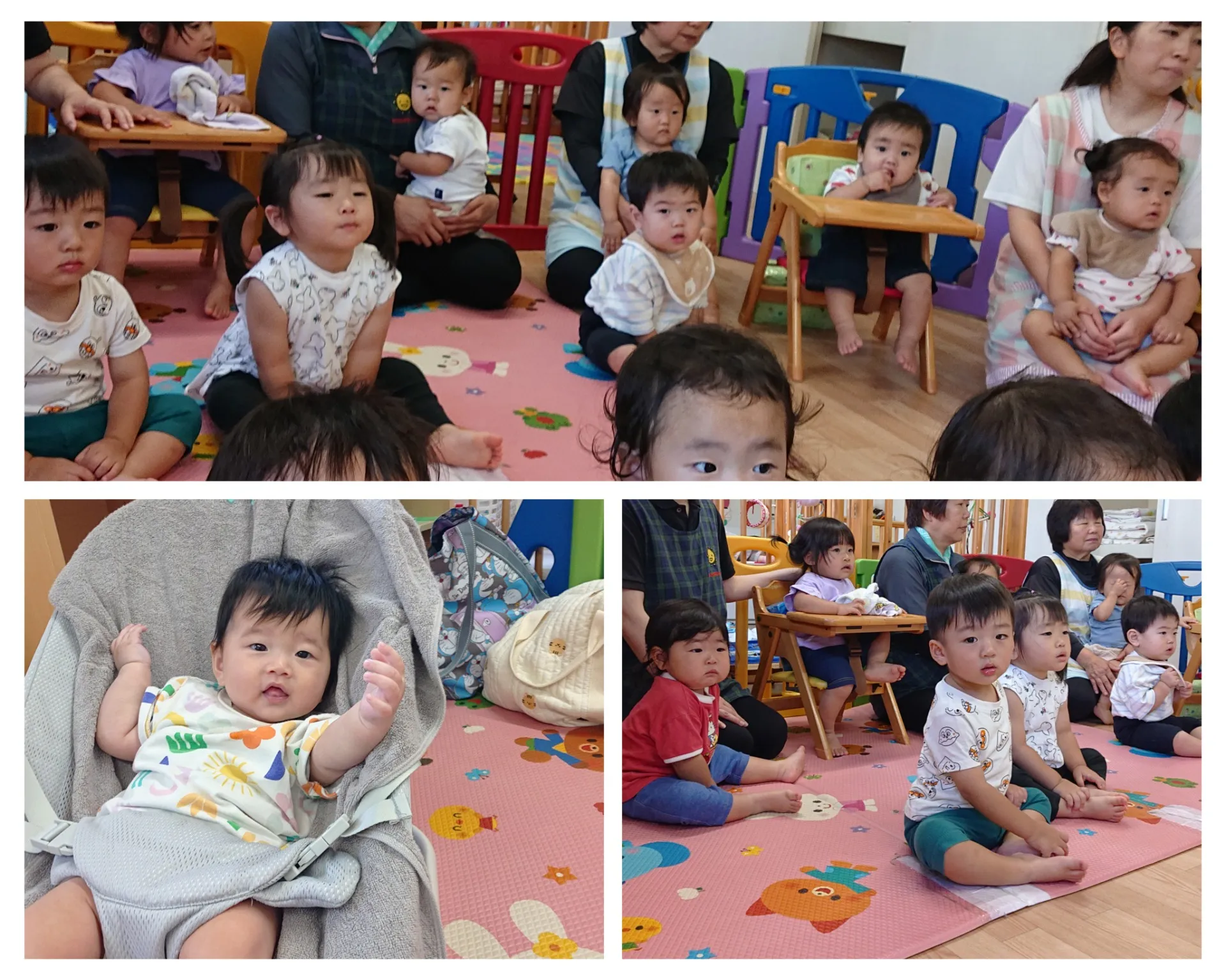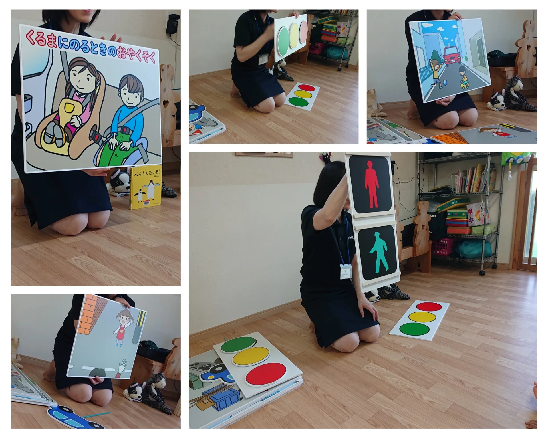 今日は、交通安全協会の方が来られて交通安全についてお話をしてくださいました。「横断歩道を渡る時の合言葉”トントンとーまれ、シャキーン”」「車に乗る時はシートベルトカッチン」「道路を渡る時は必ず左右を確認しましょう」など…。たくさんの大切なお約束を教えてもらいました。これから秋になるとお散歩にでかける機会も増えるので、今日のお約束を守って、楽しく安全にお散歩に出掛けたいと思います。