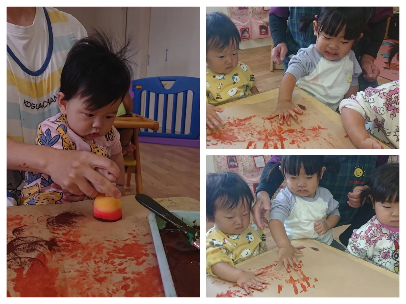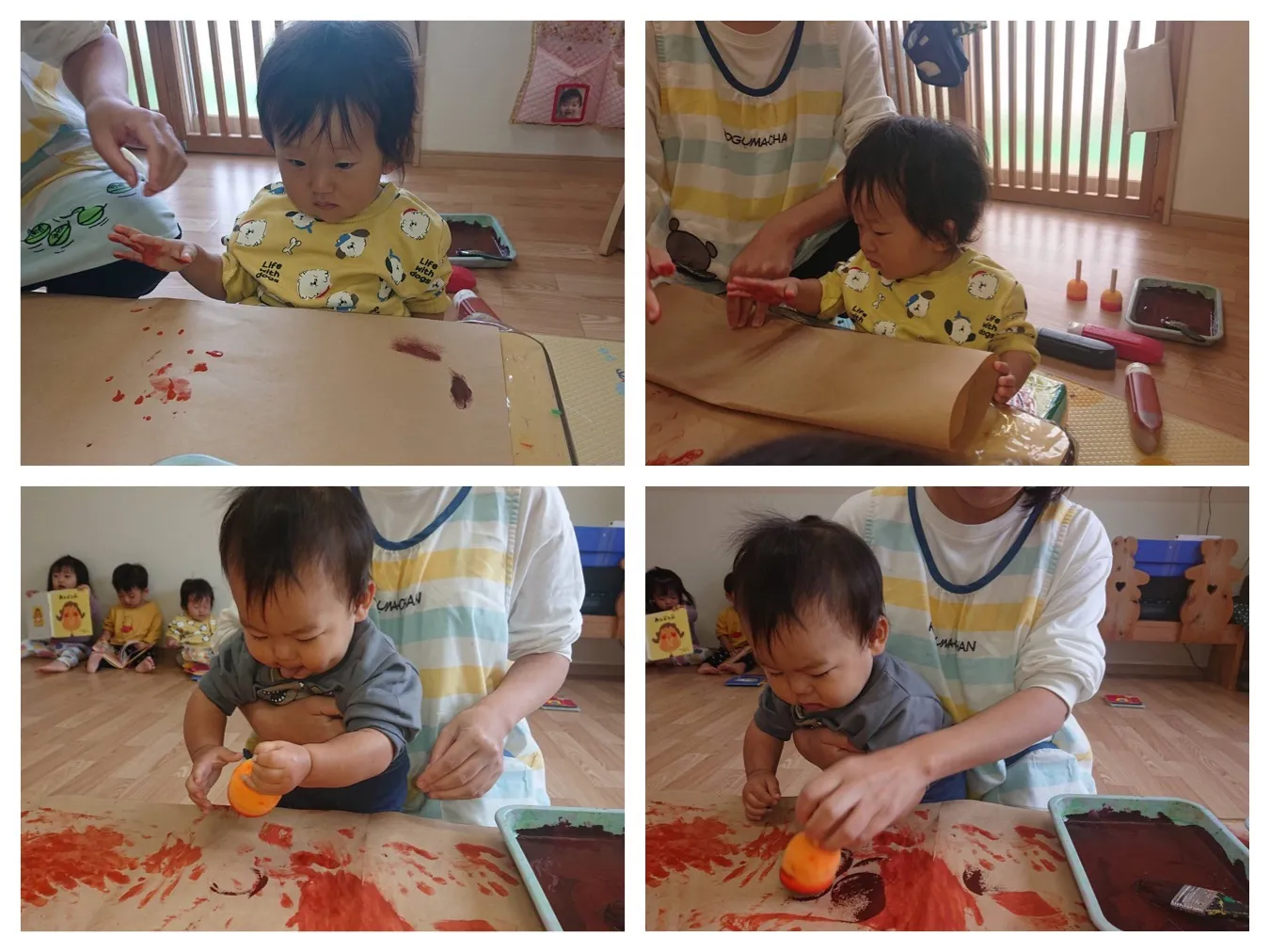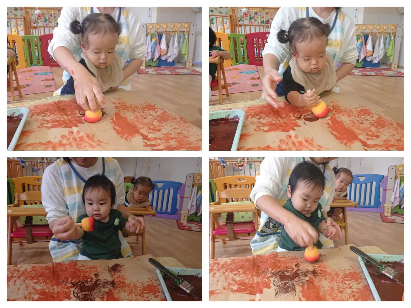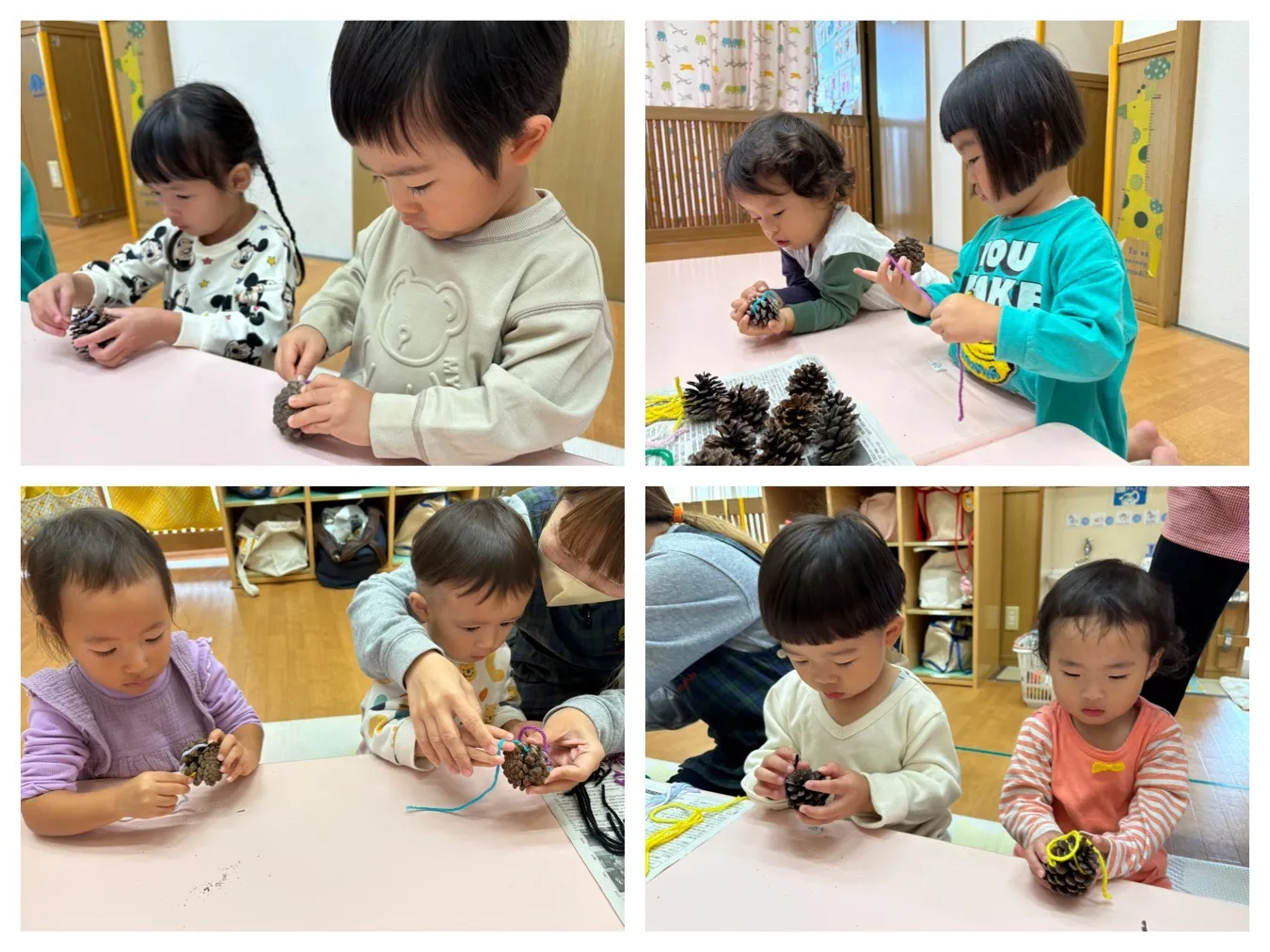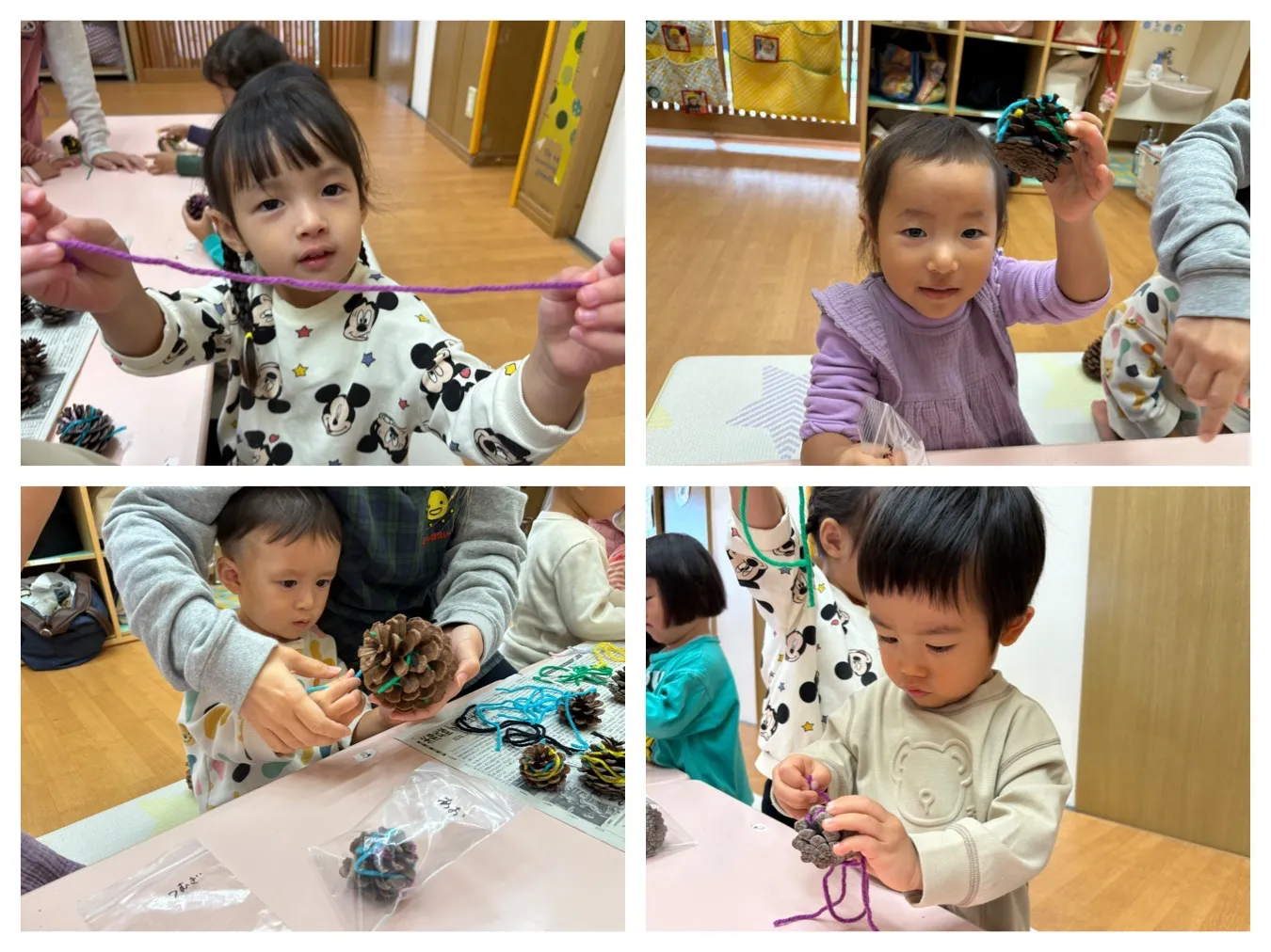 今日は、各クラスとも、「育英コミュニティーの文化祭壁面の製作をしました。タンポや手形でスタンピングをした”いちご組さん”や、松ぼっくりに毛糸のお洋服を着せ、目をはった”りんご組さん”、、各クラスで作ったものが一つになって素敵な製作が完成しそうです。11月9日(日)~11月14日(金)まで、「育英コミュニティーセンター」で展示いたしますので、ぜひご覧になってくださいね。