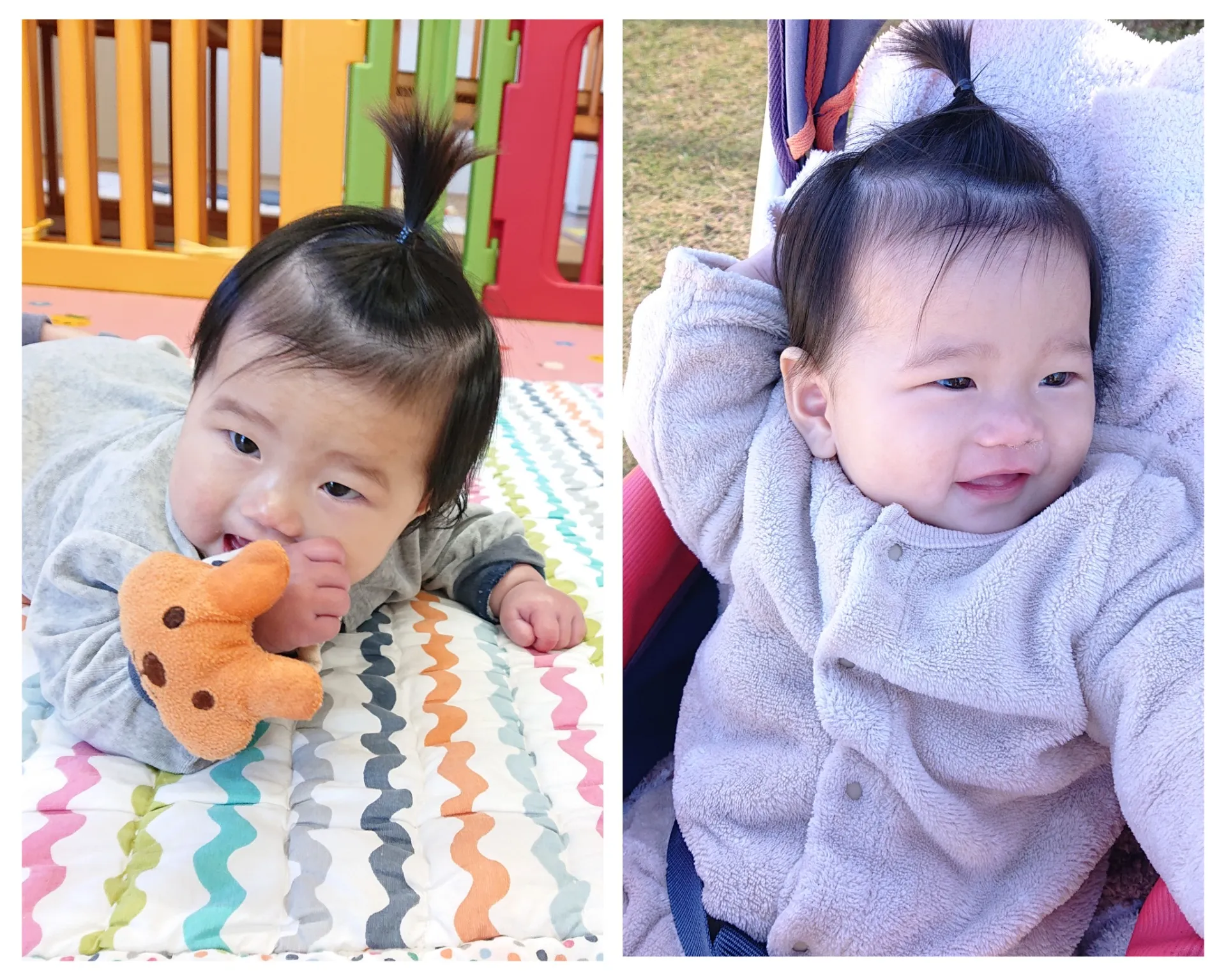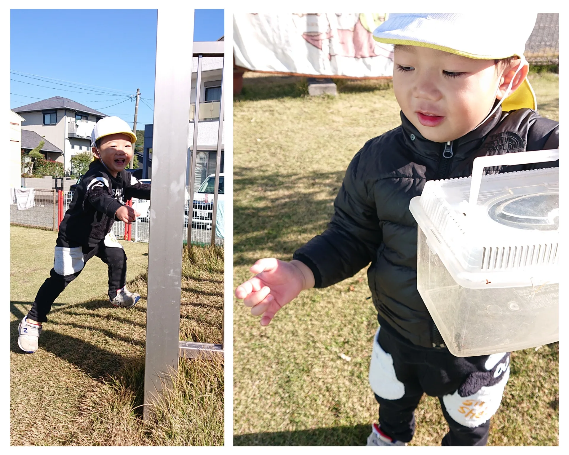 朝晩は冷え込む日続いていますが、日中はぽかぽかお日さまが気持ちよく、広場で元気に遊びました。虫やどんぐり探しをしたり落ち葉を集めてみたりと、季節の遊びを満喫しました。