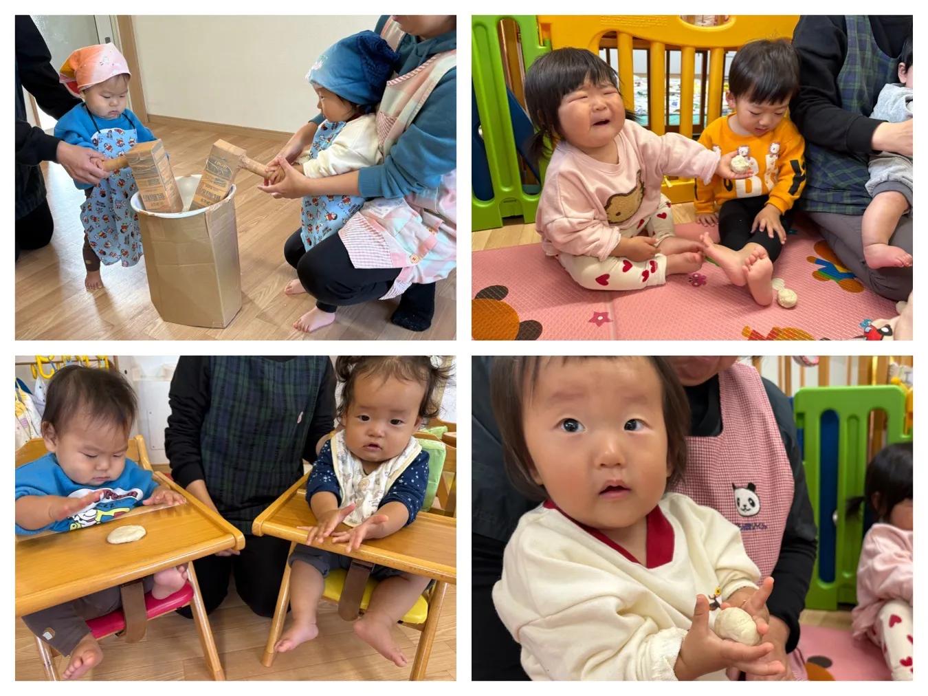 今日は11月の誕生会と身体測定がありました。りんご組さんのお友達のお誕生日をみんなでお祝いしてから、お正月に向けてお餅つきをしました。「ぺったんぺったん」と掛け声をかけながら沢山のお餅がつけました。