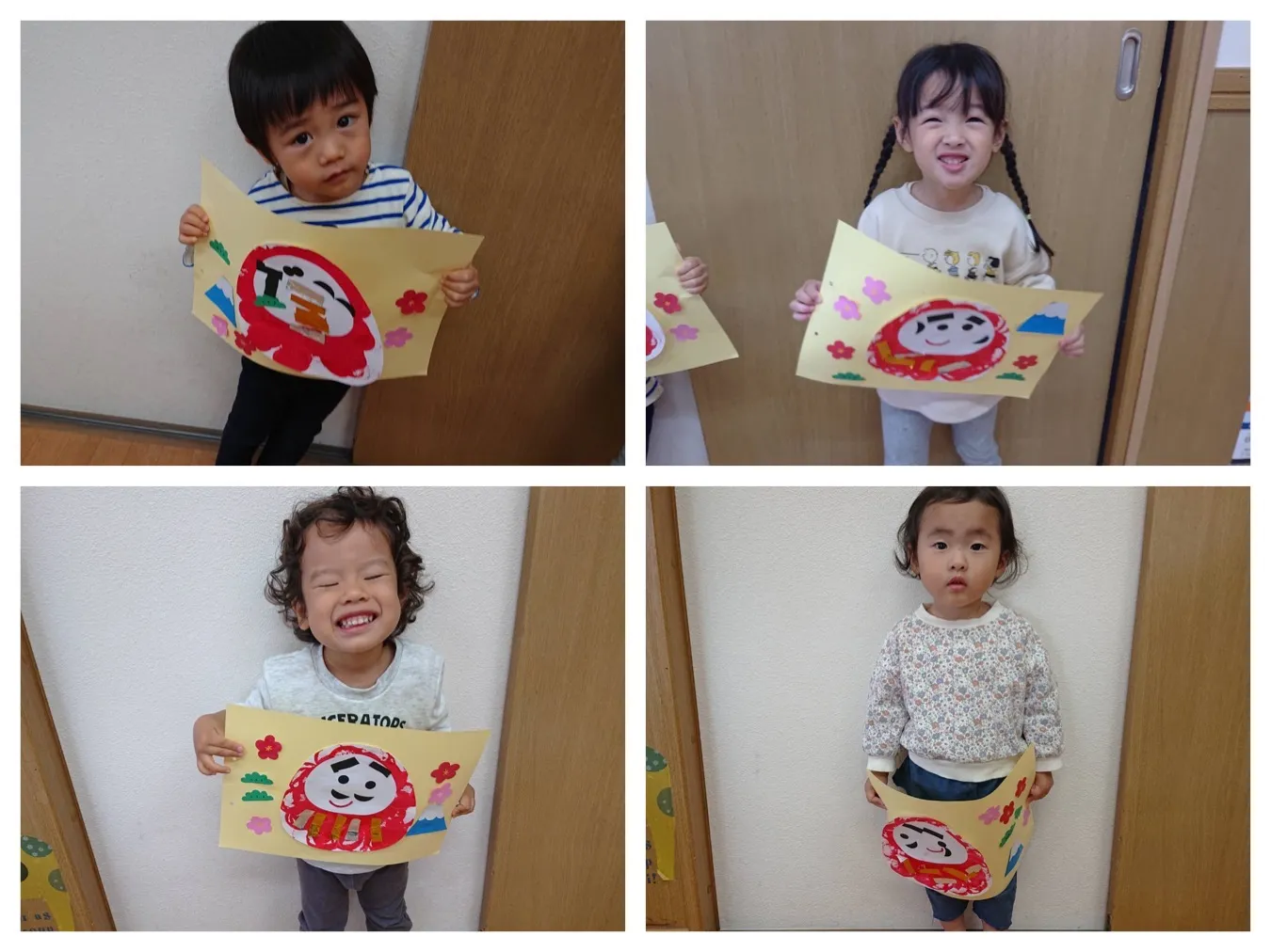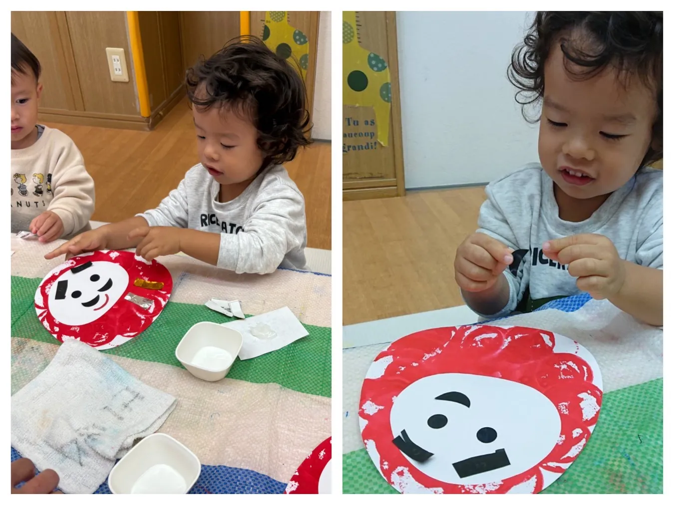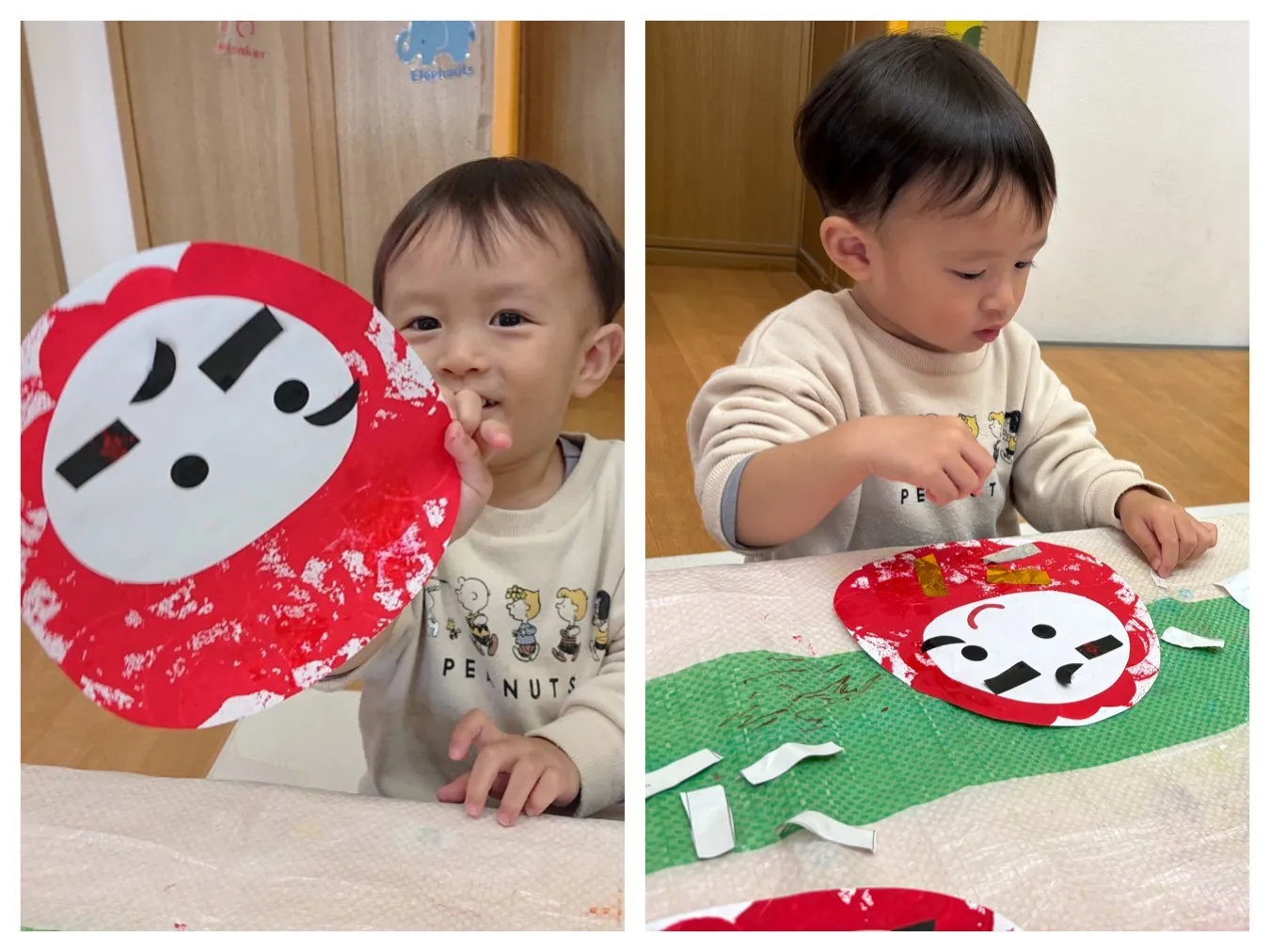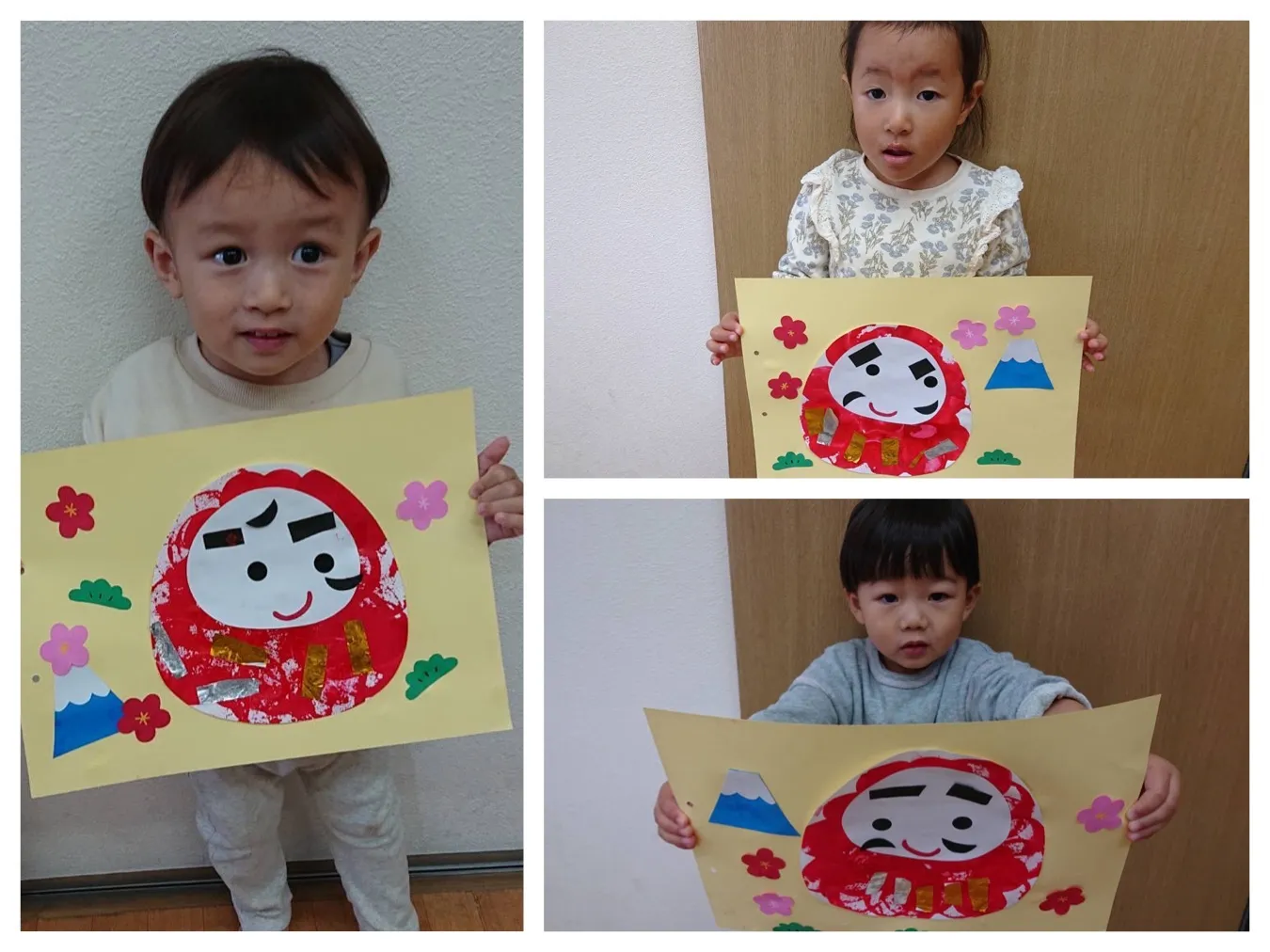 今日は、1月の製作をしました。タンポでだるまの形に色を付けたものに、目や眉毛、ひげなどを付けていきだるまの完成!台紙に貼ってまわりに飾りも付けました。子ども達によいお正月が迎えられそうです。