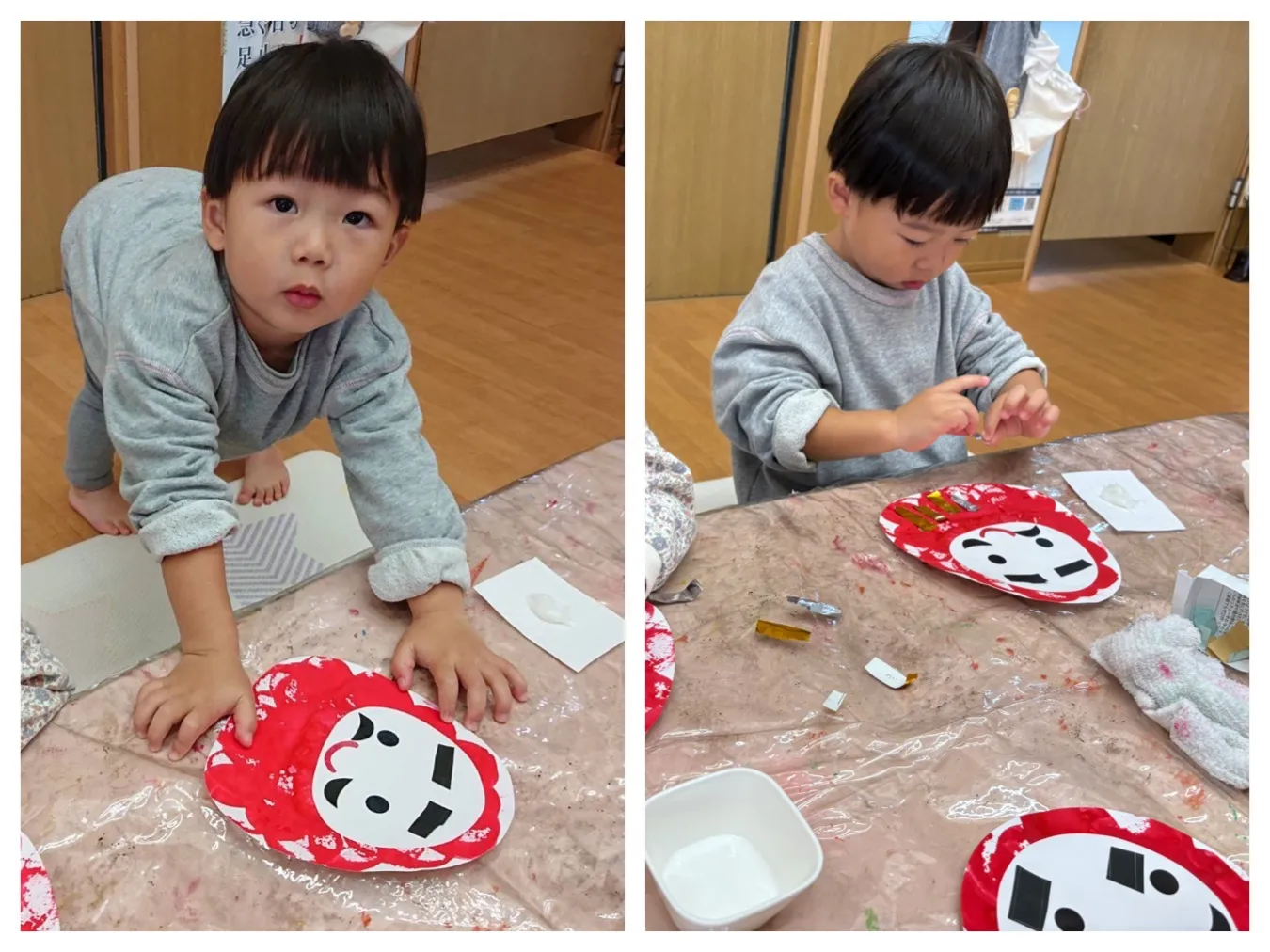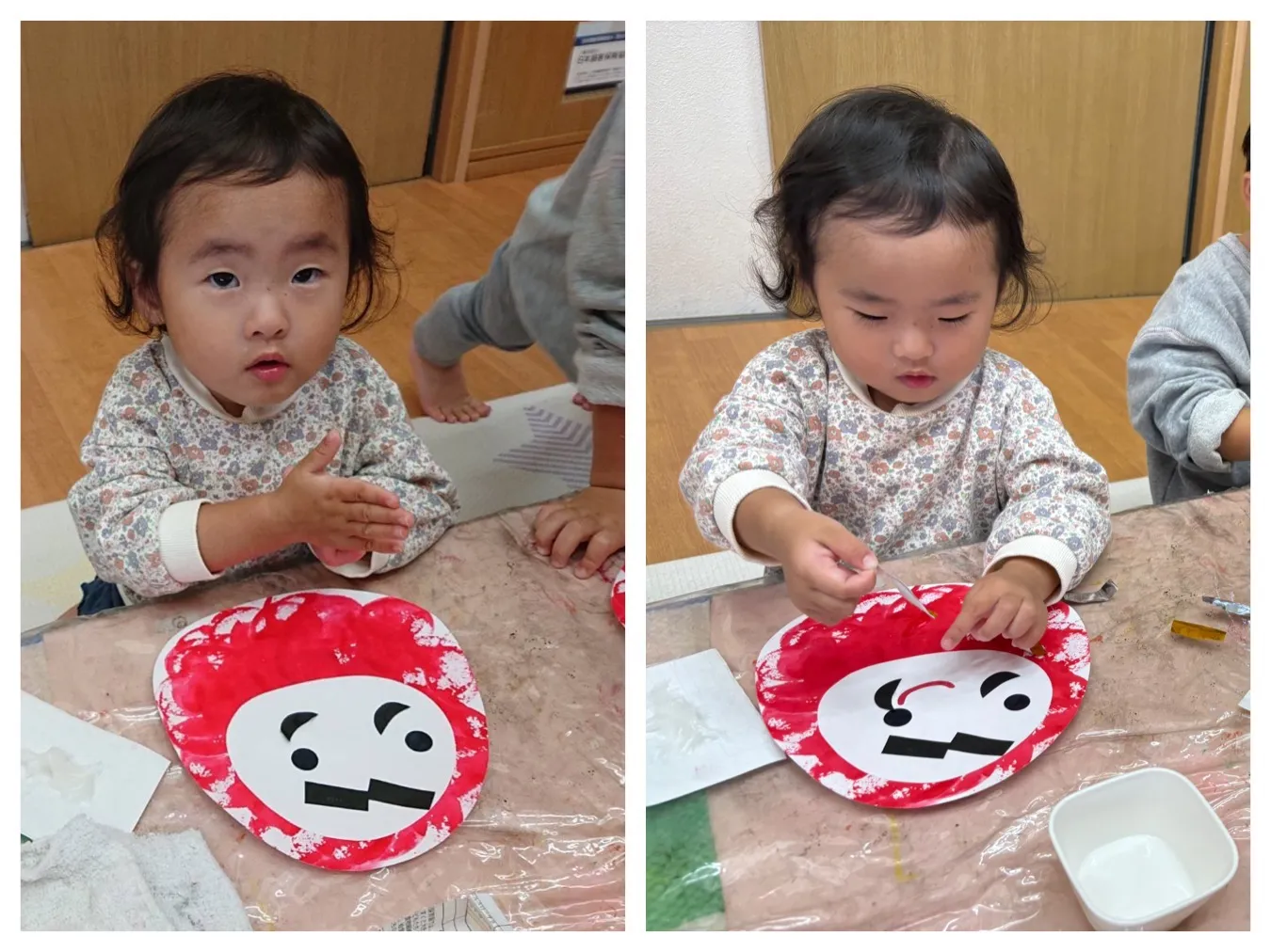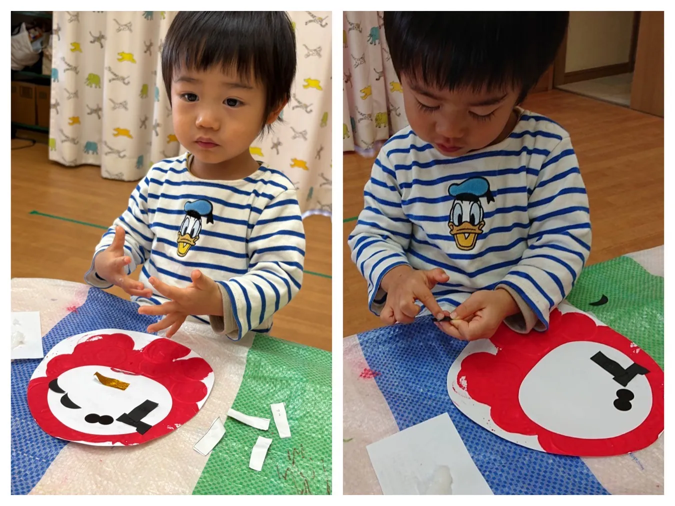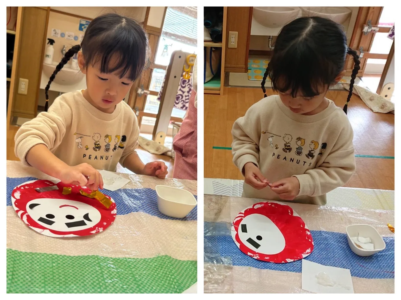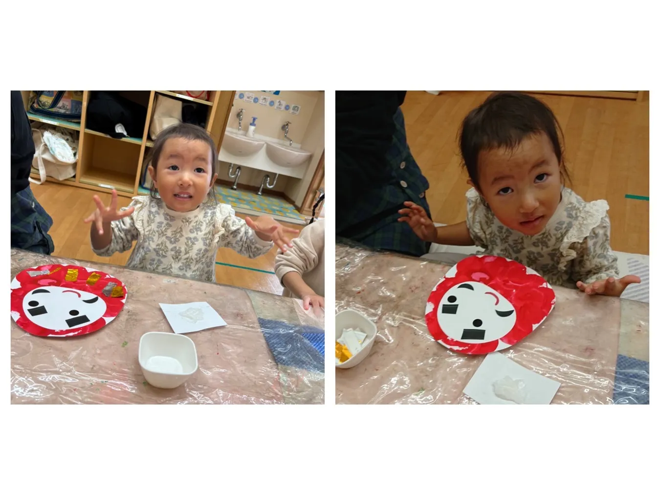 今日は、1月の製作をしました。タンポでだるまの形に色を付けたものに、目や眉毛、ひげなどを付けていきだるまの完成!台紙に貼ってまわりに飾りも付けました。子ども達によいお正月が迎えられそうです。