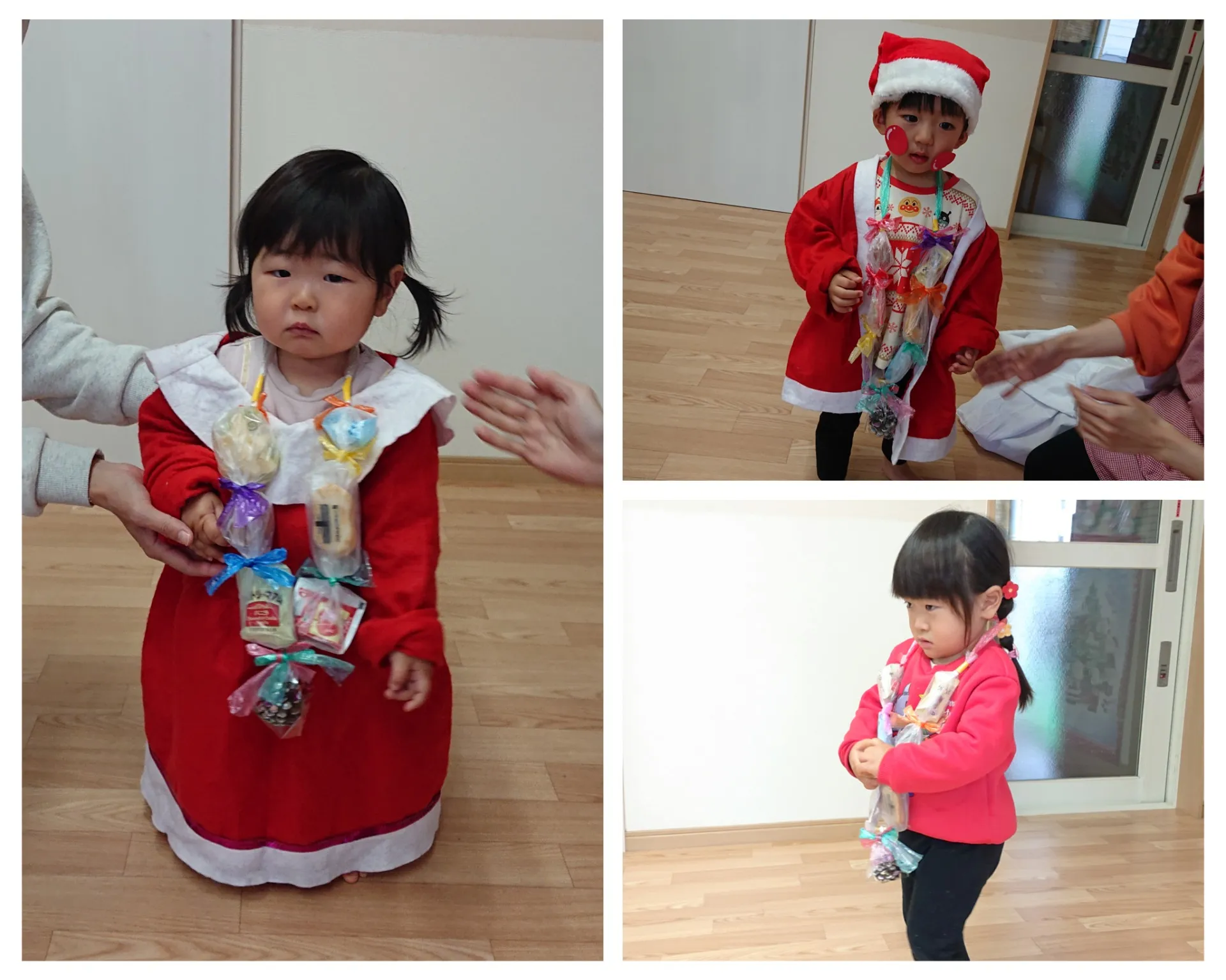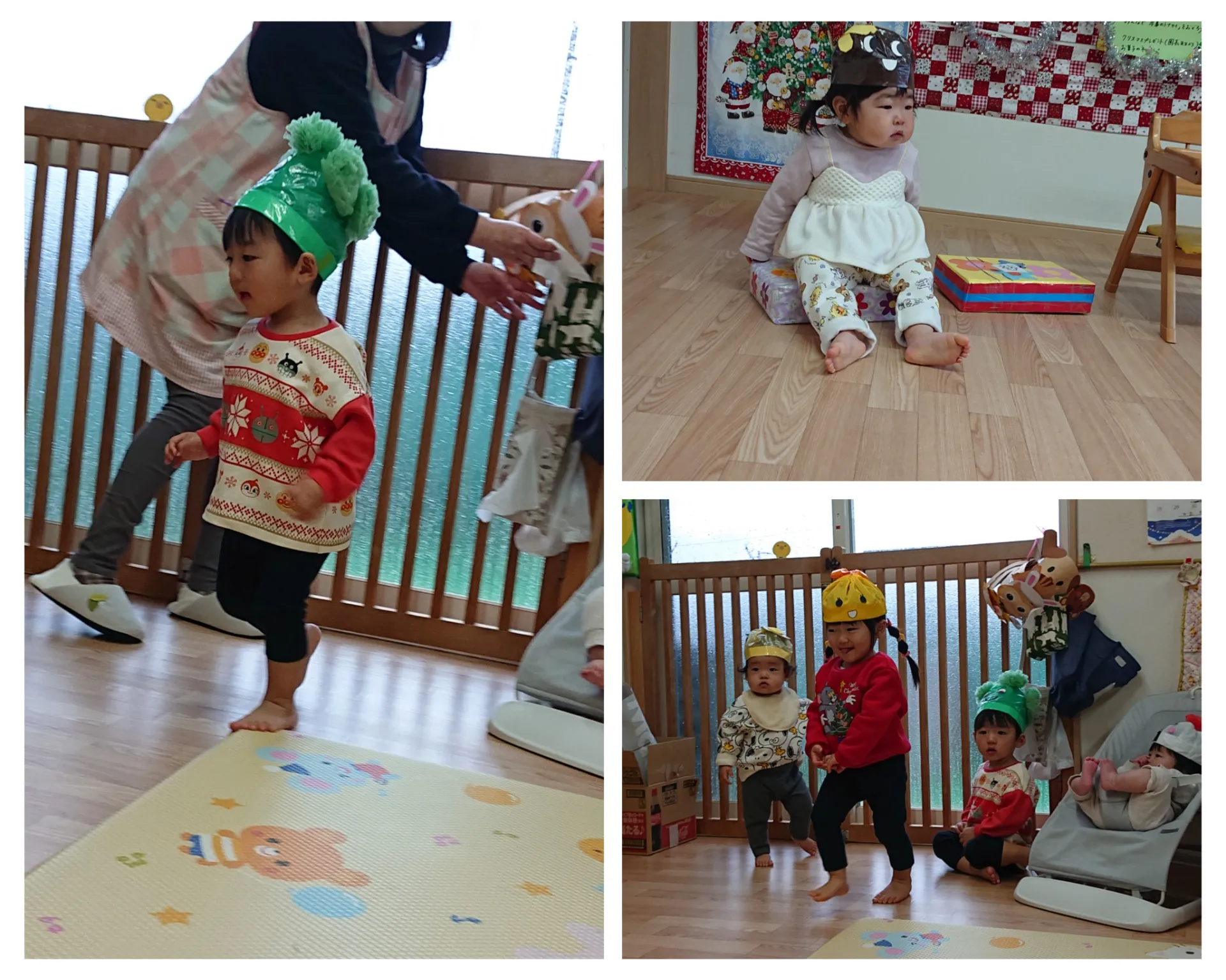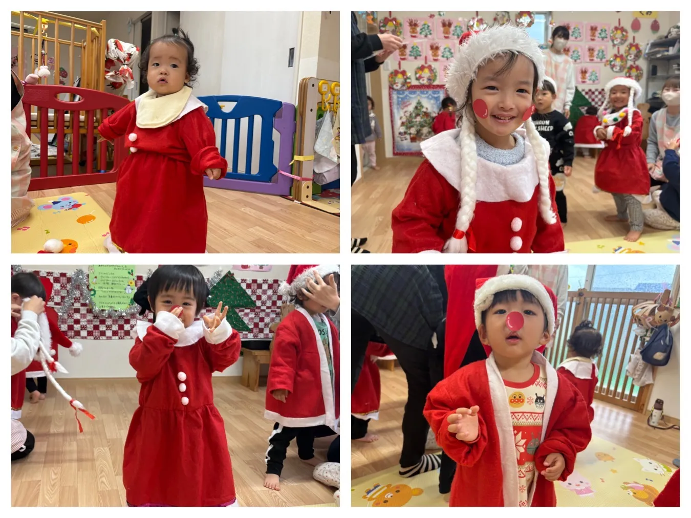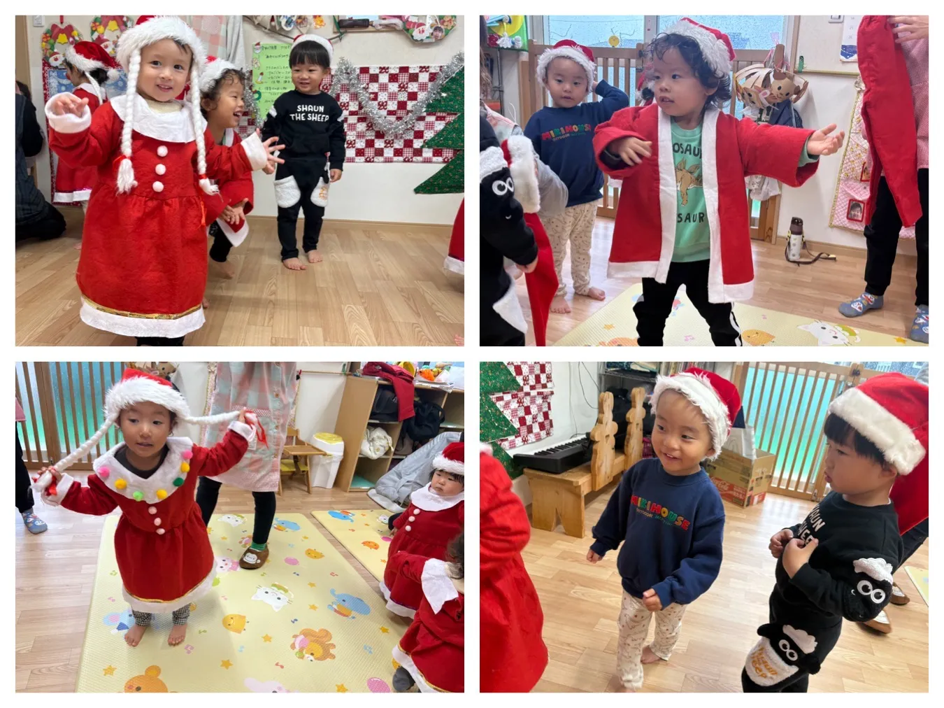 他にも、みんなでクリスマスソングを歌ったり、音楽に合わせて体を動かしたり、そして最後には園長サンタ(トナカイ)さんからプレゼントが届き、笑顔いっぱいの楽しいクリスマスパーティーになりました![]()