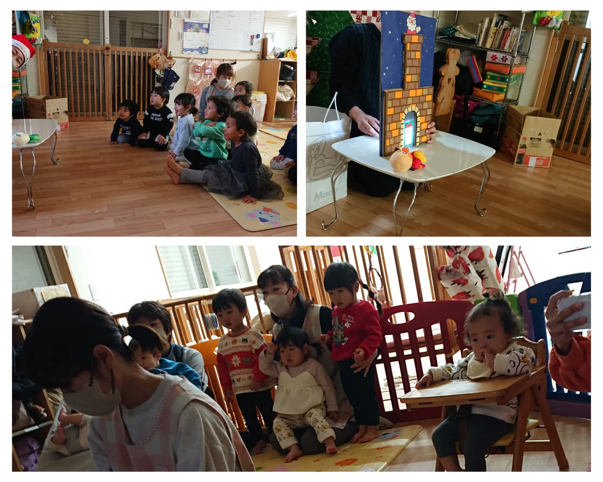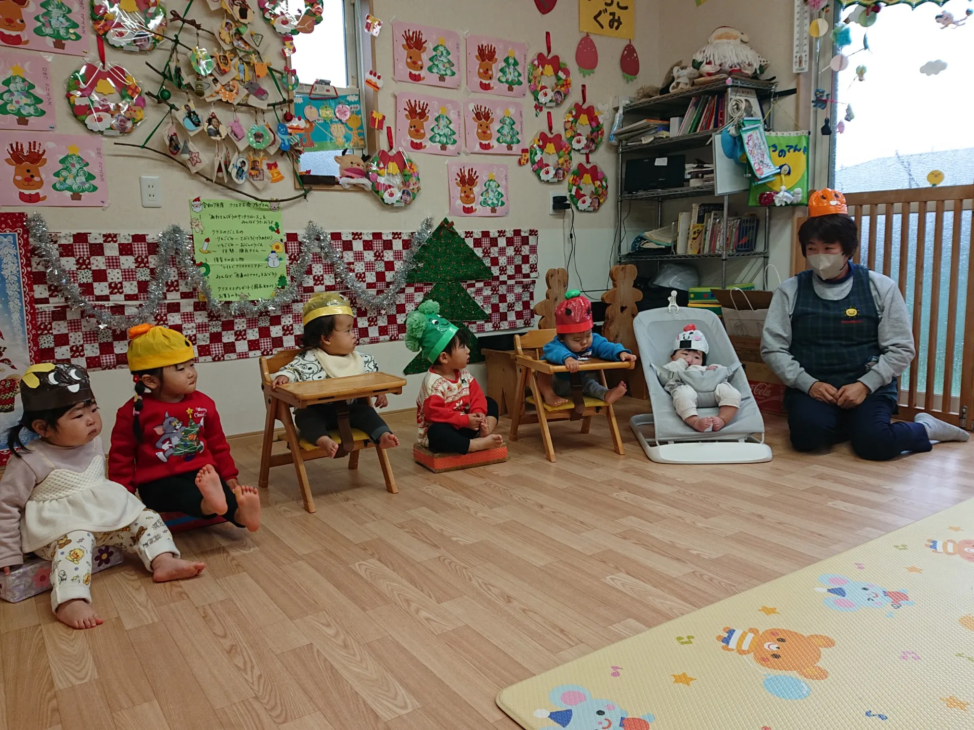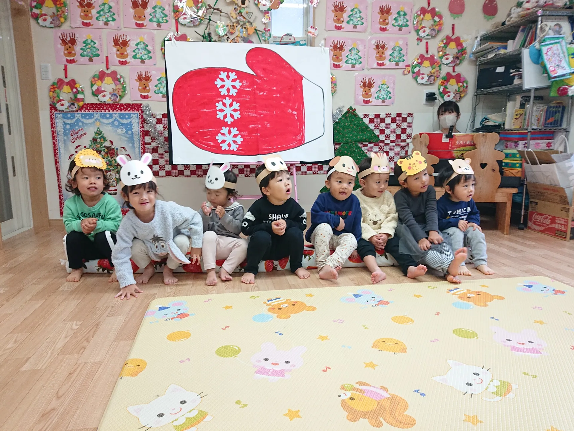 今日は、クリスマスパーティーに参加しました。クラスの出し物では、りんご組さんが「劇遊び(てぶくろ)」、いちご組さんは「おべんとうバスごっこ」を披露してくれました。みんな、とても上手でそして何よりも楽しそうに参加していて、見ているこちらが温かな気持ちになりました♡