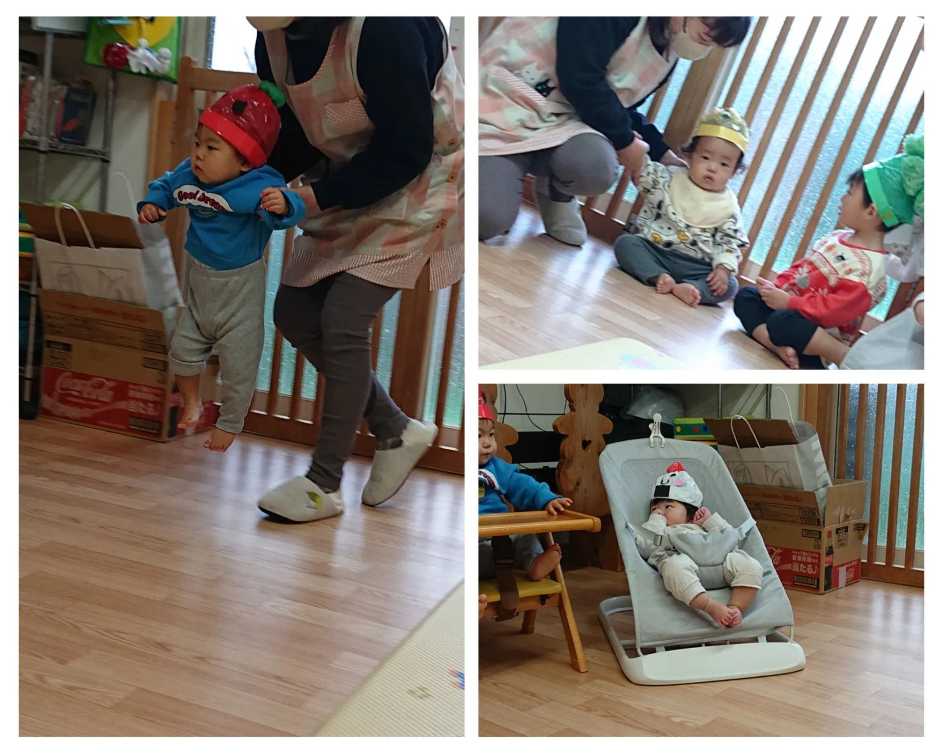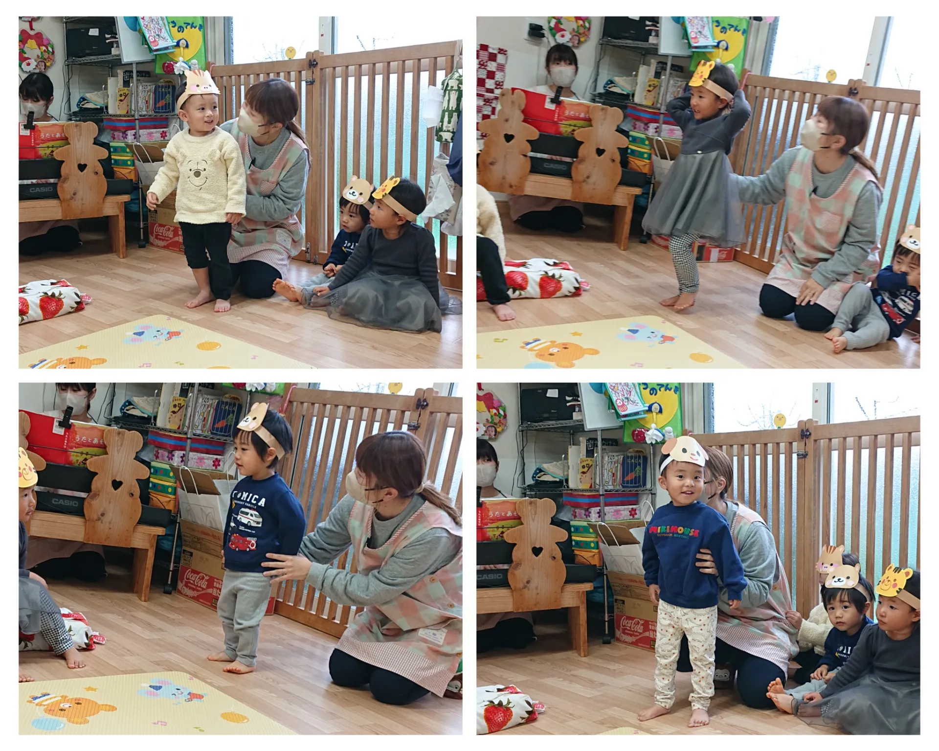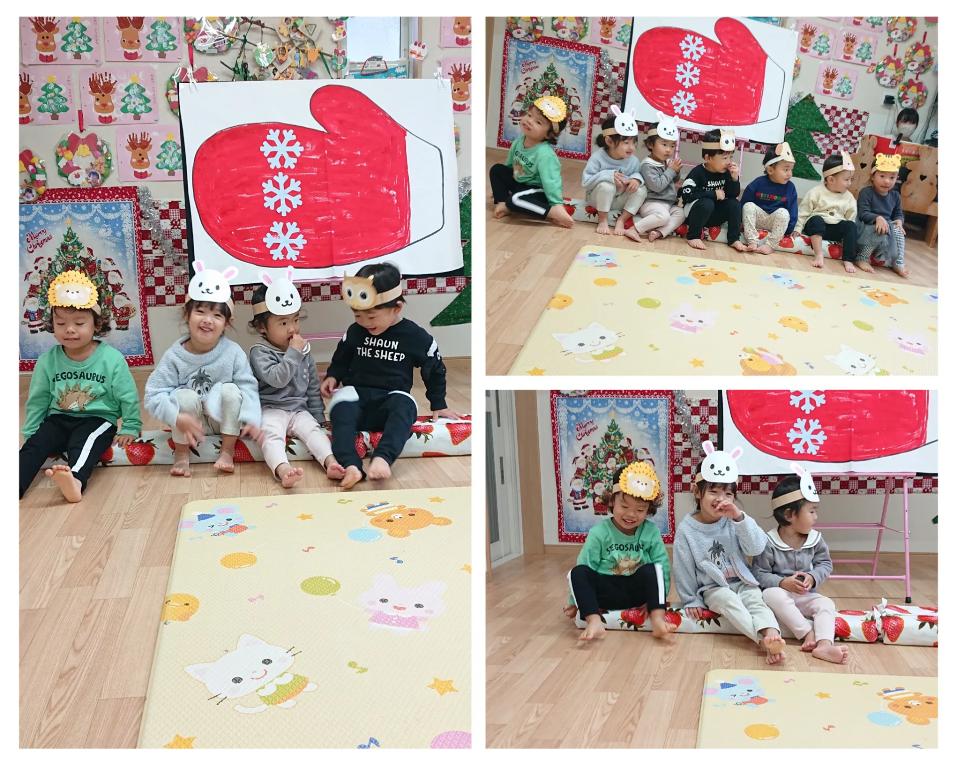 今日は、クリスマスパーティーに参加しました。クラスの出し物では、りんご組さんが「劇遊び(てぶくろ)」、いちご組さんは「おべんとうバスごっこ」を披露してくれました。みんな、とても上手でそして何よりも楽しそうに参加していて、見ているこちらが温かな気持ちになりました♡