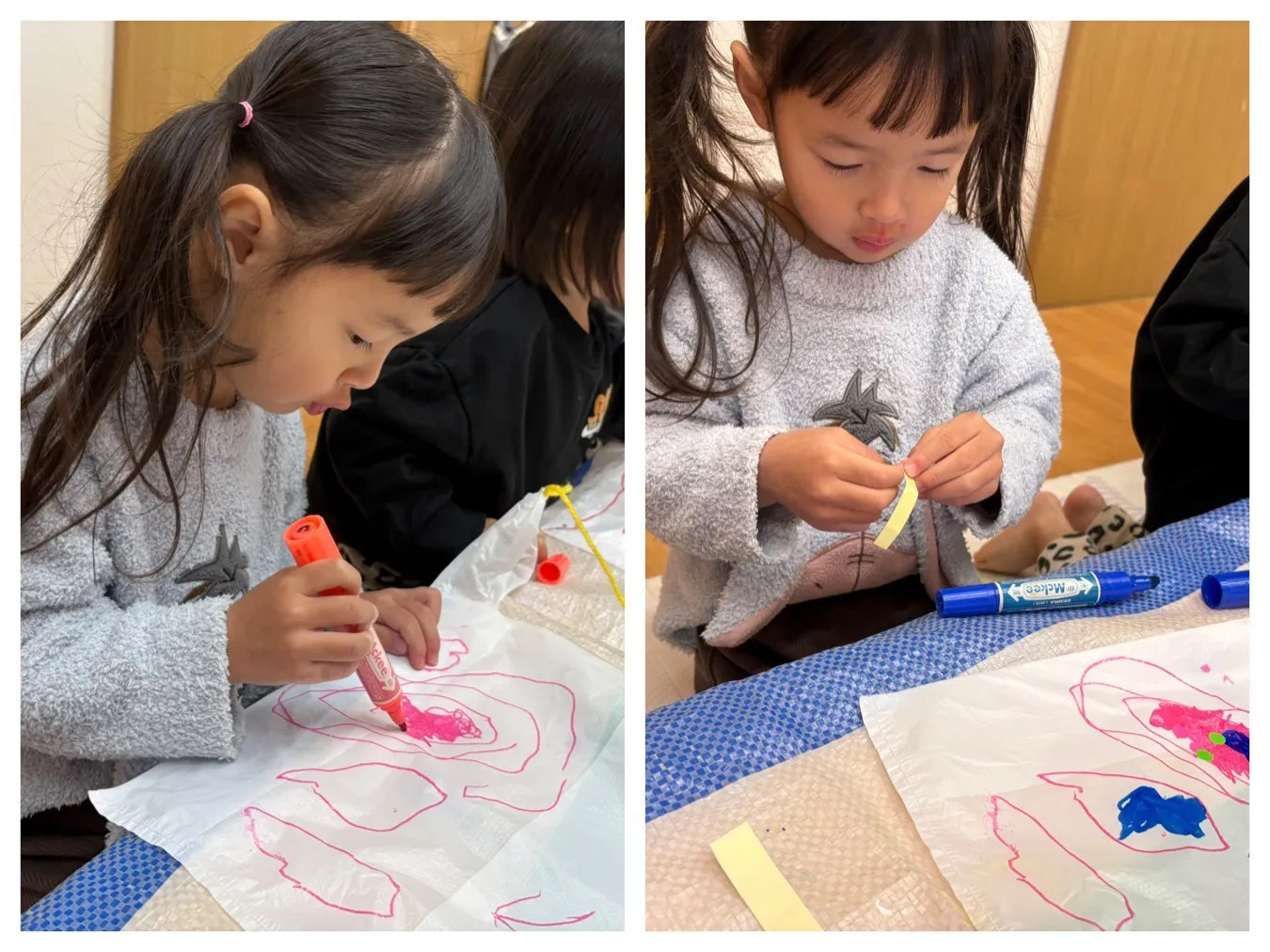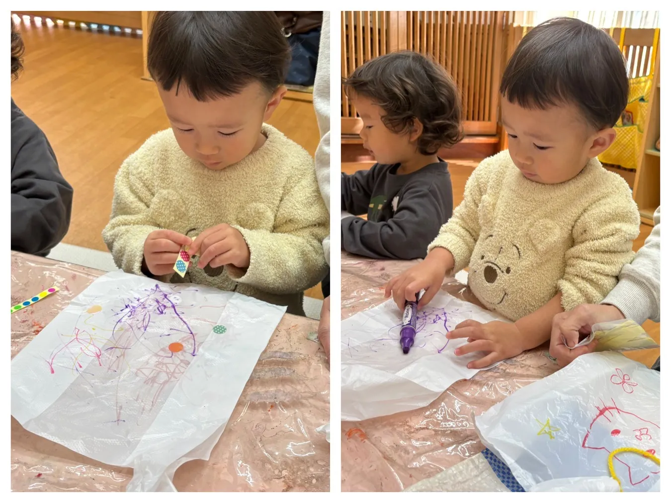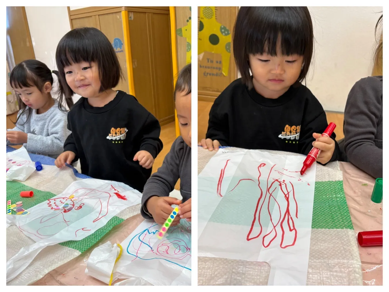 今日は凧作りをしました。ビニール袋にお絵描きをしてみたりシールを貼ってみたり、、みんなの”すき”が詰まった凧が完成しました。凧あげが出来ることが待ち遠しいようです。