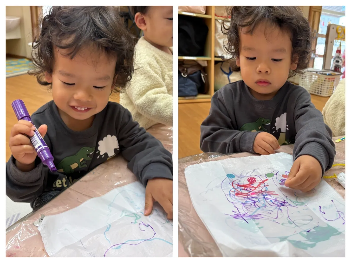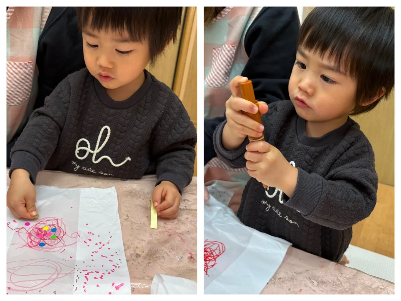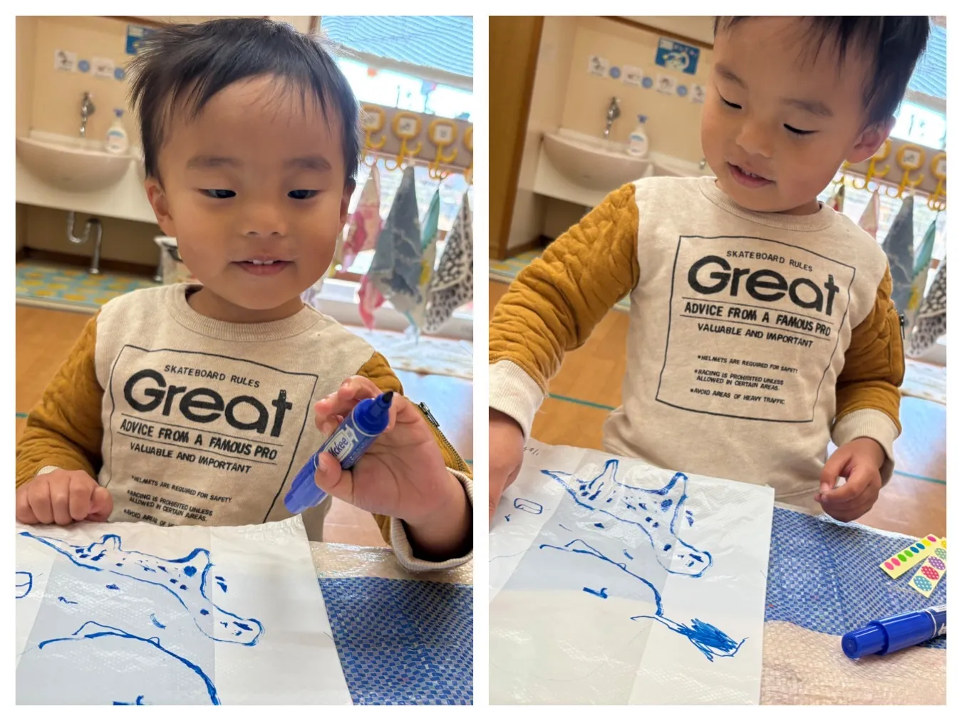 今日は凧作りをしました。ビニール袋にお絵描きをしてみたりシールを貼ってみたり、、みんなの”すき”が詰まった凧が完成しました。凧あげが出来ることが待ち遠しいようです。