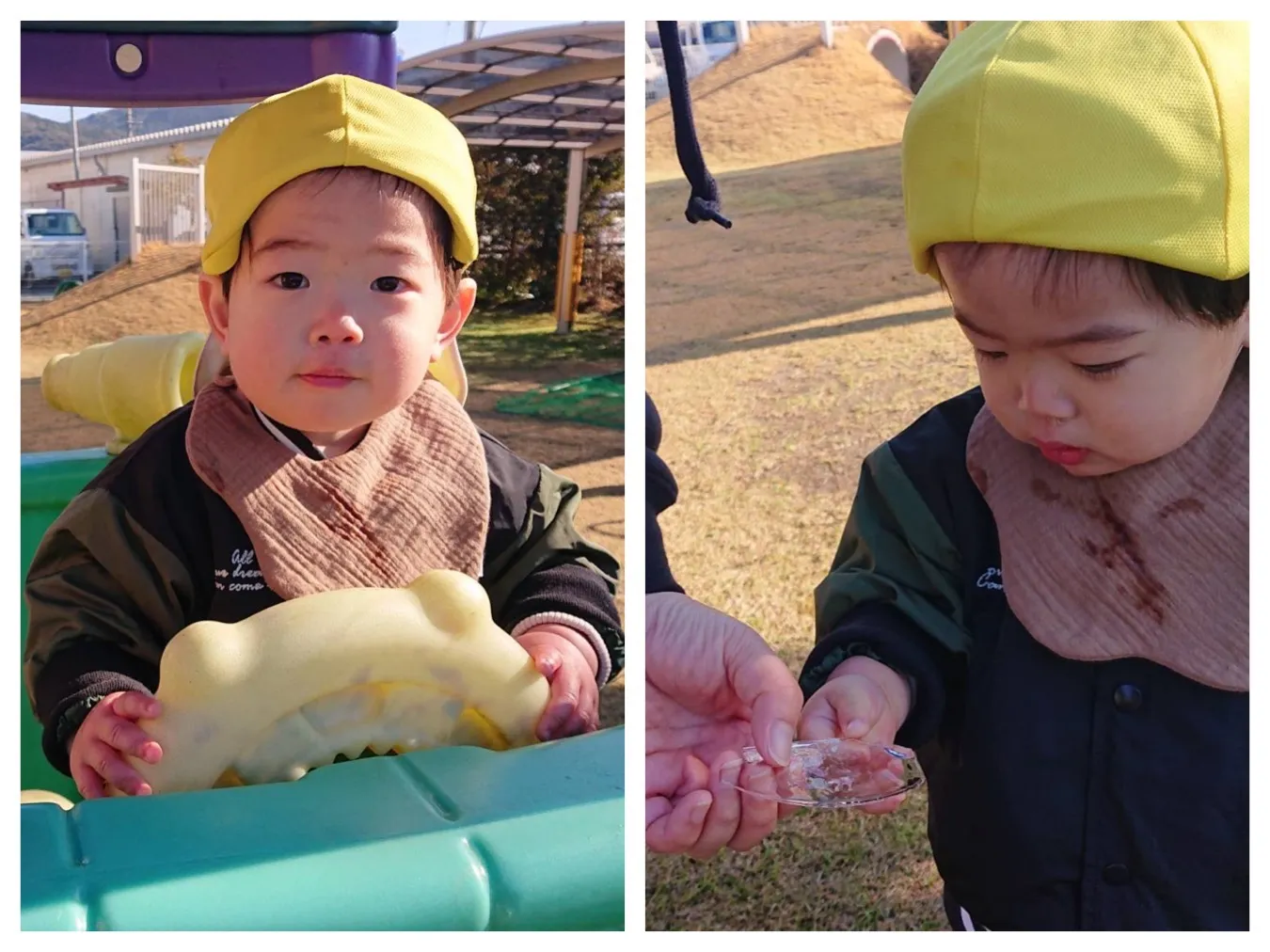 今日は広場遊びを楽しみました。今朝の冷え込みで氷が出来ていたので子ども達と観察してみたり、触って冷たさを感じてみたりして冬を楽しめたようでした。お日様がでるととても暖かく、気持ちが良かったです。