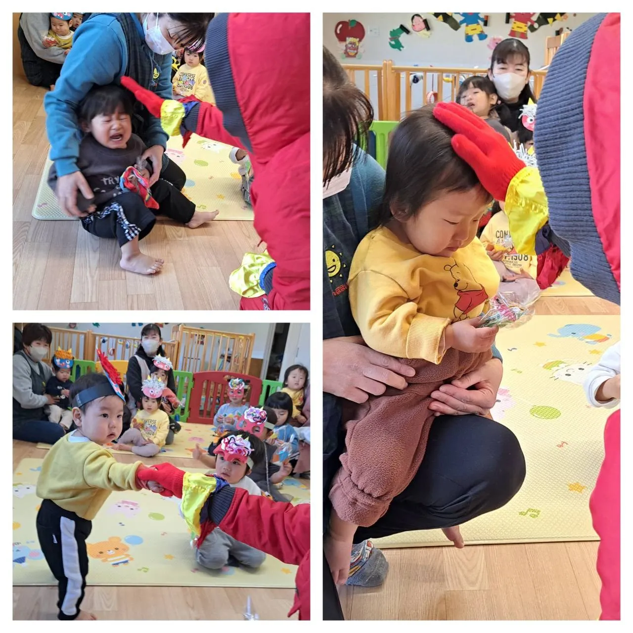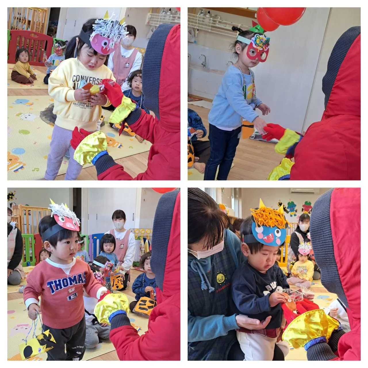 今日は、節分豆まきの日。心の中にいる「泣き虫鬼」「怒りんぼ鬼」「寝ぼすけ鬼」「(食べ物の)好き嫌い鬼」…いろいろな鬼を退治する大切な行事の日。先週、さくらんぼ保育園には鬼さんからお手紙が届いていました。どんな鬼さんが来てくれるかドキドキワクワクしていると、赤鬼さんが遊びに来てくれました。始めは驚いていましたが、鬼さんからの握手やお手紙で仲良しになり、一緒に歌を歌ったりプレゼントをもらったりしました。これで、今年もさくらんぼ保育園のお友だちが元気に健やかに大きくなれそうです。