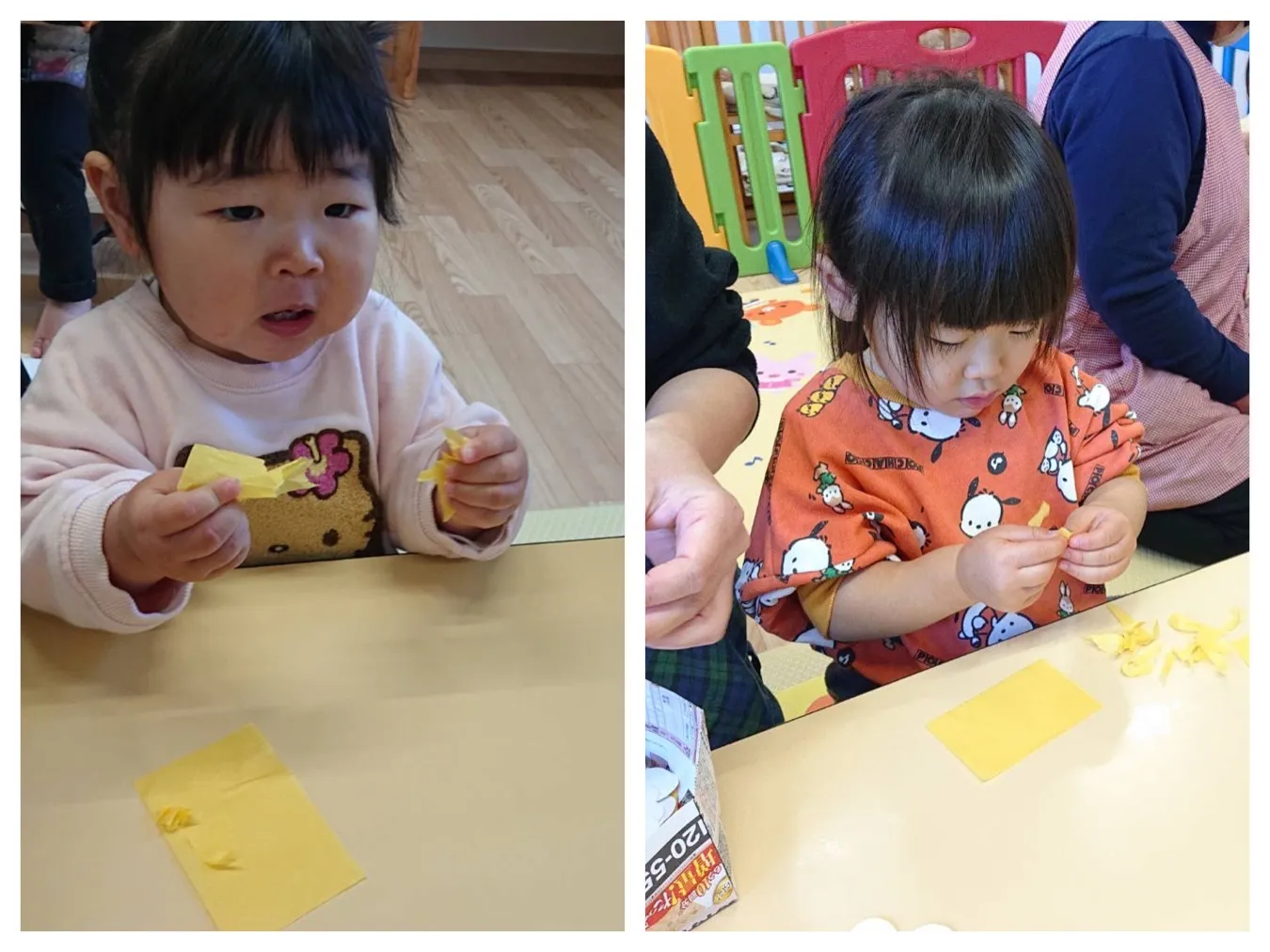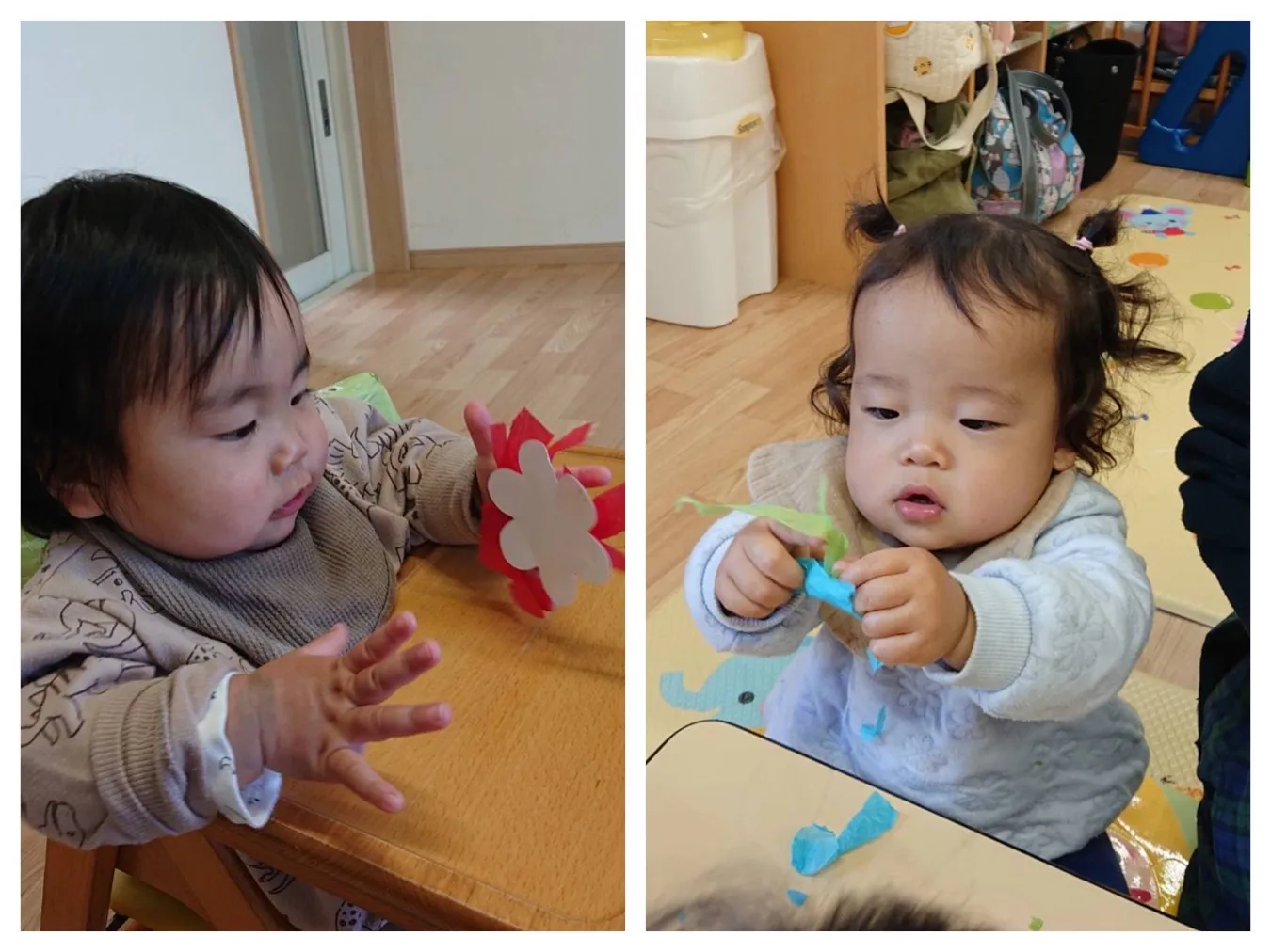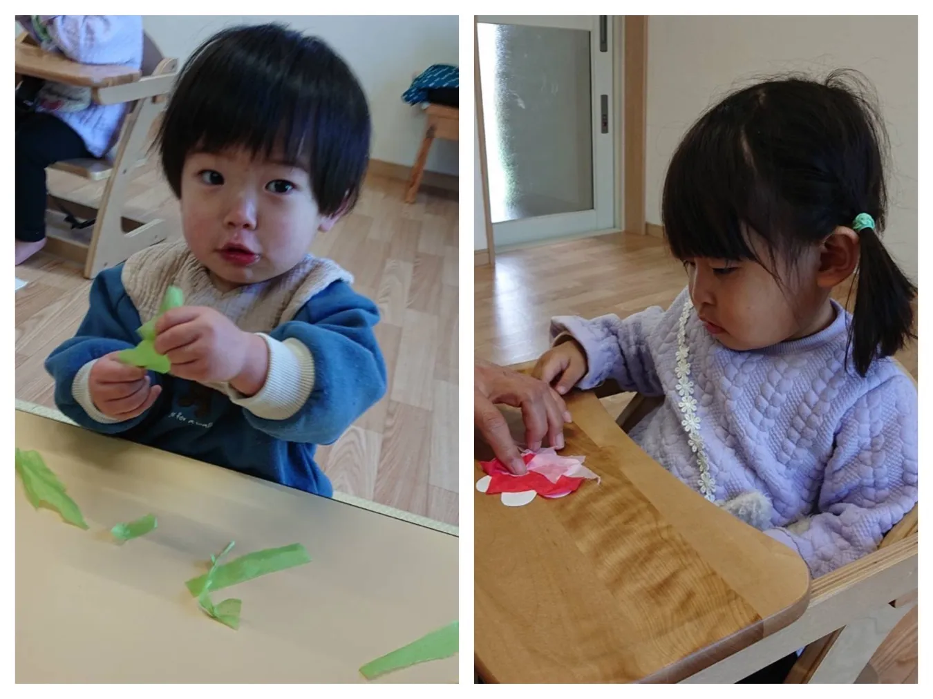 今日は修了式などのお部屋作りのために花紙を使ってカラフルなお花を作りました。いちご組さんが丸めた花紙をお花型の台紙に貼って完成!沢山のお花でお部屋が鮮やかなりそうです!