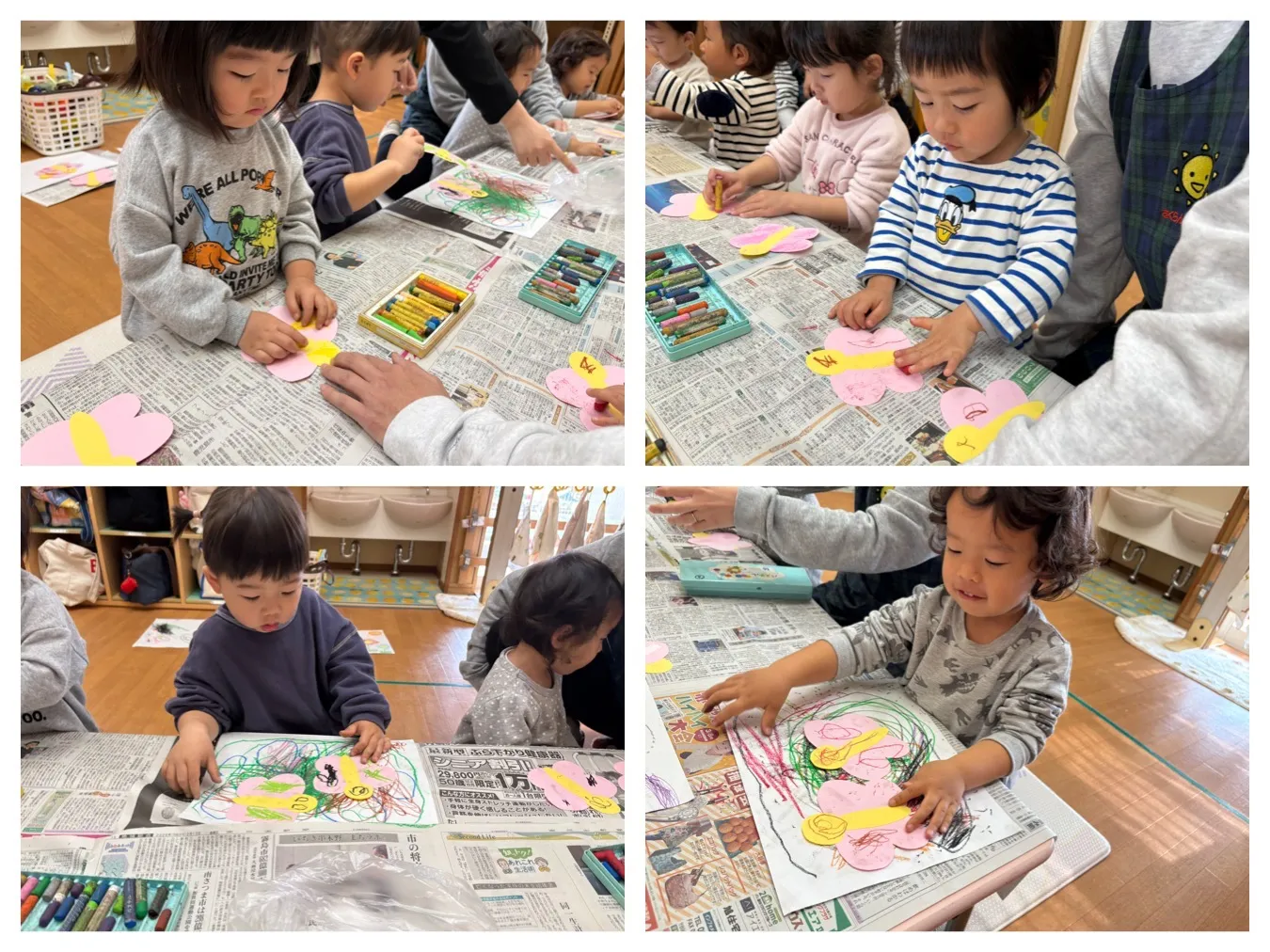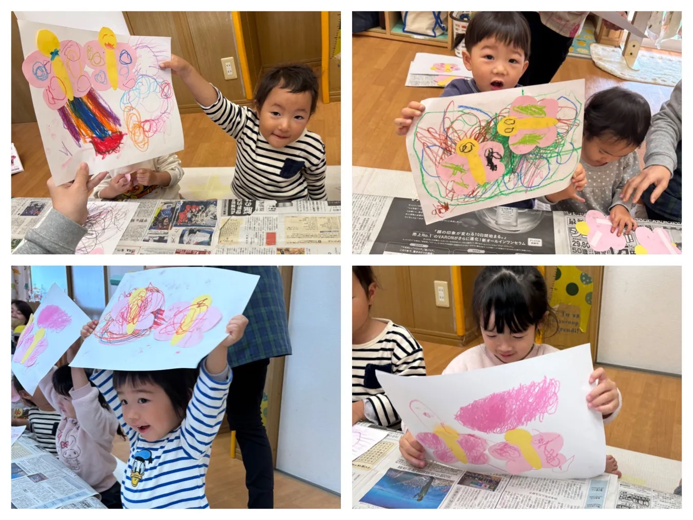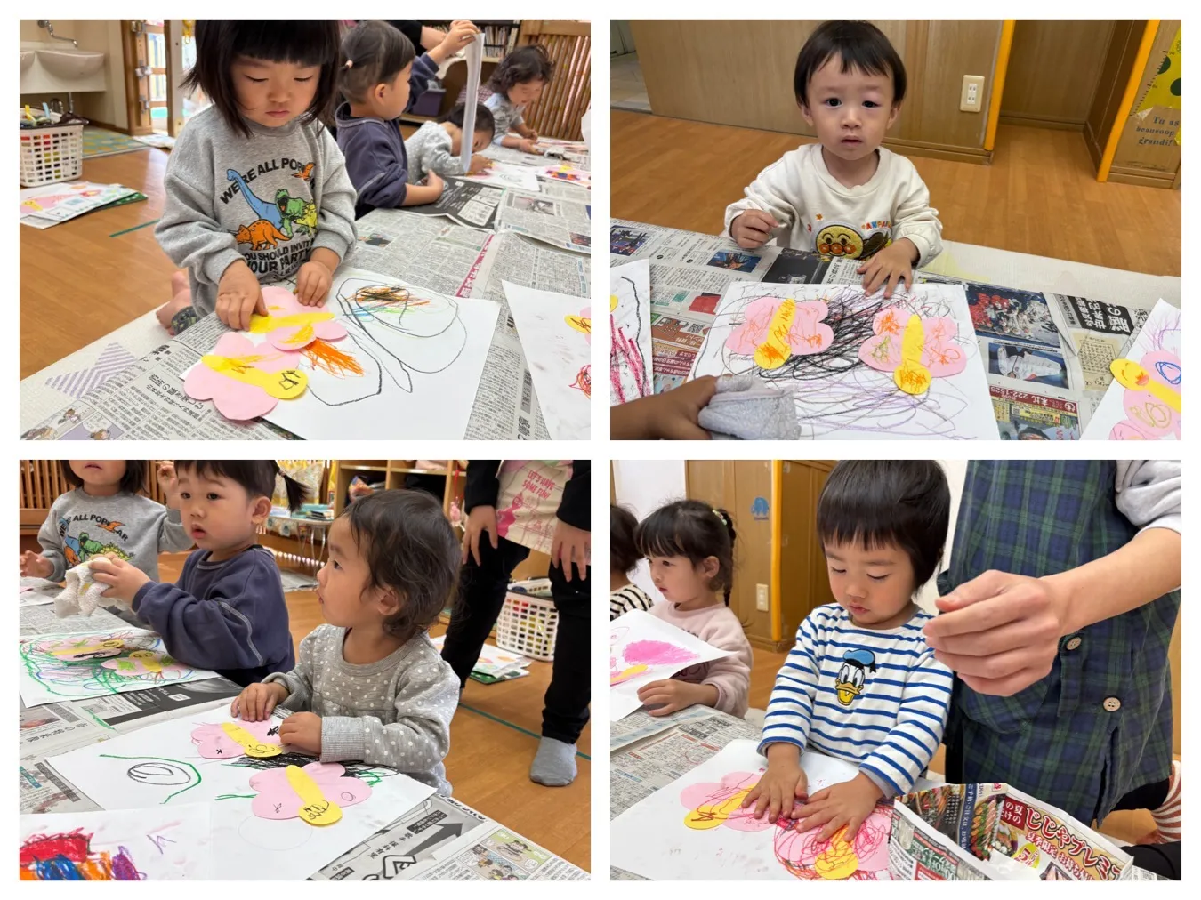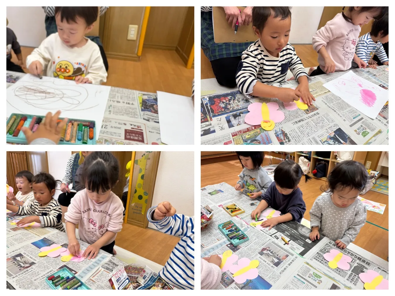 今日は実習生と一緒にちょうちょ作りをしました。ちょうちょに色を塗ったりちょうちょが好きそうなお絵描きを楽しんだりしました。もうすぐ春がくると、ちょうちょさんも遊びに来てくれるので、またみんなで今日の製作を思い出せたらいいなと思います。