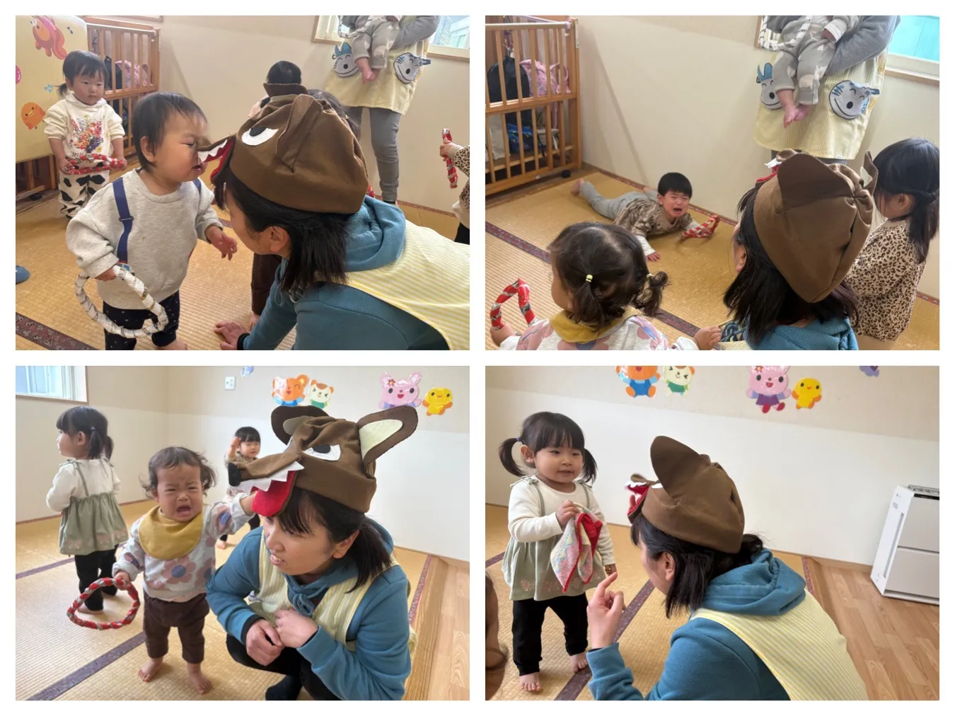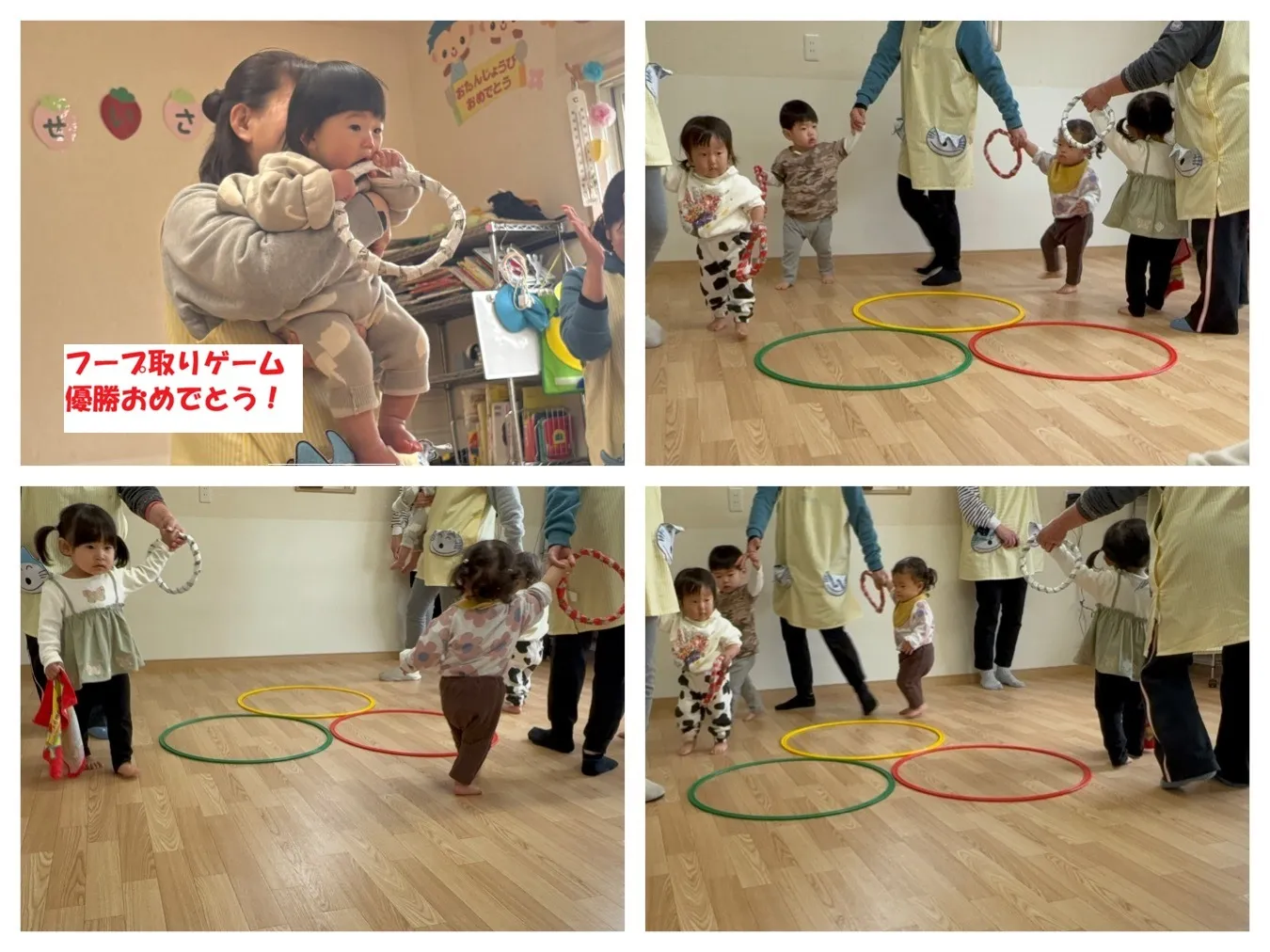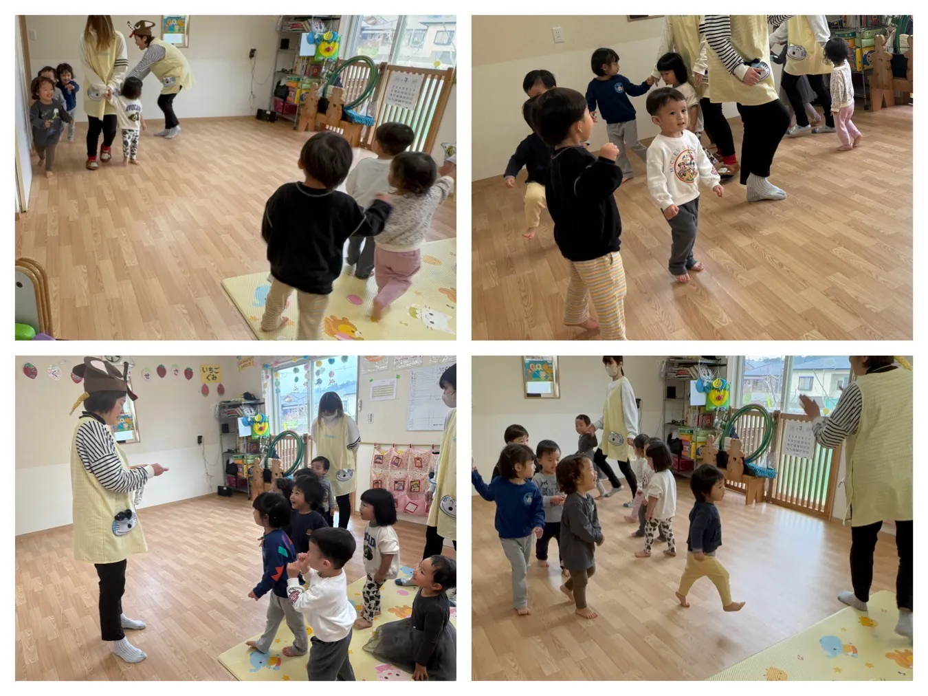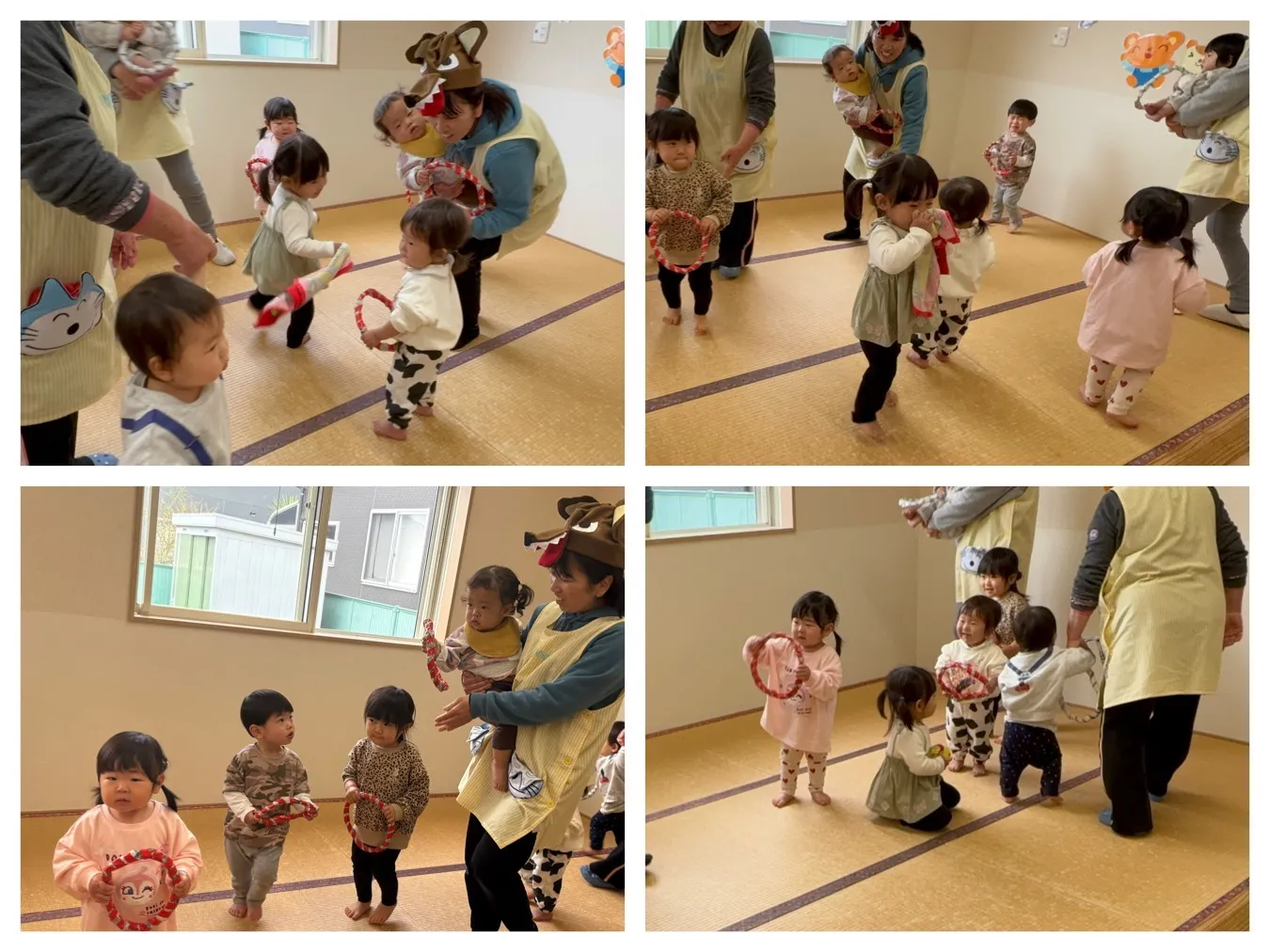 保育園に帰ってからはフープ取りやおおかみさんのゲームをして楽しく過ごし、今年度最後のお弁当はみんな一緒に食べ、素敵で美味しそうなお弁当がいっぱいで、子どもたちの幸せな顔が見られてとても嬉しかったです。保護者の皆様、毎月のお弁当作りにご協力いただき本当にありがとうございました。