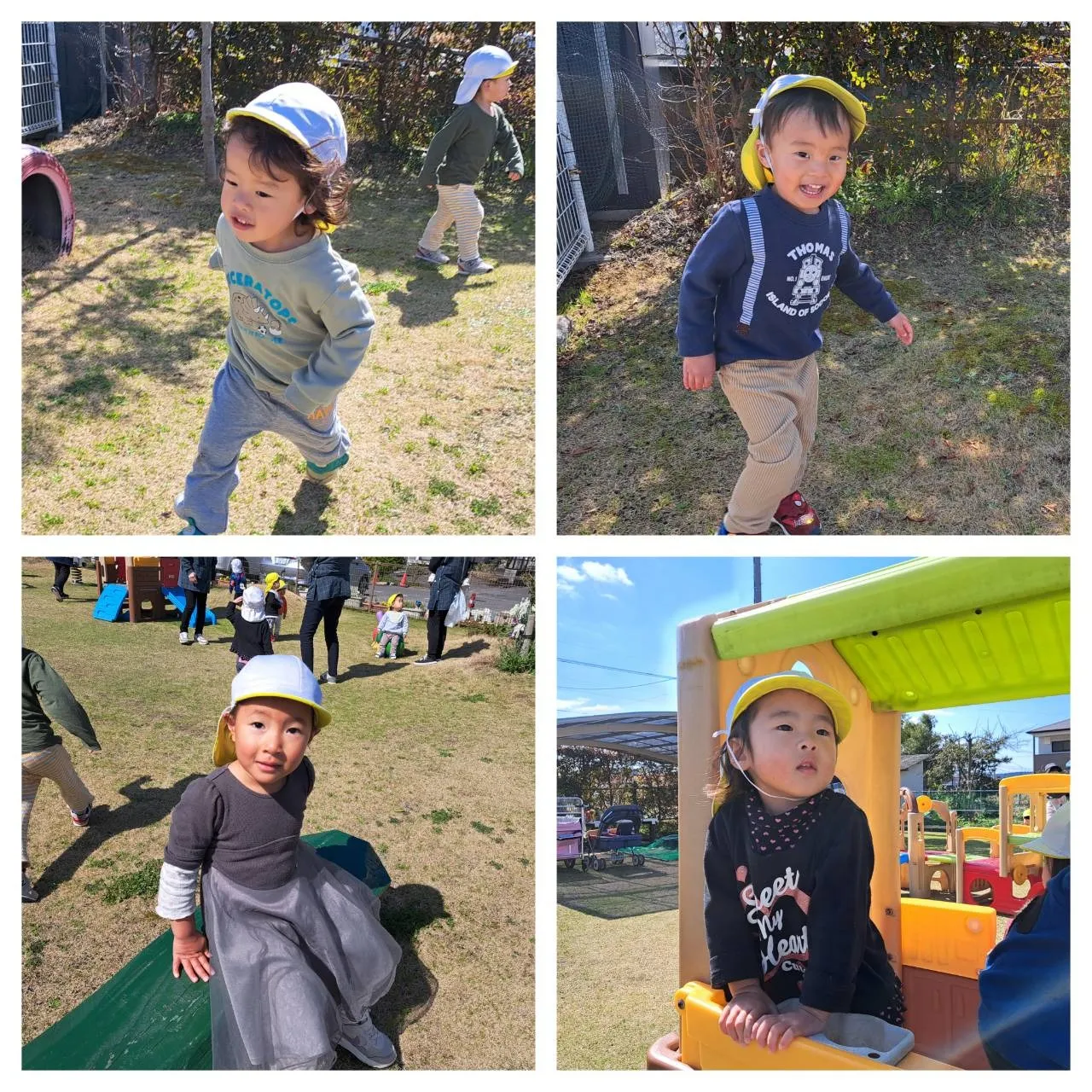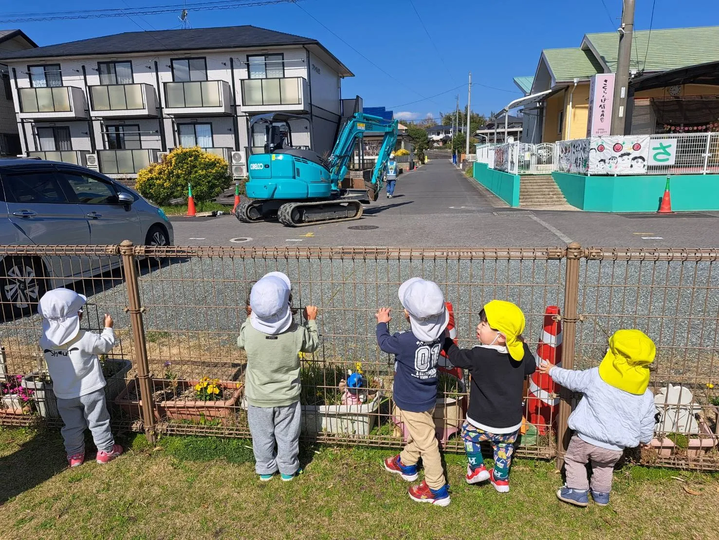 今日は初めて修了式の合同練習をしました。椅子の立ち座りの練習やお辞儀の練習など、短い時間でしたが、みんなとても集中して参加できていました。その後は、広場で伸び伸びと体を動かして遊びました。ショベルカーが通り、働く車を近くで見ることもできました。