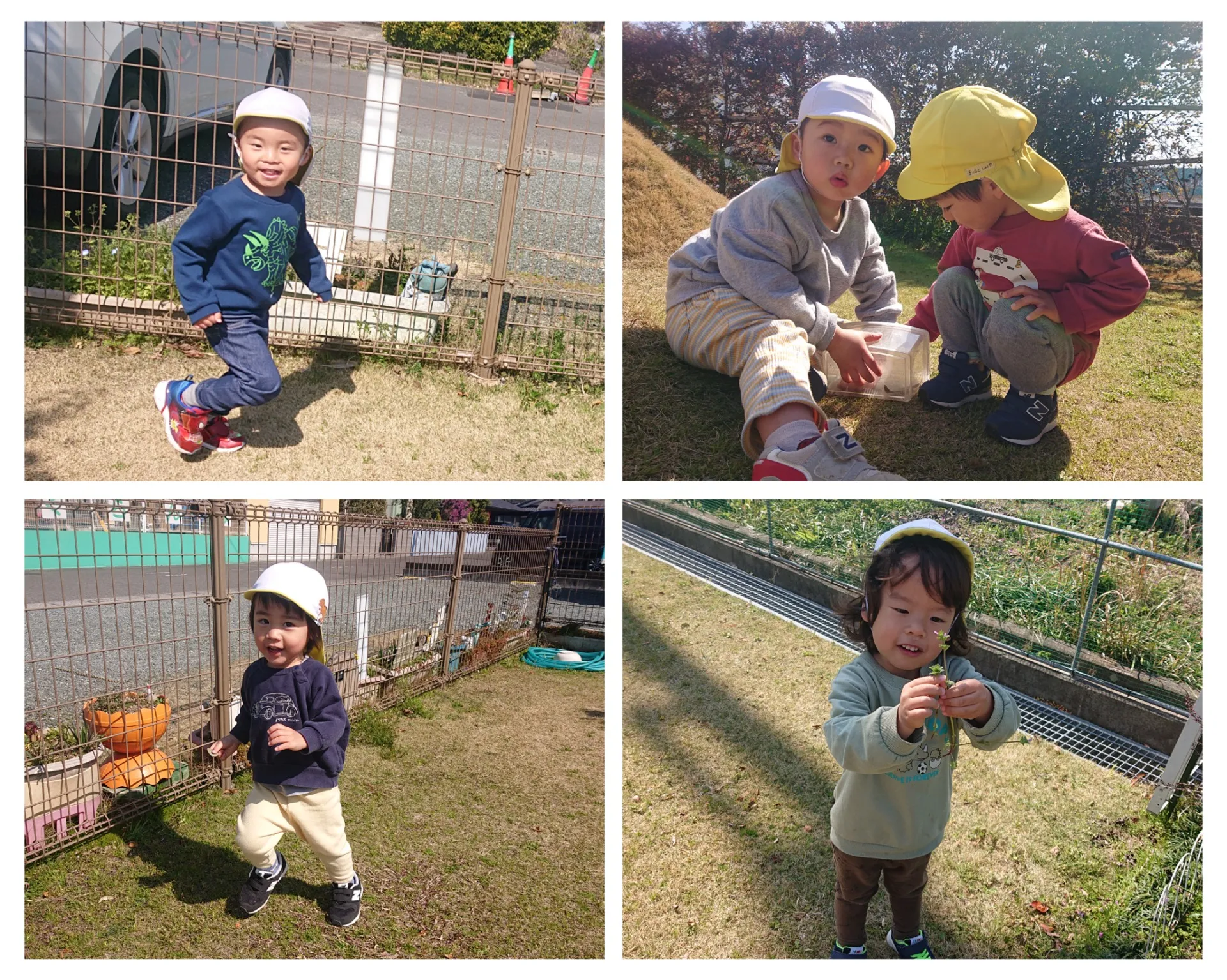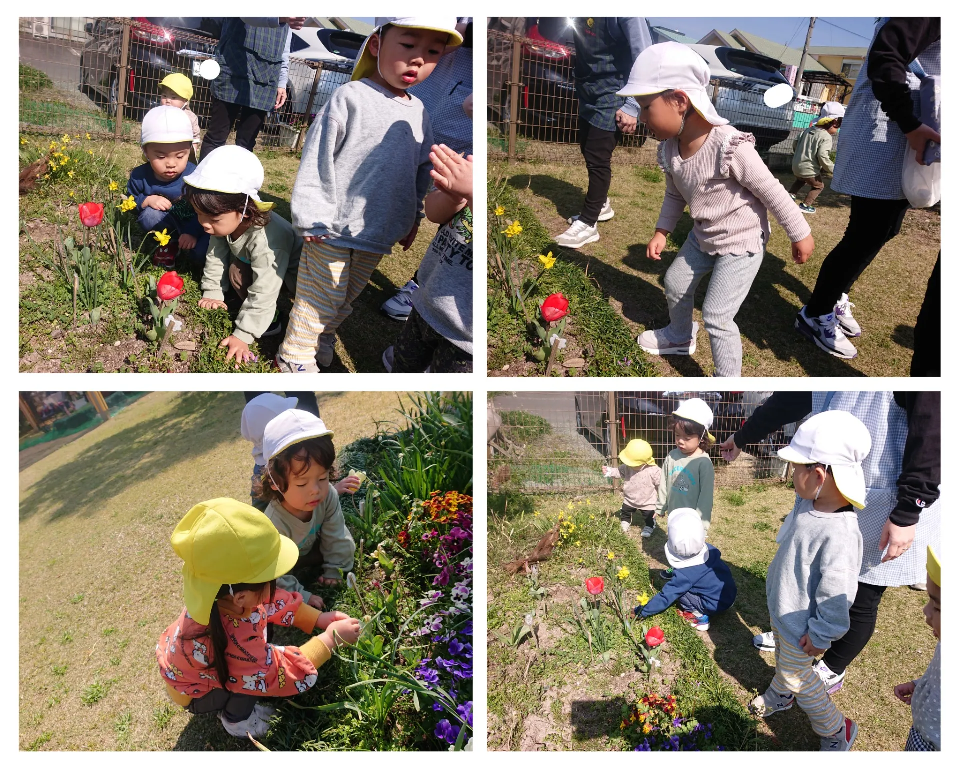 今日は、修了式の練習後に広場で遊びました。ちょうちょうがたくんさん飛んでいて追いかけたり、花壇に咲いたチューリップが花を咲かせていて喜んだりと、春を満喫している子供たちでした♪