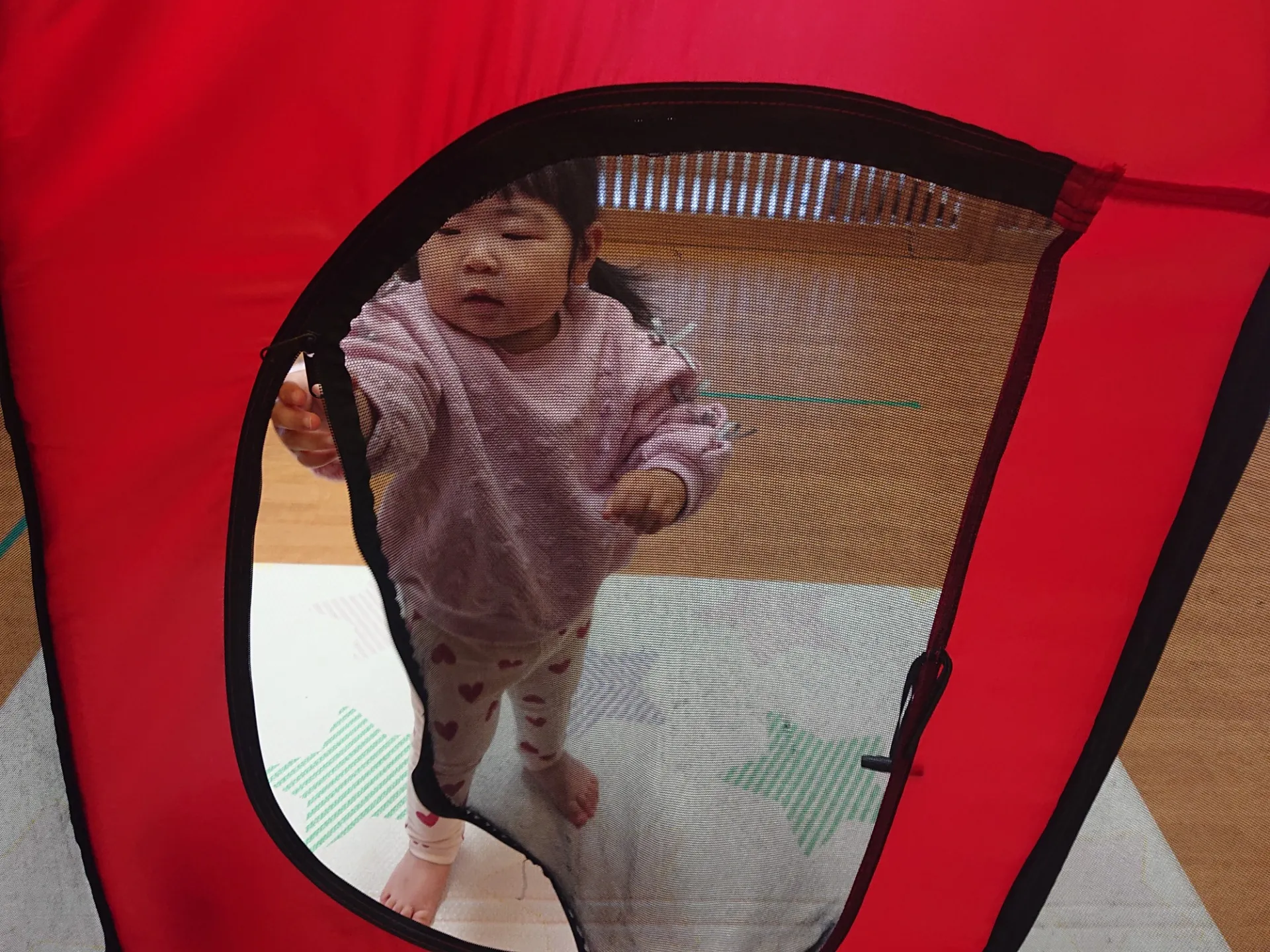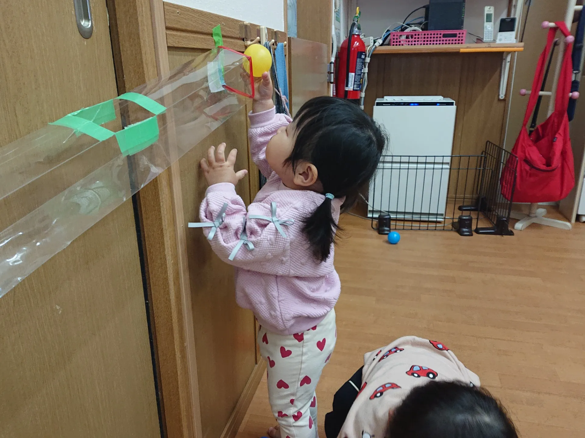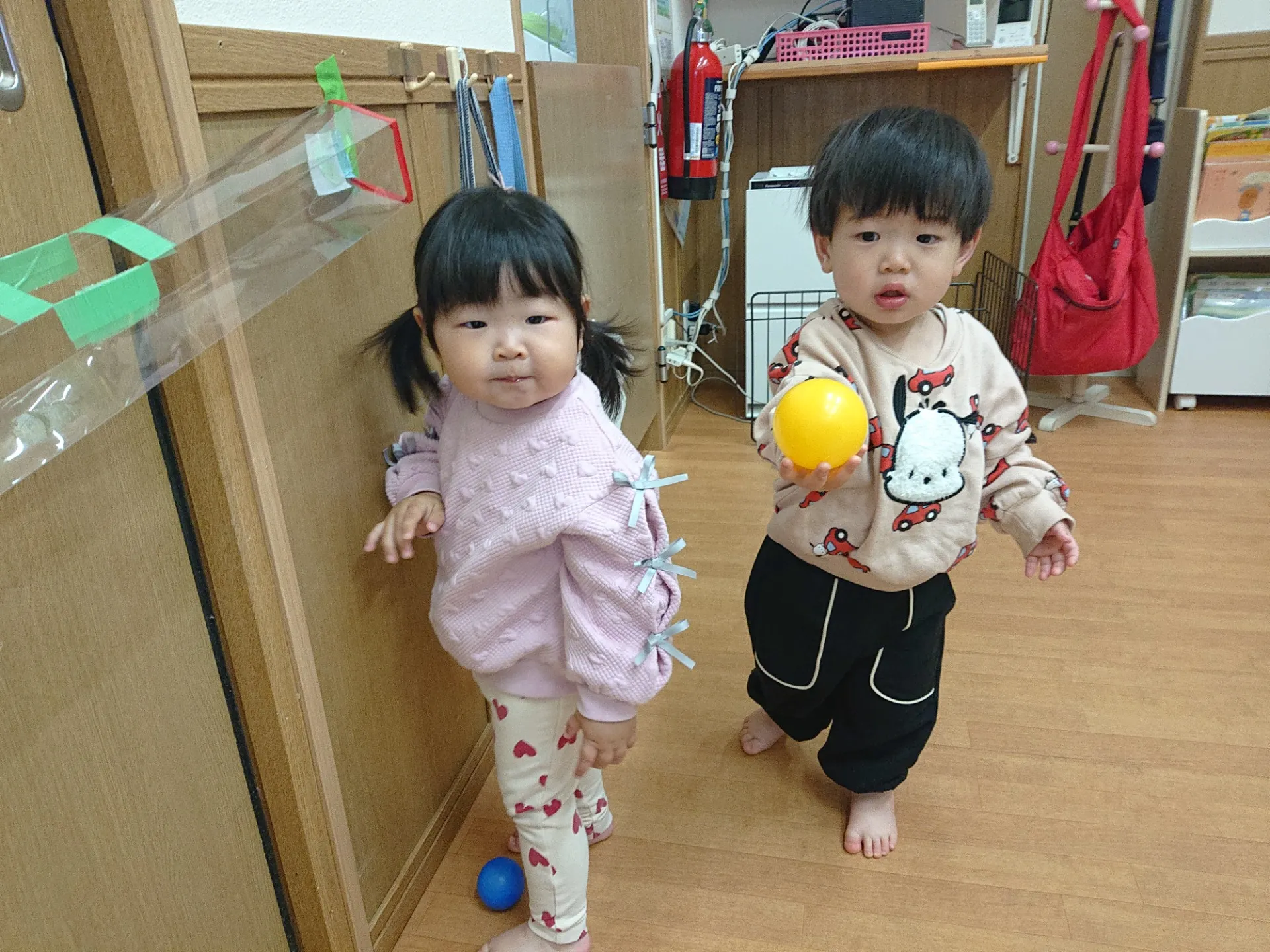 今日は、お部屋でボールプールを出して遊びました。ボールプールの中と外からお友達の名前を呼びあってみたり、仲良く透明の筒にボールを入れて転がしたりと楽しそうな子ども達でした♪