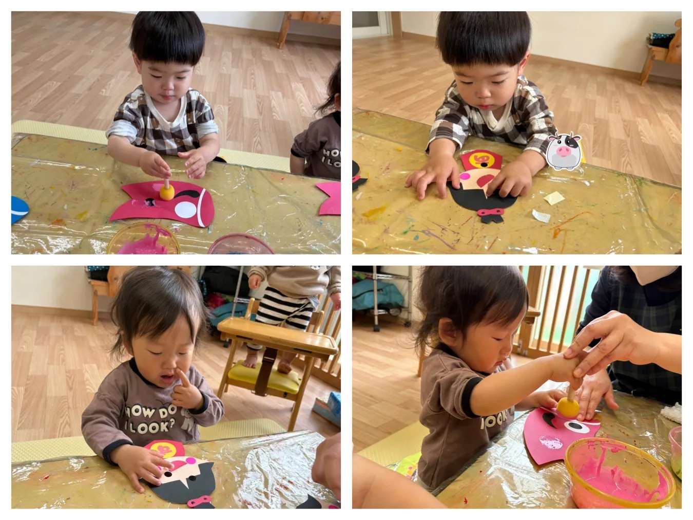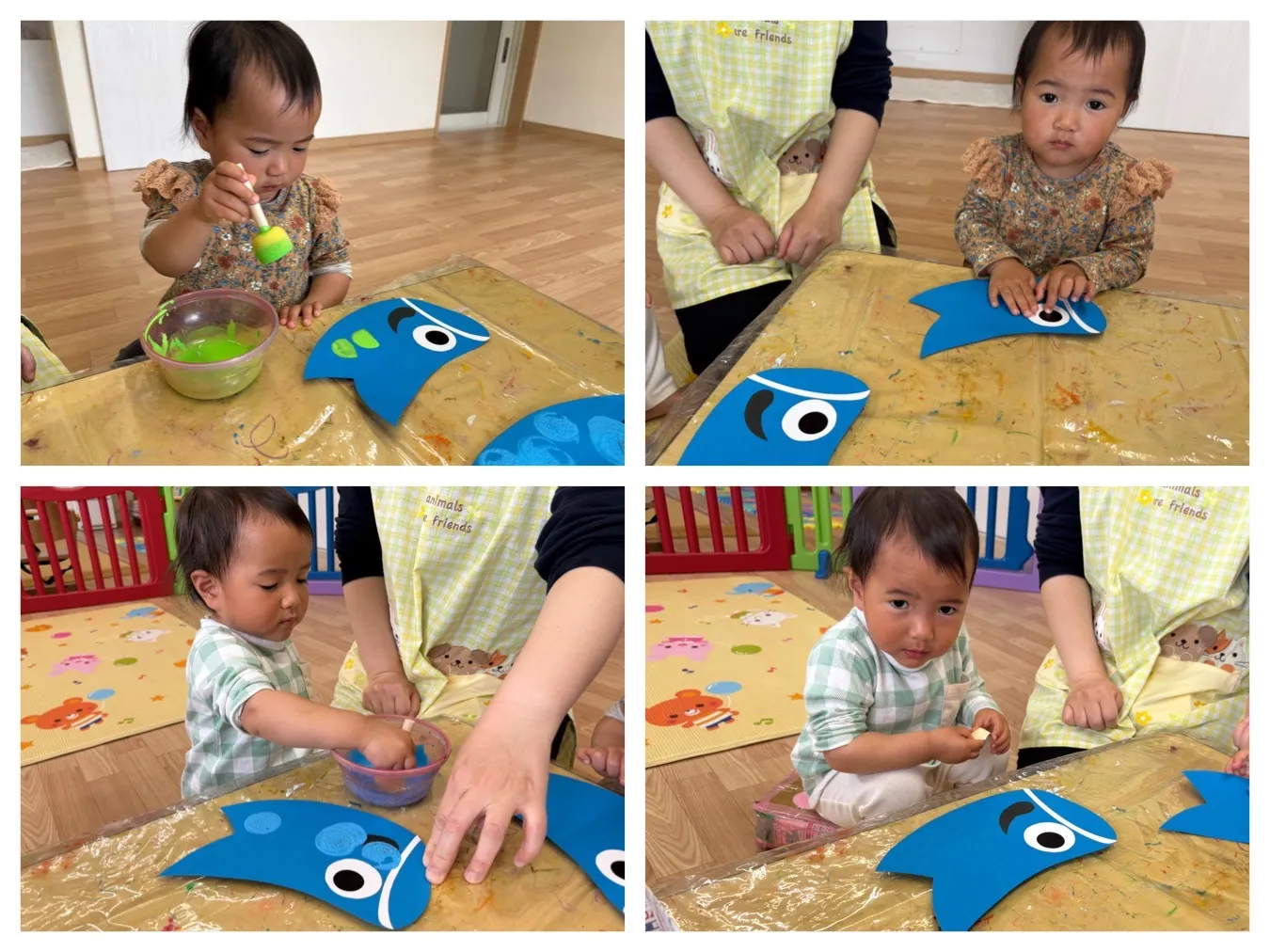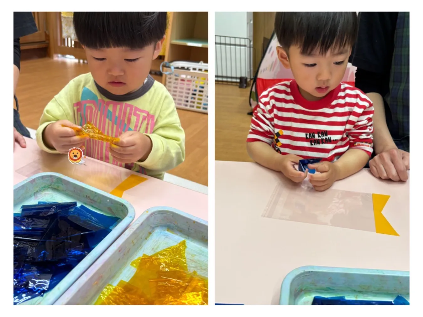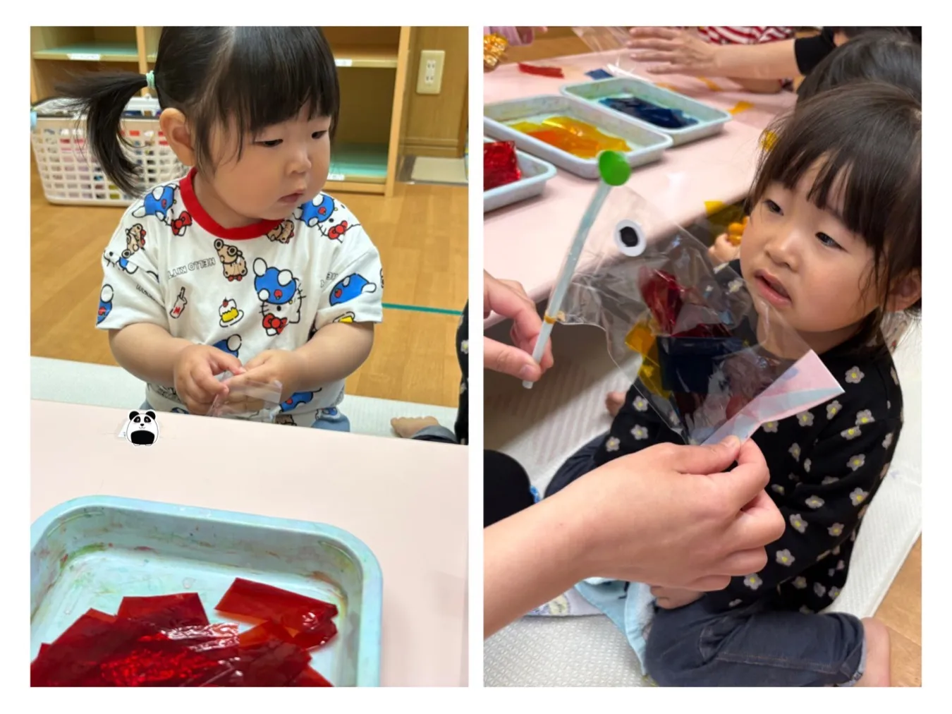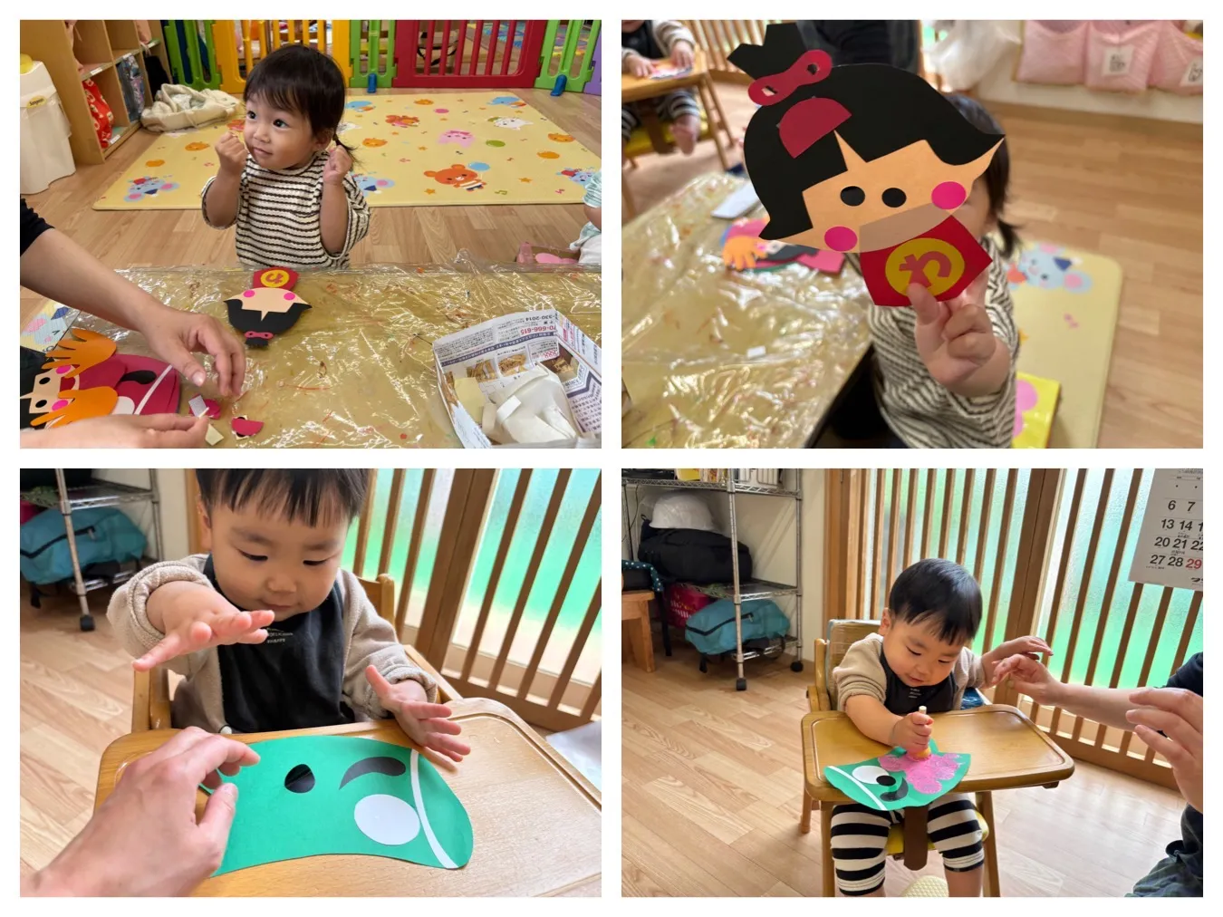 今日は5月の製作をしました。こいのぼりや金太郎に目を貼ったり模様を描いてかわいいカラフルな作品が出来ました。